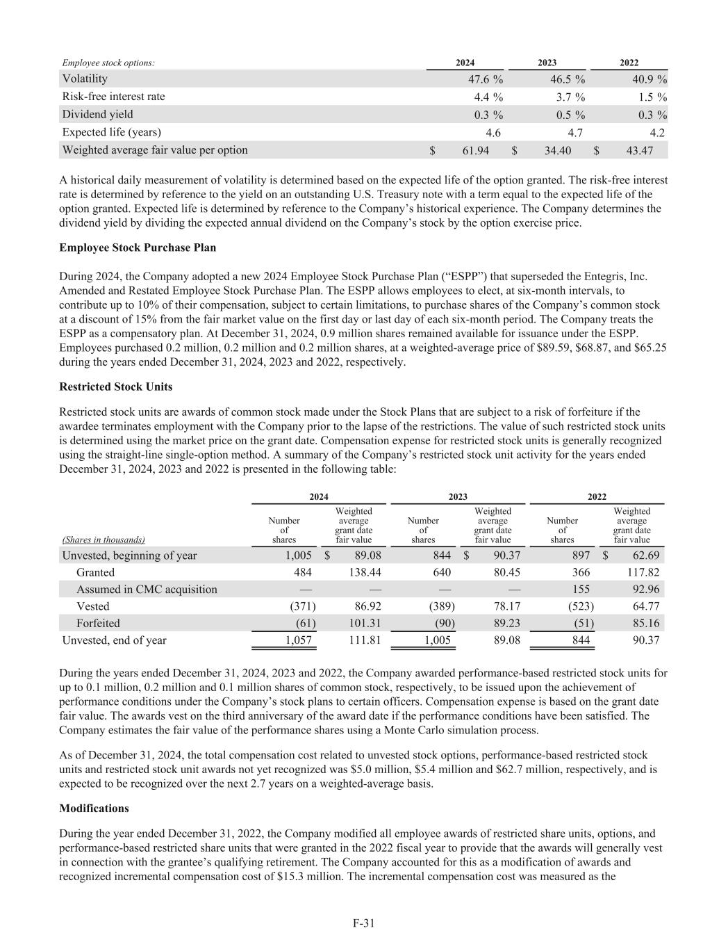 员工股票期权:202420232022波动率47.6% 46.5% 40.9%无风险利率4.4% 3.7% 1.5%股息收益率0.3% 0.5% 0.3%预期寿命(年)4.6 4.7 4.2每份期权的加权平均公允价值$ 61.94 $ 34.40 $ 43.47历史上每日的波动率计量是根据授予期权的预期寿命确定的。无风险利率是通过参考期限等于所授予期权的预期期限的未偿还美国国债的收益率确定的。预期寿命参照公司历史经验确定。公司通过将公司股票的预期年度股息除以期权行权价格确定股息收益率。2024年期间的员工股票购买计划,公司采用了新的2024年员工股票购买计划(“ESPP”),该计划取代了Entegris, Inc.修订和重述的员工股票购买计划。ESPP允许员工选择每隔六个月,在一定限制的情况下,最多贡献其薪酬的10%,以每六个月期间的第一天或最后一天的公平市场价值的15%的折扣购买公司普通股的股份。公司将ESPP视为补偿性方案。截至2024年12月31日,根据ESPP仍有90万股可供发行。截至2024年12月31日、2023年和2022年12月31日止年度,员工分别以89.59美元、68.87美元和65.25美元的加权平均价格购买了0.2百万股、0.2百万股和0.2百万股。限制性股票单位限制性股票单位是根据股票计划作出的普通股奖励,如果受奖人在限制失效之前终止与公司的雇佣关系,则可能会被没收。该等限制性股票单位的价值采用授予日的市场价格确定。限制性股票单位的补偿费用一般采用直线单期权法确认。截至2024年12月31日、2023年和2022年12月31日止年度公司限制性股票单位活动汇总如下表所示:202420232022(单位:千股)股份数量加权平均授予日公允价值股份数量加权平均授予日公允价值股份数量加权平均授予日公允价值股份数量加权平均授予日公允价值未归属,年初1,005 $ 89.08844 $ 90.37897 $ 62.69授出484138.4464080.45366117.82假设在CMC收购———— 15592.96既得(371)86.92(389)78.17(523)64.77没收(61)101.31(90)89.23(51)85.16未归属,年末1,057111.81,00589.0884490.37截至2024年12月31日、2023年和2022年12月31日止年度,公司分别授予最多为10万股、20万股和10万股普通股的基于业绩的限制性股票单位,将在公司股票计划下的业绩条件达到时向某些高级职员发行。补偿费用以授予日公允价值为基础。如业绩条件已获满足,奖励将于授予日第三周年归属。该公司使用蒙特卡洛模拟过程估计业绩份额的公允价值。截至2024年12月31日,与未归属股票期权、基于业绩的限制性股票单位和尚未确认的限制性股票单位奖励相关的总补偿成本分别为500万美元、540万美元和6270万美元,预计将在未来2.7年按加权平均基础确认。修改截至2022年12月31日止年度,公司修改了在2022财年授予的限制性股票单位、期权和基于业绩的限制性股票单位的所有员工奖励,以规定奖励一般将与承授人的合格退休相关。该公司将此视为对裁决的修改,并确认了1530万美元的增量补偿成本。增量补偿成本测算为F-31