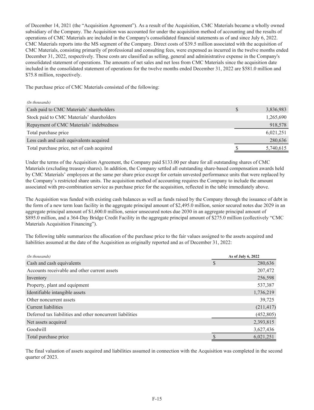 2021年12月14日的公告(“收购协议”)。由于收购事项,CMC Materials成为公司的全资附属公司。此次收购按收购会计法入账,而CMC Materials的经营业绩包含在公司截至2022年7月6日及自2022年7月6日的合并财务报表中。CMC Materials报道进入MS部门的公司。与收购CMC Materials相关的直接成本3950万美元,主要包括专业费用和咨询费用,分别在截至2022年12月31日的十二个月内计入费用。这些成本在公司的综合经营报表中被归类为销售、一般和管理费用。截至2022年12月31日止十二个月的综合运营报表中包含的自收购日期以来来自CMC Materials的净销售额和净亏损金额分别为5.8 10亿美元和75.8百万美元。CMC Materials的购买价格包括:(单位:千)支付给CMC Materials股东的现金3836983美元股票支付给CMC Materials的股东1265690偿还CMC Materials的债务918,578购买总价6,021,251减去所收购的现金及现金等价物280,636购买总价,扣除根据收购协议条款获得的现金5,740,615美元,公司为TERM4的所有流通股(不包括库存股)支付每股133.00美元。此外,公司还以相同的每股价格结算了CMC Materials员工持有的除某些未归属的业绩单位已被公司的受限制股份单位取代外的所有未归属的股份补偿奖励。收购会计法要求公司将与合并前服务相关的金额作为收购的购买价格,反映在上表中。此次收购的资金来自现有现金余额以及公司通过发行本金总额为24.950亿美元的新定期贷款融资、本金总额为16.00亿美元的2029年到期的优先有担保票据、本金总额为8.950亿美元的2030年到期的优先无担保票据以及本金总额为2.750亿美元的364天过桥信贷融资(统称“CMC Materials收购融资”)形式的债务筹集的资金。下表汇总了按最初报告和截至2022年12月31日在收购之日分配给所收购资产和承担的负债的公允价值的购买价格分配情况:(单位:千)截至2022年7月6日现金和现金等价物280,636美元应收账款和其他流动资产207,472存货256,598财产,厂房和设备537,387可辨认无形资产1,736,219其他非流动资产39,725流动负债(211,417)递延所得税负债和其他非流动负债(452,805)取得的净资产2,393,815商誉3,627,436购买总价6,021,251美元与收购相关的所收购资产和承担的负债的最终估值已于2023年第二季度完成。F-15