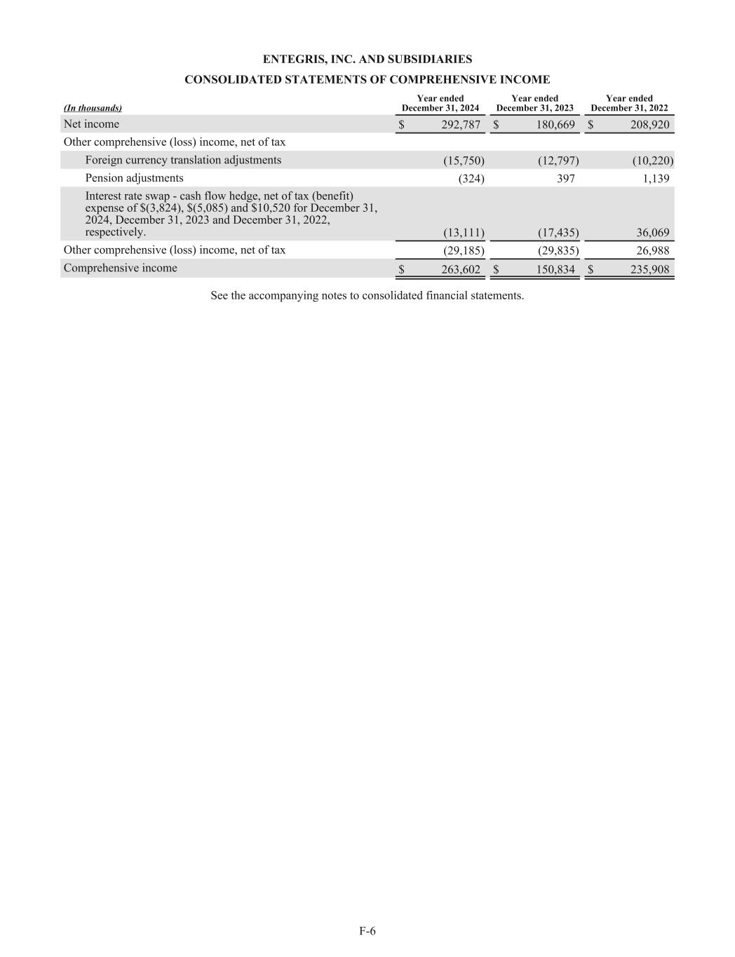 Entegris, Inc.及附属公司综合收益报表(千)截至2024年12月31日止年度截至2023年12月31日止年度净收益$ 292,787 $ 180,669 $ 208,920其他综合(亏损)收入,税后净额外币换算调整数(15,750)(12,797)(10,220)养老金调整数(324)3971,139利率掉期-现金流量套期保值,税后(利益)费用净额分别为2024年12月31日、2023年12月31日和2022年12月31日(3,824)、(5,085)和10,520美元。(13,111)(17,435)36,069其他综合(亏损)收益,税后净额(29,185)(29,835)26,988综合收益$ 263,602 $ 150,834 $ 235,908见所附综合财务报表附注。F-6