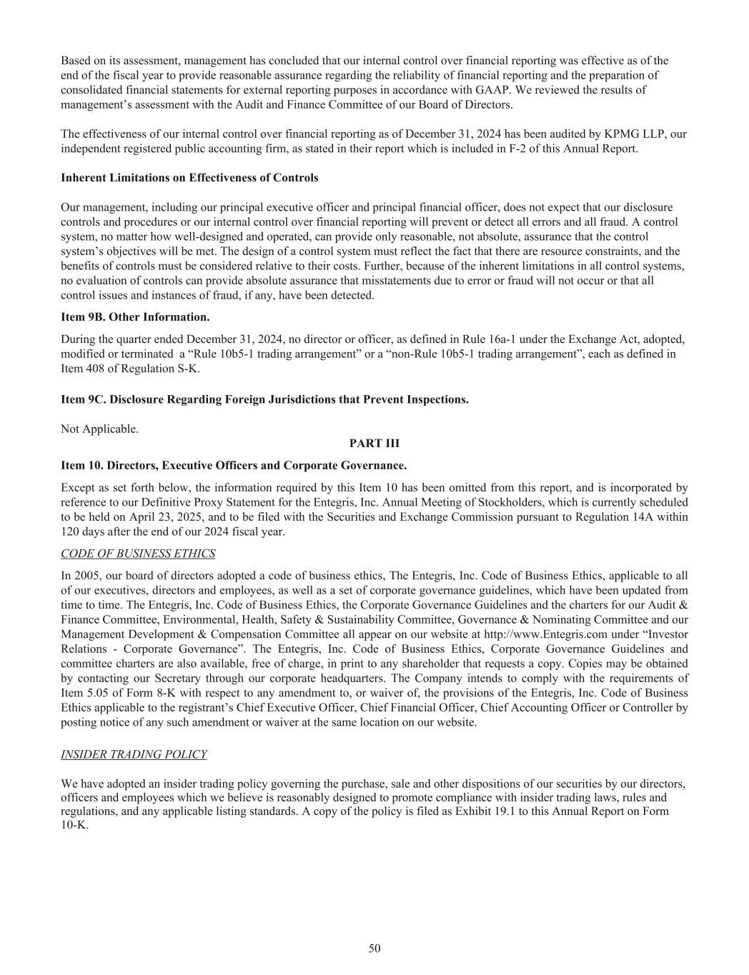 根据其评估,管理层得出结论,截至财政年度结束时,我们对财务报告的内部控制是有效的,为财务报告的可靠性和根据公认会计原则为外部报告目的编制合并财务报表提供了合理保证。我们与董事会审计和财务委员会审查了管理层的评估结果。截至2024年12月31日,我们对财务报告的内部控制的有效性已由我们的独立注册公共会计师事务所毕马威会计师事务所审计,如他们的报告所述,该报告包含在本年度报告的F-2中。对控制有效性的固有限制我们的管理层,包括我们的首席执行官和首席财务官,并不期望我们的披露控制和程序或我们对财务报告的内部控制将防止或发现所有错误和所有欺诈行为。一个控制系统,无论设计和操作得多么好,只能提供合理的,而不是绝对的,保证控制系统的目标将得到满足。控制系统的设计必须反映存在资源限制的事实,控制的收益必须相对于其成本来考虑。此外,由于所有控制系统的固有限制,任何对控制的评估都不能绝对保证不会发生由于错误或欺诈造成的错报,或者所有控制问题和欺诈事件(如果有的话)都已被发现。项目9b。其他信息。在截至2024年12月31日的季度内,没有根据《交易法》第16a-1条规则定义的董事或高级管理人员采用、修改或终止“第10b5-1条规则的交易安排”或“非第10b5-1条规则的交易安排”,每一项都在S-K条例第408项第9C项中定义。关于阻止检查的外国司法管辖区的披露。不适用。第三部分第10项。董事、执行官和公司治理。除下文所述外,本报告中省略了第10项要求的信息,并通过引用我们为Entegris, Inc.年度股东大会提供的最终委托书并入其中,该会议目前定于2025年4月23日举行,并将在我们2024财年结束后的120天内根据第14A条规定向证券交易委员会提交。商业道德准则在2005年,我们的董事会通过了商业道德准则,即适用于我们所有高管、董事和员工的Entegris, Inc.商业道德准则,以及一套公司治理准则,这些准则不时更新。Entegris, Inc.商业道德准则、公司治理准则以及我们的审计与财务委员会、环境、健康、安全与可持续发展委员会、治理与提名委员会以及我们的管理发展与薪酬委员会的章程都出现在我们的网站http://www.Entegris.com的“投资者关系-公司治理”下。还向任何要求提供副本的股东免费提供Entegris, Inc.商业道德准则、公司治理准则和委员会章程的印刷版。副本可通过我们的公司总部联系我们的秘书获得。公司打算通过在我们的网站的同一位置张贴任何此类修订或豁免的通知,来遵守8-K表第5.05项的要求,该等修订或豁免适用于注册人的首席执行官、首席财务官、首席财务官或财务总监的Entegris, Inc.商业道德准则的规定。内幕交易政策我们采用了内幕交易政策,管理我们的董事、高级职员和员工购买、出售和其他处置我们的证券的行为,我们认为这是合理设计的,旨在促进遵守内幕交易法律、规则和条例以及任何适用的上市标准。该保单的副本作为本年度报告的附件 19.1以表格10-K.50提交