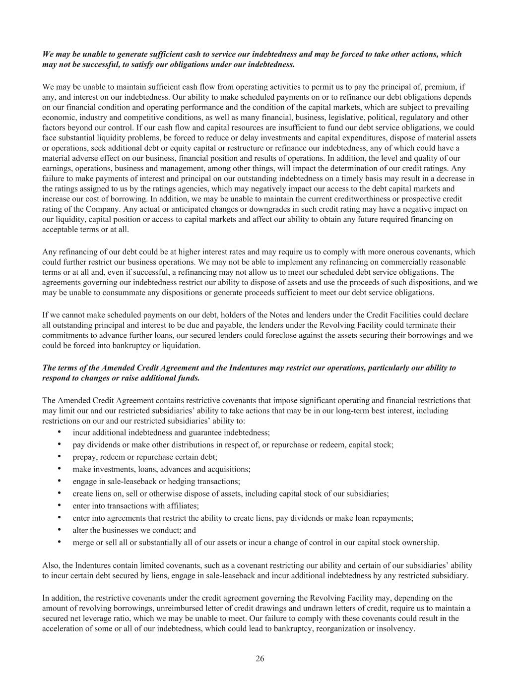 我们可能无法产生足够的现金来偿还我们的债务,并可能被迫采取其他行动,这些行动可能不会成功,以履行我们的债务义务。我们可能无法维持充足的经营活动现金流,以使我们能够支付我们的债务的本金、溢价(如果有的话)和利息。我们对债务进行按期付款或再融资的能力取决于我们的财务状况和经营业绩以及资本市场的状况,这些情况受制于当前的经济、行业和竞争条件,以及我们无法控制的许多金融、商业、立法、政治、监管和其他因素。如果我们的现金流和资本资源不足以为我们的偿债义务提供资金,我们可能会面临严重的流动性问题,被迫减少或延迟投资和资本支出,处置重大资产或运营,寻求额外的债务或股权资本或重组或再融资我们的债务,其中任何一项都可能对我们的业务、财务状况和经营业绩产生重大不利影响。此外,我们的收益、运营、业务和管理等方面的水平和质量,将影响我们信用评级的确定。任何未能及时支付我们未偿债务的利息和本金的情况都可能导致评级机构授予我们的评级下降,这可能会对我们进入债务资本市场产生负面影响,并增加我们的借贷成本。此外,我们可能无法维持公司目前的信用或预期信用评级。此类信用评级的任何实际或预期变化或下调可能会对我们的流动性、资本状况或进入资本市场产生负面影响,并影响我们以可接受的条款或根本无法获得任何未来所需融资的能力。我们债务的任何再融资都可能以更高的利率进行,并可能要求我们遵守更繁重的契约,这可能会进一步限制我们的业务运营。我们可能无法以商业上合理的条款或根本无法实施任何再融资,即使成功,再融资也可能无法让我们履行预定的偿债义务。管理我们债务的协议限制了我们处置资产和使用此类处置收益的能力,我们可能无法完成任何处置或产生足以履行偿债义务的收益。如果我们不能按期支付我们的债务,票据持有人和信贷便利下的贷方可以宣布所有未偿还的本金和利息到期应付,循环便利下的贷方可以终止其垫付更多贷款的承诺,我们的有担保贷方可以取消对为其借款提供担保的资产的赎回权,我们可能会被迫破产或清算。经修订的信贷协议和契约的条款可能会限制我们的运营,尤其是我们应对变化或筹集额外资金的能力。经修订的信贷协议包含限制性契约,这些契约施加了重大的经营和财务限制,可能会限制我们和我们受限制的子公司采取可能符合我们长期最佳利益的行动的能力,包括限制我们和我们受限制的子公司的能力:•产生额外债务和担保债务;•就股本支付股息或进行其他分配,或回购或赎回股本;•预付、赎回或回购某些债务;•进行投资、贷款、垫款和收购;•从事售后回租或对冲交易;•对资产设置留置权、出售或以其他方式处置,包括我们子公司的股本;•与关联公司进行交易;•签订限制建立留置权、支付股息或偿还贷款的能力的协议;•改变我们开展的业务;•合并或出售我们的全部或几乎全部资产,或招致我们股本所有权控制权的变更。此外,契约包含有限的契约,例如限制我们的能力的契约以及我们的某些子公司产生由留置权担保的某些债务、从事售后回租以及由任何受限制的子公司产生额外债务的能力。此外,信贷协议项下管辖循环融资的限制性契约可能会根据循环借款的金额、未偿还的信用证提款和未提取的信用证,要求我们维持有担保的净杠杆比率,而我们可能无法满足这一要求。我们未能遵守这些契约可能导致我们的部分或全部债务加速,这可能导致破产、重组或资不抵债。26