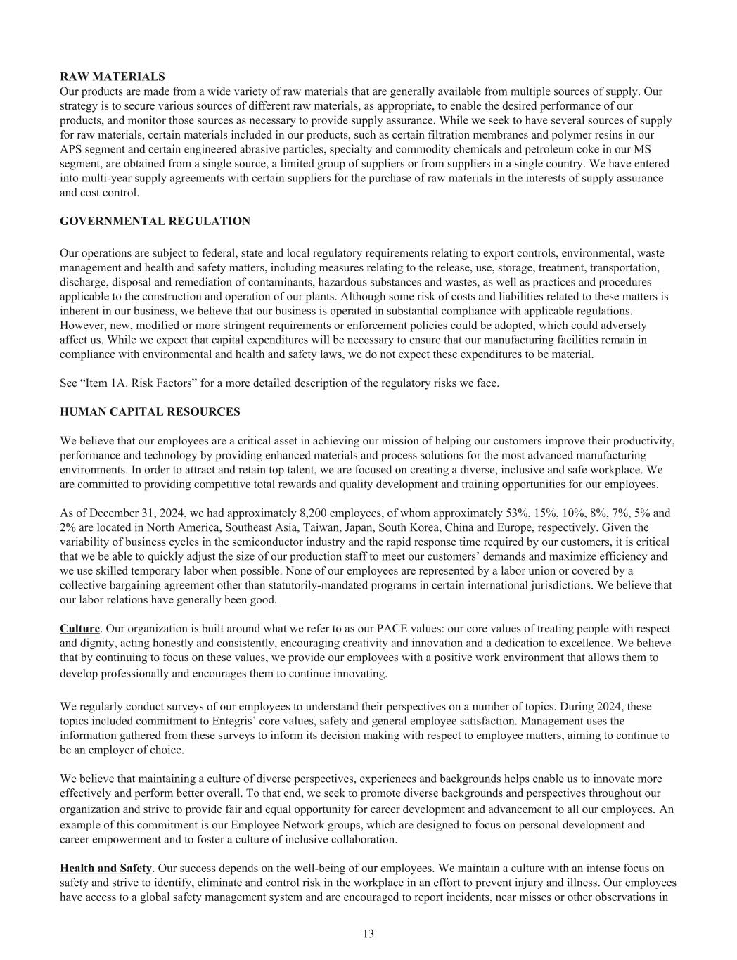 原材料我们的产品由各种各样的原材料制成,这些原材料通常可以从多个供应来源获得。我们的策略是酌情确保不同原材料的各种来源,以使我们的产品能够达到所需的性能,并根据需要监控这些来源以提供供应保证。虽然我们寻求拥有多个原材料供应来源,但我们产品中包含的某些材料,例如我们的APS部门的某些过滤膜和聚合物树脂以及我们MS部门的某些工程研磨颗粒、特种和商品化学品以及石油焦,是从单一来源、有限的供应商群体或单一国家的供应商获得的。为了供应保证和成本控制,我们与某些供应商就原材料采购订立了多年供应协议。政府监管我们的运营须遵守与出口管制、环境、废物管理以及健康和安全事项有关的联邦、州和地方监管要求,包括与污染物、有害物质和废物的释放、使用、储存、处理、运输、排放、处置和补救有关的措施,以及适用于我们工厂的建设和运营的做法和程序。尽管与这些事项相关的成本和负债的一些风险是我们的业务固有的,但我们认为我们的业务基本上是在符合适用法规的情况下运营的。然而,可能会采用新的、修改过的或更严格的要求或强制执行政策,这可能会对我们产生不利影响。虽然我们预计资本支出将是必要的,以确保我们的制造设施继续遵守环境、健康和安全法律,但我们预计这些支出不会是实质性的。见“项目1a。风险因素”,对我们面临的监管风险进行更详细的描述。人力资本资源我们相信,我们的员工是实现我们的使命的关键资产,即通过为最先进的制造环境提供增强的材料和工艺解决方案,帮助我们的客户提高生产力、性能和技术。为了吸引和留住顶尖人才,我们专注于打造一个多元、包容、安全的工作场所。我们致力于为我们的员工提供有竞争力的总奖励和质量发展和培训机会。截至2024年12月31日,我们拥有约8,200名员工,其中约53%、15%、10%、8%、7%、5%和2%分别位于北美、东南亚、台湾、日本、韩国、中国大陆和欧洲。鉴于半导体行业商业周期的可变性和客户需要的快速响应时间,我们能够快速调整生产人员的规模以满足客户的需求并最大限度地提高效率是至关重要的,并且我们在可能的情况下使用熟练的临时劳动力。除某些国际司法管辖区的法定授权项目外,我们的任何员工都没有工会代表或集体谈判协议的覆盖范围。我们认为,我们的劳动关系总体上是好的。文化。我们的组织建立在我们所说的PACE价值观的基础上:我们的核心价值观是以尊重和尊严待人,诚实和始终如一地行事,鼓励创造力和创新以及对卓越的奉献。我们相信,通过持续关注这些价值观,我们为员工提供了一个积极的工作环境,让他们能够专业发展,并鼓励他们不断创新。我们定期对我们的员工进行调查,以了解他们对一些主题的看法。在2024年期间,这些主题包括对英特格核心价值观的承诺、安全和一般员工满意度。管理层利用从这些调查中收集到的信息为其有关员工事务的决策提供信息,旨在继续成为首选雇主。我们相信,保持多元化视角、经验和背景的文化有助于使我们能够更有效地进行创新,并在整体上表现得更好。为此,我们寻求在整个组织中促进不同背景和观点,并努力为所有员工提供公平和平等的职业发展和晋升机会。这一承诺的一个例子是我们的员工网络小组,这些小组旨在关注个人发展和职业赋权,并培养包容性协作文化。健康与安全。我们的成功取决于员工的福祉。我们维护高度关注安全的文化,努力识别、 消除和控制工作场所风险,努力防止受伤和生病。我们的员工可以使用全球安全管理系统,并鼓励在13日报告事故、险情或其他观察