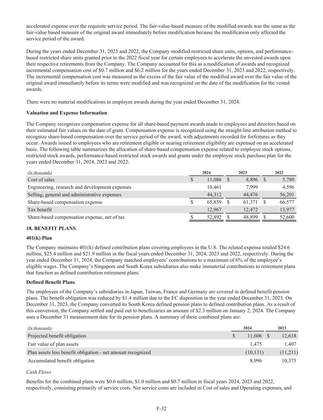 在必要的服务期内加速支出。修改后的奖励以公允价值为基础的计量与紧接修改前的原始奖励以公允价值为基础的计量相同,因为修改仅影响奖励的服务期。在截至2023年12月31日和2022年12月31日的年度内,公司修改了某些员工在2022财年之前授予的限制性股票单位、期权和基于业绩的限制性股票单位,以在他们各自从公司退休时加速未归属的奖励。公司将此作为截至2023年12月31日和2022年12月31日止年度的修改裁决和确认的增量补偿成本分别为0.7百万美元和6.2百万美元。增量补偿成本按修改后的奖励的公允价值超过紧接其条款修改前的原始奖励的公允价值的部分计量,并于修改之日就既得奖励确认。截至2024年12月31日止年度,员工奖励没有重大修改。估值及费用资料公司根据雇员及董事于授出日期的估计公平值,就所有以股份为基础的付款奖励确认补偿费用。补偿费用采用直线归属法在奖励服务期内确认以股份为基础的补偿,并在发生没收时记录调整。发给符合退休资格或接近退休资格的雇员的奖励按加速基准计入费用。下表汇总了截至2024年12月31日、2023年和2022年12月31日止年度与员工股票期权、限制性股票奖励、基于绩效的限制性股票奖励和员工股票购买计划下的授予相关的股份补偿费用分配情况:(单位:千)202420232022销售成本11,086美元8,896美元5,780美元工程、研发费用10,4617,999,4596销售、一般和管理费用44,31244,47656,201股份补偿费用65,859美元61,371美元66,577税收优惠12,96712,47213,977股份补偿费用,税后净额52,892美元48,899美元52,60018。Benefit计划401(k)计划公司维持401(k)固定缴款计划,覆盖美国员工。截至2024年12月31日、2023年和2022年12月31日的财政年度,相关费用总额分别为2460万美元、2540万美元和2190万美元。截至2024年12月31日止年度,公司将员工的供款与员工合资格工资的最高6%进行匹配。该公司的新加坡和韩国子公司也向作为固定缴款退休计划运作的退休计划提供非实质性供款。设定受益计划公司在日本、台湾、法国和德国的子公司的员工被纳入设定受益养老金计划。由于截至2023年12月31日止年度的EC处置,福利义务减少了140万美元。2023年12月31日,公司将其韩国固定养老金计划转换为固定缴款计划。由于这一转换,公司于2024年1月2日结算并向受益人支付了230万美元。该公司的养老金计划采用12月31日的计量日期。这些合并计划的概要如下:(以千计)20242023预计福利义务$ 11,606 $ 12,618计划资产的公允价值1,4751,407计划资产减去福利义务-确认的净额(10,131)(11,211)累计福利义务8,99610,375合并计划的现金流量福利在2024、2023和2022财年分别为60万美元、100万美元和70万美元,主要包括服务成本。净服务成本计入销售成本和运营费用,F-32