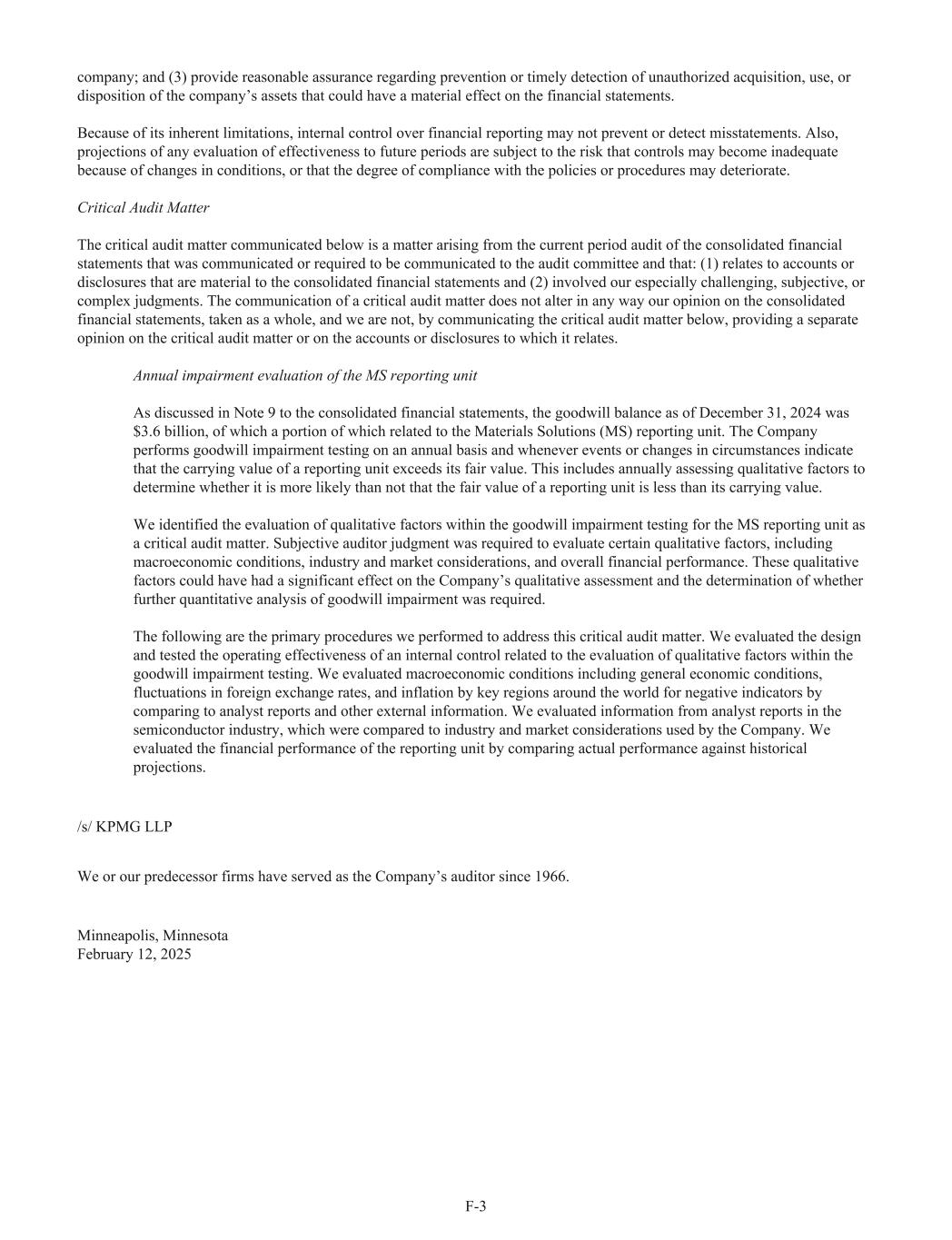 公司;以及(3)就防止或及时发现可能对财务报表产生重大影响的未经授权获取、使用或处置公司资产提供合理保证。财务报告内部控制由于其固有的局限性,可能无法防止或发现错报。此外,对未来期间的任何有效性评估的预测都受到以下风险的影响:由于条件的变化,控制可能变得不充分,或者政策或程序的遵守程度可能会恶化。关键审计事项下文通报的关键审计事项是对合并财务报表的当期审计产生的、已传达或要求传达给审计委员会的事项,该事项:(1)涉及对合并财务报表具有重要意义的账目或披露,以及(2)涉及我们特别具有挑战性、主观性或复杂的判断。关键审计事项的传达不会以任何方式改变我们对合并财务报表的意见,作为一个整体,我们也不会通过传达下文的关键审计事项,就关键审计事项或与其相关的账目或披露提供单独的意见。MS报告单位的年度减值评估如合并财务报表附注9所述,截至2024年12月31日的商誉余额为36亿美元,其中一部分与材料解决方案(MS)报告单位有关。公司每年进行商誉减值测试,每当有事件或情况变化表明报告单位的账面价值超过其公允价值时进行。这包括每年评估定性因素,以确定报告单位的公允价值低于其账面价值的可能性是否更大。我们将MS报告单位商誉减值测试中的定性因素评估确定为关键审计事项。评估某些定性因素需要主观的审计师判断,包括宏观经济状况、行业和市场考虑,以及整体财务表现。这些定性因素本可以对公司的定性评估和确定是否需要对商誉减值进行进一步的定量分析产生重大影响。以下是我们为处理这一关键审计事项而执行的主要程序。我们对设计进行了评估,并测试了商誉减值测试中与定性因素评价相关的内部控制的运行有效性。我们通过与分析师报告和其他外部信息的比较,评估了包括总体经济状况、外汇汇率波动、全球重点地区通胀等负面指标的宏观经济状况。我们评估了来自半导体行业分析师报告的信息,这些信息与公司使用的行业和市场考虑因素进行了比较。我们通过将实际业绩与历史预测进行比较来评估报告单位的财务业绩。/s/KPMG LLP我们或我们的前身公司自1966年起担任公司的审计师。明尼苏达州明尼阿波利斯2025年2月12日F-3