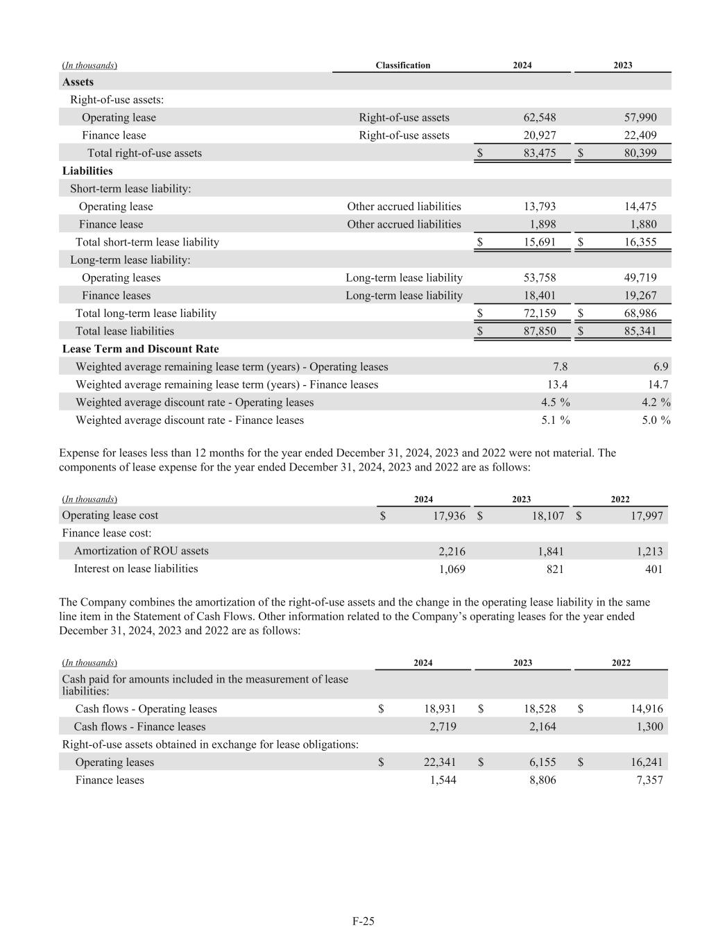 (单位:千)分类20242023资产使用权资产:经营租赁使用权资产62,54857,990融资租赁使用权资产20,92722,409使用权资产总额83,475美元80,399负债短期租赁负债:经营租赁其他应计负债13,79314,475融资租赁其他应计负债1,8981,880短期租赁负债总额15,691美元16,355美元长期租赁负债:经营租赁长期租赁负债53,75849,719融资租赁长期租赁负债18,40119,267长期租赁负债总额72,159美元68,986租赁负债总额87,850美元85,341租赁期限及贴现率加权平均剩余租期(年)-经营租赁7.86.9加权平均剩余租期(年)-融资租赁13.41 4.7加权平均贴现率-经营租赁4.5% 4.2%加权平均贴现率-融资租赁5.1% 5.0%截至2024年12月31日止年度、2023年及2022年12月31日止年度少于12个月的租赁的开支并不重大。截至2024年、2023年和2022年12月31日止年度的租赁费用构成如下:(单位:千)202420232022经营租赁成本17,936美元18,107美元17,997美元融资租赁成本:使用权资产摊销2,2161,8411,213租赁负债利息1,069821401公司将使用权资产的摊销和经营租赁负债的变动合并在现金流量表的同一项目中。与公司截至2024年12月31日、2023年和2022年12月31日止年度经营租赁相关的其他信息如下:(单位:千元)202420232022为租赁负债计量中包含的金额支付的现金:现金流量-经营租赁$ 18,931 $ 18,528 $ 14,916现金流量-融资租赁2,7192,1641,300为换取租赁义务而获得的使用权资产:经营租赁$ 22,341 $ 6,155 $ 16,241融资租赁1,5448,8067,357 F-25