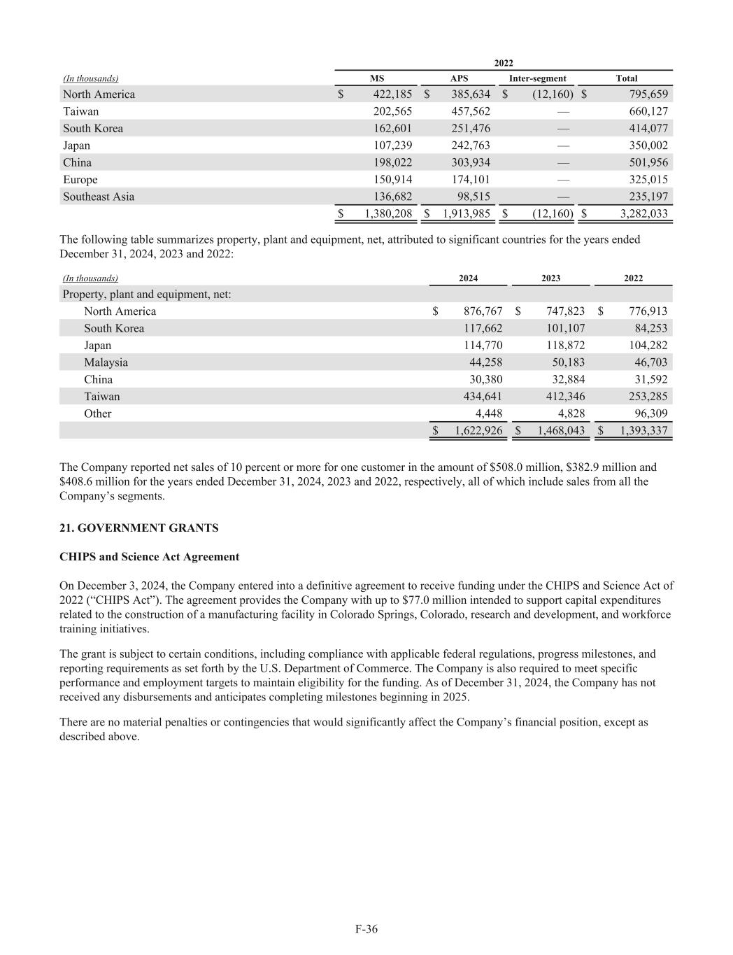2022(单位:千)MS APS部门间总额北美422,185美元385,634美元(12,160)795,659美元台湾202,565457,562 — 660,127韩国162,601251,476 — 414,077日本107,239242,763 — 350,002中国198,022303,934 — 501,956欧洲150,914174,101 — 325,015东南亚136,68 298,515 — 235,197美元1,380,208美元1,913,985美元(12,160)3,282,033美元下表汇总了截至2024年12月31日、2023年和2022年归属于重要国家的财产、厂房和设备净额:(单位:千)202420232022财产、厂房和设备,净额:北美洲876,767美元747,823美元776,913韩国117,662 101,10784,253日本114,770118,872104,282马来西亚44,25850,18346,703中国30,38032,88431,592台湾434,641412,346253,285其他4,4484,82896,309美元1,622,926美元1,468,043美元1,393,337美元公司报告的净销售额为10%或以上的一个客户,金额分别为5.08亿美元、3.829亿美元和4.086亿美元,截至2024年12月31日、2023年和2022年12月31日,所有这些都包括公司所有部门的销售额。21.政府授予芯片和科学法案协议于2024年12月3日,公司订立最终协议,根据2022年芯片和科学法案(“CHIPS法案”)获得资金。该协议为该公司提供了高达7700万美元的资金,旨在支持与在科罗拉多州科罗拉多斯普林斯建造制造工厂、研发和劳动力培训计划相关的资本支出。这笔赠款受某些条件限制,包括遵守适用的联邦法规、进展里程碑和美国商务部规定的报告要求。该公司还被要求达到特定的绩效和就业目标,以保持获得资助的资格。截至2024年12月31日,公司尚未收到任何付款,预计将于2025年开始完成里程碑。除上述情况外,不存在会对公司财务状况产生重大影响的重大处罚或或有事项。F-36