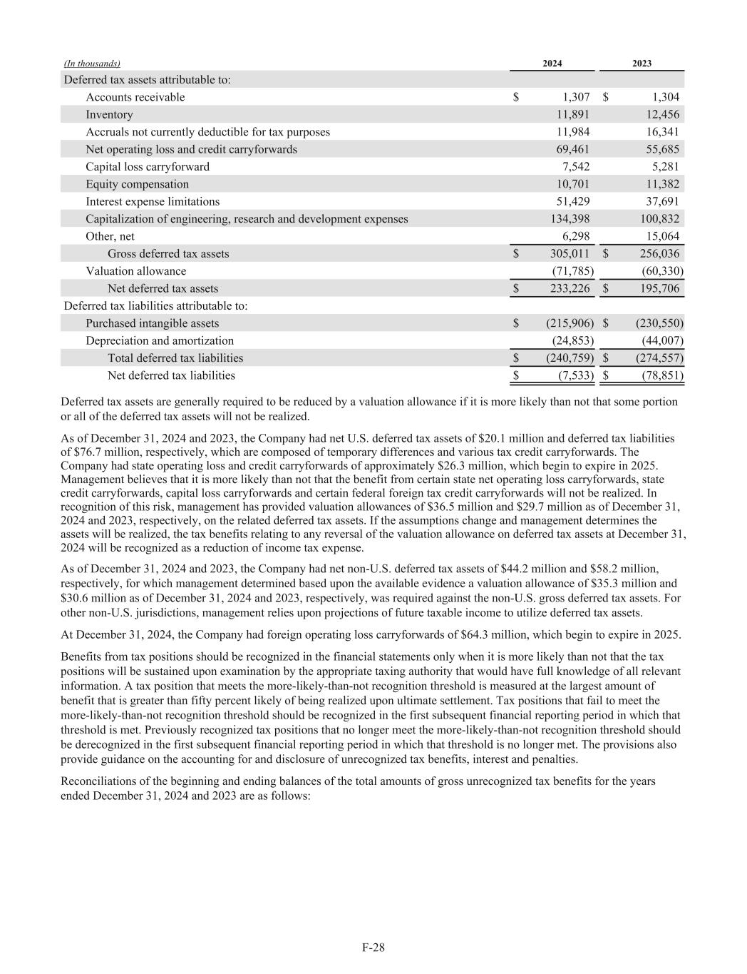 (单位:千)20242023递延所得税资产归属于:应收账款1307美元1304美元存货11,89112,456目前不可抵税的应计项目11,98416,341净经营亏损和信用结转69,46155,685资本亏损结转7,5425,281股权补偿10,70111,382利息费用限制51,42937,691工程、研发费用资本化134,398100,832其他,净额6,29815,064递延所得税资产总额305,011美元256,036美元估值备抵(71,785)(60,330)递延所得税资产净额233,226美元195,706美元递延所得税负债归属于:购买的无形资产$(215,906)$(230,550)折旧和摊销(24,853)(44,007)递延所得税负债总额$(240,759)$(274,557)递延所得税负债净额$(7,533)$(78,851)如果递延所得税资产的部分或全部很可能无法实现,则递延所得税资产一般需要减去估值备抵。截至2024年12月31日和2023年12月31日,公司的美国递延所得税资产净额分别为2010万美元和递延所得税负债分别为7670万美元,由暂时性差异和各种税收抵免结转组成。该公司的州运营亏损和信贷结转约为2630万美元,将于2025年开始到期。管理层认为,某些州净经营亏损结转、州信贷结转、资本损失结转和某些联邦外国税收抵免结转带来的好处很可能无法实现。为认识到这一风险,截至2024年12月31日和2023年12月31日,管理层分别为相关递延税项资产提供了3650万美元和2970万美元的估值备抵。如果假设发生变化且管理层确定资产将实现,则与2024年12月31日递延税项资产的估值备抵的任何转回有关的税收优惠将确认为所得税费用的减少。截至2024年12月31日和2023年12月31日,公司的非美国递延所得税资产净额分别为4420万美元和5820万美元,为此,管理层根据现有证据确定,截至2024年12月31日和2023年12月31日,非美国递延所得税资产总额分别需要3530万美元和3060万美元的估值备抵。对于其他非美国司法管辖区,管理层依赖对未来应税收入的预测来利用递延所得税资产。截至2024年12月31日,公司有6430万美元的国外经营亏损结转,将于2025年开始到期。只有当税务状况经充分了解所有相关信息的适当税务当局审查后,税务状况很有可能持续时,才应在财务报表中确认来自税务状况的好处。满足可能性大于不承认门槛的纳税状况,以最终结算时实现的可能性大于50%的最大利益金额来衡量。未能达到可能性大于未达到确认门槛的税务职位应在随后达到该门槛的第一个财务报告期间予以确认。不再满足可能性大于不满足确认门槛的先前确认的税务职位应在不再满足该门槛的随后第一个财务报告期间终止确认。该条款还就未确认的税收优惠、利息和罚款的会计和披露提供了指导。截至2024年12月31日和2023年12月31日止年度未确认税收优惠总额的期初和期末余额调节如下:F-28