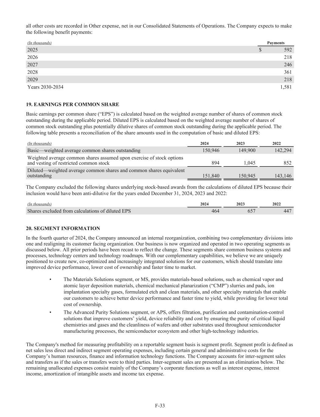 所有其他成本都记录在其他费用中,净额在我们的综合运营报表中。公司预计将支付以下福利金:(单位:千)付款20255922026218202724620283612029218年2030-2034 1,58119。每股普通股收益基本每股普通股收益(“EPS”)是根据适用期间已发行普通股的加权平均数计算得出的。稀释每股收益是根据已发行普通股的加权平均数加上适用期间已发行普通股的潜在稀释性股份计算得出的。下表列出了用于计算基本每股收益和稀释每股收益的股份金额的对账:(单位:千)202420232022基本——加权平均已发行普通股150,946149,900142,294在行使股票期权和归属限制性普通股时假设的加权平均普通股8941,045852稀释——加权平均普通股和已发行普通股等值151,840150,945143,146公司将以下基于股票的基础股份奖励排除在稀释每股收益的计算之外,因为在截至2024年12月31日的年度中,将其包括在内将具有反稀释性,2023及2022:(单位:千)202420232022股股份剔除计算摊薄每股盈利46465744720。部门信息2024年第四季度,该公司宣布进行内部重组,将两个互补的部门合并为一个,并重新调整其面向客户的组织。我们的业务现在分为两个经营分部进行组织和经营,如下所述。以往所有时期都已重铸,以反映这一变化。这些部门共享共同的业务系统和流程、技术中心和技术路线图。凭借我们的互补能力,我们相信我们具有独特的优势,可以为我们的客户创造新的、共同优化的和日益集成的解决方案,这应该会转化为改进的设备性能、更低的拥有成本和更快的上市时间。•材料解决方案部门(MS)提供基于材料的解决方案,例如化学气相和原子层沉积材料、化学机械平坦化(“CMP”)浆料和焊盘、离子注入特种气体、配方刻蚀和清洁材料,以及其他特种材料,这些材料使我们的客户能够实现更好的设备性能和更快的良率时间,同时提供更低的总拥有成本。• Advanced Purity Solutions部门(简称APS)提供过滤、净化和污染控制解决方案,通过确保关键液体化学品和气体的纯度以及半导体制造过程、半导体生态系统和其他高科技行业中使用的晶圆和其他基板的清洁性,提高客户的良率、设备可靠性和成本。本公司以报告分部为基础计量盈利能力的方法为分部利润。分部利润定义为净销售额减去直接和间接分部运营费用,包括公司人力资源、财务和信息技术职能的某些一般和行政成本。公司对分部间销售和转让进行会计处理,就好像销售或转让是向第三方进行的一样。分部间销售列示为以下的冲销。其余未分配费用主要由公司的企业职能以及利息支出、利息收入、无形资产摊销和所得税费用构成。F-33