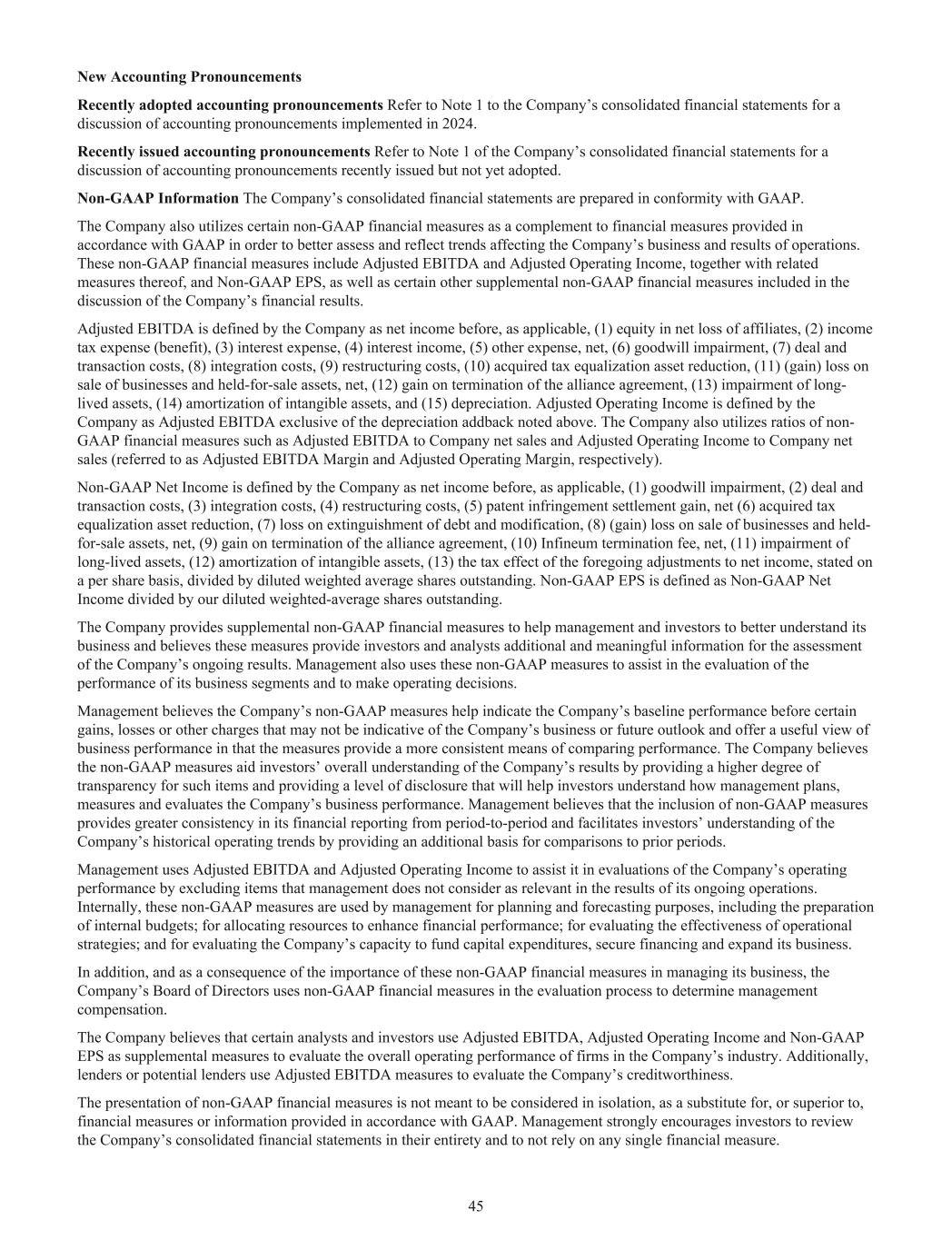 新会计公告最近采用的会计公告请参阅公司合并财务报表附注1,以讨论2024年实施的会计公告。最近发布的会计公告请参阅公司综合财务报表附注1,以讨论最近发布但尚未采纳的会计公告。非美国通用会计准则信息公司的合并财务报表是按照美国通用会计准则编制的。公司还利用某些非公认会计准则财务指标作为根据公认会计准则提供的财务指标的补充,以便更好地评估和反映影响公司业务和经营业绩的趋势。这些非GAAP财务指标包括调整后EBITDA和调整后营业收入及其相关指标,以及非GAAP每股收益,以及公司财务业绩讨论中包含的某些其他补充非GAAP财务指标。经调整EBITDA由公司定义为(如适用)前的净收入,(1)附属公司净亏损中的权益,(2)所得税费用(收益),(3)利息费用,(4)利息收入,(5)其他费用,净额,(6)商誉减值,(7)交易和交易成本,(8)整合成本,(9)重组成本,(10)收购的税收平衡资产减少,(11)出售业务和持有待售资产的(收益)亏损,净额,(12)终止联盟协议的收益,(13)长期资产减值,(14)无形资产摊销,以及(15)折旧。公司将调整后营业收入定义为不包括上述折旧加回的调整后EBITDA。公司还利用调整后EBITDA与公司净销售额、调整后营业收入与公司净销售额(分别称为调整后EBITDA利润率和调整后营业利润率)等非公认会计准则财务指标的比率。非美国通用会计准则净利润被公司定义为之前的净收入(如适用),(1)商誉减值,(2)交易和交易成本,(3)整合成本,(4)重组成本,(5)专利侵权和解收益,净额(6)获得的税收平衡资产减少,(7)债务清偿和修改的损失,(8)(收益)出售业务和持有待售资产的损失,净额,(9)终止联盟协议的收益,(10)Infineum终止费,净额,(11)长期资产减值,(12)无形资产摊销,(13)上述调整对净收入的税收影响,按每股计算,除以稀释后的加权平均流通股。Non-GAAP EPS定义为Non-GAAP净收入除以我们的稀释加权平均流通股。该公司提供了补充的非公认会计准则财务指标,以帮助管理层和投资者更好地了解其业务,并相信这些指标为投资者和分析师评估公司的持续业绩提供了额外和有意义的信息。管理层还使用这些非公认会计准则衡量标准来协助评估其业务部门的业绩并做出经营决策。管理层认为,公司的非公认会计准则衡量标准有助于表明公司在可能无法表明公司业务或未来前景的某些收益、损失或其他费用之前的基线业绩,并提供对业务业绩的有用看法,因为这些衡量标准提供了一种更一致的业绩比较手段。该公司认为,非公认会计原则措施有助于投资者对公司业绩的整体理解,为此类项目提供更高程度的透明度,并提供有助于投资者了解管理层如何规划、衡量和评估公司业务表现的披露水平。管理层认为,纳入非公认会计准则衡量标准为其各期财务报告提供了更大的一致性,并通过提供与前期比较的额外基础,促进了投资者对公司历史经营趋势的理解。管理层使用调整后的EBITDA和调整后的营业收入来帮助评估公司的经营业绩,方法是排除管理层认为在其持续经营的结果中不相关的项目。在内部,管理层将这些非公认会计准则衡量标准用于规划和预测目的,包括编制内部预算;分配资源以提高财务业绩;评估运营战略的有效性;以及评估公司为资本支出提供资金、确保融资和扩大业务的能力。此外,由于这些非公认会计准则财务指标在管理其业务方面的重要性, 公司董事会在评估过程中使用非公认会计准则财务指标来确定管理层薪酬。该公司认为,某些分析师和投资者使用调整后的EBITDA、调整后的营业收入和非GAAP每股收益作为补充措施来评估公司所在行业的公司的整体经营业绩。此外,贷方或潜在贷方使用调整后的EBITDA衡量标准来评估公司的信誉。非GAAP财务指标的列报并不意味着被孤立地考虑,作为根据GAAP提供的财务指标或信息的替代或优于。管理层强烈鼓励投资者全面审查公司的合并财务报表,不要依赖任何单一的财务指标。45