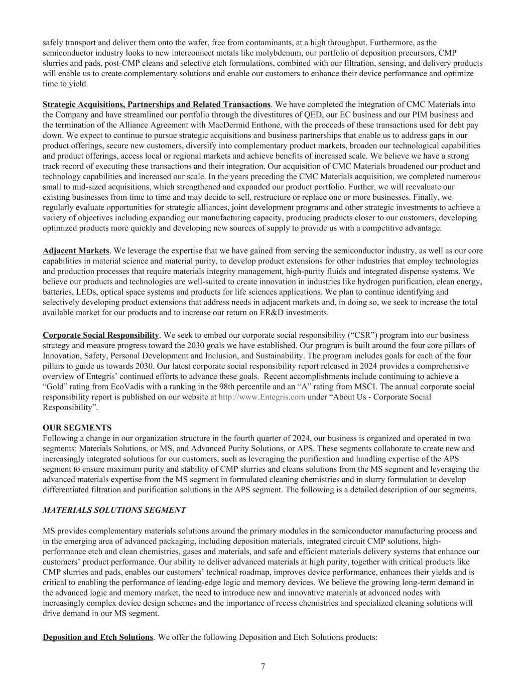 以高通量安全地运输和交付到晶圆上,没有污染物。此外,随着半导体行业寻求像钼这样的新型互连金属,我们的沉积前驱体、CMP浆料和焊盘、CMP后清洗和选择性刻蚀配方产品组合,再加上我们的过滤、传感和交付产品,将使我们能够创造互补的解决方案,并使我们的客户能够提高其设备性能并优化良率时间。战略收购、合作伙伴关系及关联交易。我们已经完成了将CMC Materials整合到公司中的工作,并通过剥离QED、我们的EC业务和PIM业务以及终止与MacDermid Enthone的联盟协议来简化我们的投资组合,这些交易的收益将用于偿还债务。我们预计将继续寻求战略收购和业务合作伙伴关系,使我们能够解决产品供应方面的差距、获得新客户、多元化进入互补产品市场、扩大我们的技术能力和产品供应、进入当地或区域市场并实现扩大规模的好处。我们相信,我们在执行这些交易及其整合方面有着良好的记录。我们对CMC Materials的收购拓宽了我们的产品和技术能力,增加了我们的规模。在收购CMC Materials之前的几年里,我们完成了无数次中小型收购,这加强并扩大了我们的产品组合。此外,我们将不时重新评估现有业务,并可能决定出售、重组或更换一项或多项业务。最后,我们定期评估战略联盟、联合开发计划和其他战略投资的机会,以实现各种目标,包括扩大我们的制造能力、生产更接近客户的产品、更快地开发优化产品以及开发新的供应来源,为我们提供竞争优势。邻近市场。我们利用从服务半导体行业中获得的专业知识,以及我们在材料科学和材料纯度方面的核心能力,为采用需要材料完整性管理、高纯度流体和集成分配系统的技术和生产工艺的其他行业开发产品扩展。我们相信,我们的产品和技术非常适合在氢提纯、清洁能源、电池、LED、光学空间系统和生命科学应用产品等行业创造创新。我们计划继续确定并有选择地开发满足邻近市场需求的产品扩展,并在此过程中寻求增加我们产品的总可用市场,并提高我们的ER & D投资回报。企业社会责任。我们寻求将我们的企业社会责任(“CSR”)计划嵌入我们的业务战略,并衡量我们在实现我们确立的2030年目标方面取得的进展。我们的计划是围绕创新、安全、个人发展和包容以及可持续发展这四个核心支柱建立的。该计划包括四大支柱中每一个的目标,以指导我们迈向2030年。我们在2024年发布的最新企业社会责任报告全面概述了英特格为推进这些目标所做的持续努力。近期的成就包括继续获得EcoVadis的“金牌”评级,排名在98个百分位,以及MSCI的“A”评级。年度企业社会责任报告在我司网站http://www.Entegris.com“关于我们——企业社会责任”项下发布。我们的部门继2024年第四季度组织结构发生变化后,我们的业务分为两个部门组织和运营:材料解决方案(MS)和高级纯度解决方案(AP)。这些部门合作为我们的客户创造新的和日益一体化的解决方案,例如利用APS部门的纯化和处理专业知识来确保来自MS部门的CMP浆料和清洁解决方案的最大纯度和稳定性,并利用MS部门在配方清洁化学和浆料配方方面的先进材料专业知识来开发APS部门的差异化过滤和纯化解决方案。以下是我们细分领域的详细描述。Materials Solutions SEGMENT MS围绕半导体制造过程中的初级模块和先进封装这一新兴领域提供补充材料解决方案,包括沉积材料、集成电路CMP解决方案、高性能刻蚀和清洁化学品、气体和材料, 和安全高效的材料交付系统,以提高我们客户的产品性能。我们以高纯度交付先进材料的能力,以及CMP浆料和焊盘等关键产品,使我们的客户能够制定技术路线图,提高设备性能,提高其产量,并且对于实现领先的逻辑和存储设备的性能至关重要。我们认为,先进逻辑和存储器市场不断增长的长期需求、在设备设计方案日益复杂的先进节点引入新的创新材料的需求以及凹槽化学品和专门清洗解决方案的重要性,将推动我们MS细分市场的需求。沉积和蚀刻解决方案。我们提供以下沉积和刻蚀解决方案产品:7
