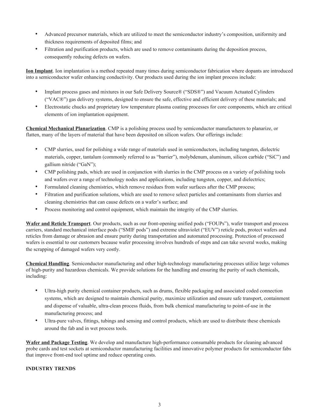 •先进的前驱体材料,用于满足半导体行业对沉积薄膜的成分、均匀性和厚度要求;•过滤和纯化产品,用于去除沉积过程中的污染物,从而减少晶圆上的缺陷。离子植入。离子注入是一种在半导体制造过程中多次重复的方法,其中掺杂剂被引入半导体晶片中以增强电导率。我们在离子注入过程中使用的产品包括:•在我们的安全交付来源中植入过程气体和混合物®(“SDS®”)和真空驱动油缸(“VAC®”)气体输送系统,旨在确保这些材料的安全、有效和高效输送;以及•核心部件的静电夹头和专有低温等离子体涂层工艺,它们是离子注入设备的关键要素。化学机械平面化。CMP是半导体制造商用来使沉积在硅片上的许多材料层平坦化或平坦化的抛光工艺。我们的产品包括:• CMP抛光垫,用于抛光半导体中使用的多种材料,包括钨、介质材料、铜、钽(通常称为“屏障”)、钼、铝、碳化硅(“SiC”)和氮化镓(“GaN”);• CMP抛光垫,与CMP工艺中的浆料一起用于各种抛光工具和晶圆上的一系列技术节点和应用,包括钨、铜和电介质;•配方清洁化学品,可在CMP工艺后去除晶圆表面的残留物;•过滤和纯化溶液,用于从浆料和清洁化学品中去除可能导致晶圆表面缺陷的选定颗粒和污染物;•过程监测和控制设备,可保持CMP浆料的完整性。晶圆和晶片传输。我们的产品,例如我们的前开式统一吊舱(“FOUP”)、晶圆传输和工艺载体、标准机械接口吊舱(“SMIF吊舱”)和极紫外(“EUV”)遮光板吊舱,保护晶圆和网片免受损坏或磨损,并确保运输和自动化加工过程中的纯度。保护加工后的晶圆对我们的客户来说至关重要,因为晶圆加工涉及数百个步骤,可能需要数周时间,这使得报废受损晶圆的成本非常高。化学品处理。半导体制造和其他高科技制造工艺利用大量高纯度和危险化学品。我们为此类化学品的处理和确保纯度提供解决方案,包括:•超高纯度化学品容器产品,例如滚筒、软包装和相关的编码连接系统,其设计目的是保持化学品纯度、最大限度地利用并确保从大宗化学品制造到制造过程中的使用点的宝贵、超洁净的工艺流体的安全运输、封存和分配;•超纯阀门、配件、管子以及传感和控制产品,用于在晶圆厂周围和湿法工艺工具中分配这些化学品。晶圆和封装测试。我们开发和制造用于清洁半导体制造设施的先进探针卡和测试插座的高性能耗材产品,以及用于半导体晶圆厂的创新聚合物产品,这些产品可改善前端工具正常运行时间并降低运营成本。行业趋势3
