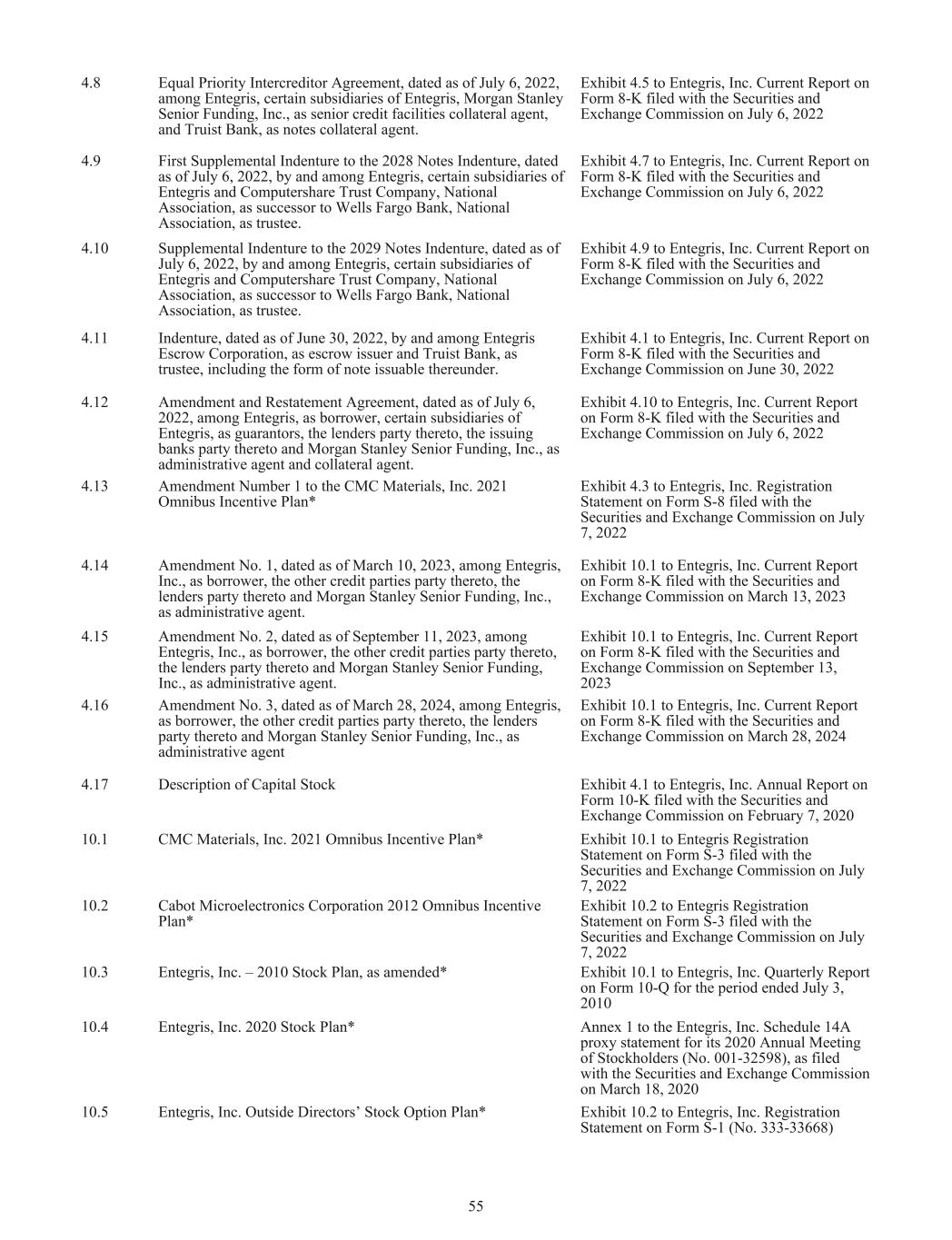 4.8等优先债权人间协议,日期为2022年7月6日,由英特格、英特格的某些子公司、摩根士丹利 Senior Funding,Inc.作为高级信贷融资抵押品代理以及Truist Bank作为票据抵押品代理之间签订。附件 4.5至Entegris, Inc.于2022年7月6日向美国证券交易委员会提交的8-K表格的当前报告4.9 2028年票据契约的第一份补充契约,日期为2022年7月6日,由英特格的某些子公司英特格,TERM3的某些子公司和ComputerShare Trust Company,National Association,作为继有的富国银行银行,National Association的受托人。附件 4.7至Entegris, Inc.于2022年7月6日向美国证券交易委员会提交的8-K表格的当前报告4.10 2029年票据契约的补充契约,日期为2022年7月6日,由英特格的某些子公司英特格,TERM3的某些子公司和ComputerShare Trust Company,National Association作为受托人,作为接替富国银行银行,National Association的受托人。对于Entegris, Inc.于2022年7月6日向美国证券交易委员会提交的8-K表格当前报告4.11,由作为托管发行人的英特格 Escrow Corporation和作为受托人的Truist Bank(包括根据该协议可发行票据的形式)签署的日期为2022年6月30日的4.11 Indenture,提供了附件 4.9。附件 4.1至Entegris, Inc.于2022年6月30日向美国证券交易委员会提交的8-K表格当前报告4.12日期为2022年7月6日的修订和重述协议,在作为借款人的英特格、作为担保人的英特格的某些子公司、作为其担保人的贷款方、作为其当事方的发卡银行以及作为行政代理人和抵押品代理人的摩根士丹利 Senior Funding,Inc.之间。附件 4.10至Entegris, Inc.于2022年7月6日向美国证券交易委员会提交的关于8-K表格的当前报告4.13对CMC Materials,Inc. 2021年综合激励计划的第1号修订*Entegris, Inc.作为借款人、其他信贷方、贷款方以及摩根士丹利 Senior Funding,Inc.作为行政代理人,于2022年7月7日向美国证券交易委员会提交的S-8表格上的Entegris, Inc.注册声明的附件 4.3,日期为2023年3月10日的4.14第1号修订。附件 10.1至摩根士丹利 Senior Funding,Inc.于2023年3月13日向美国证券交易委员会提交的8-K表格的当前报告4.15第2号修正案,日期为2023年9月11日,在Entegris, Inc.(作为借款人)、其他信贷方、贷款方以及作为行政代理人的TERM3 Senior Funding,Inc.之间。附件 10.1至Entegris, Inc.于2024年3月28日向美国证券交易委员会提交的8-K表格的当前报告4.16截至2024年3月28日的第3号修订,在作为借款人的英特格、其他信用方、贷款方以及作为行政代理人的摩根士丹利 Senior Funding,Inc.中,将附件 10.1至TERM5于2024年3月28日向美国证券交易委员会提交的8-K表格的当前报告4.17股本说明TERM0附件 4.1至英特格,Inc.于2020年2月7日向美国证券交易委员会提交的10-K表格年度报告10.1 CMC Materials,Inc. 2021年综合激励计划*于2022年7月7日向美国证券交易委员会提交的S-3表格上的英特格注册声明的附件 10.1 10.2 卡伯特微电子公司 2012年综合激励计划*于2022年7月7日向美国证券交易委员会提交的S-3表格上的英特格注册声明的附件 10.2 10.3 Entegris, Inc. – 2010年股票计划,经修订*截至7月3日止的10-Q表格季度报告丨附件 10.1,2010年10.4 Entegris, Inc. 2020年度股票计划*2020年3月18日向美国证券交易委员会备案的Entegris, Inc. 2020年年度股东大会附表14A委托书(编号:001-32598)附件1 10.5 Entegris, Inc.外部董事的股票期权计划*附件 10.2至S-1表格上的Entegris, Inc.注册声明(编号:333-33668)55