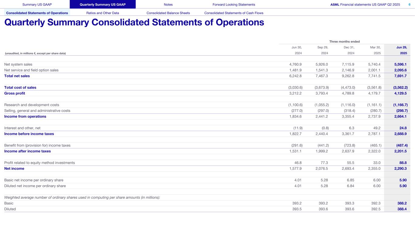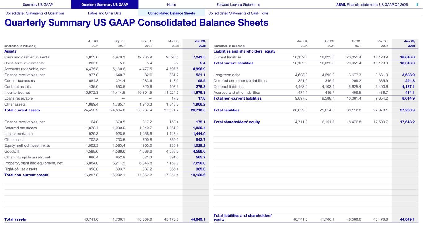 截至6月30日、9月29日、12月31日、3月30日、6月29日止三个月(未经审计,单位:百万欧元,除另有说明外)20242024202420252025毛利润占净销售额的百分比51.5% 50.8% 51.7% 54.0% 53.7%营业收入占净销售额的百分比29.4% 32.7% 36.2% 35.4% 34.6%净收入占净销售额的百分比25.3% 27.8% 29.1% 30.4% 29.8%所得税占所得税前收入的百分比16.0% 18.1% 21.5% 16.7% 18.1%股东权益占总资产比例36.1% 38.7% 38.0% 38.5% 39.3%光刻系统销售额(单位)11001161327776净预订量25,5672,6337,0883,9365,541发薪员工人数(单位:FTE)41,50542,37242,78643,12943,193临时员工人数(单位:FTE)1,5841,4171,2419988701。光刻系统不包括计量和检测系统。2.净预订量包括所有系统销售订单和通胀相关调整,已接受书面授权。美国公认会计原则季度摘要美国公认会计原则附注前瞻性报表ASML财务报表美国公认会计原则2025年第二季度7合并经营报表比率和其他数据合并资产负债表合并现金流量表季度摘要美国公认会计原则比率和其他数据