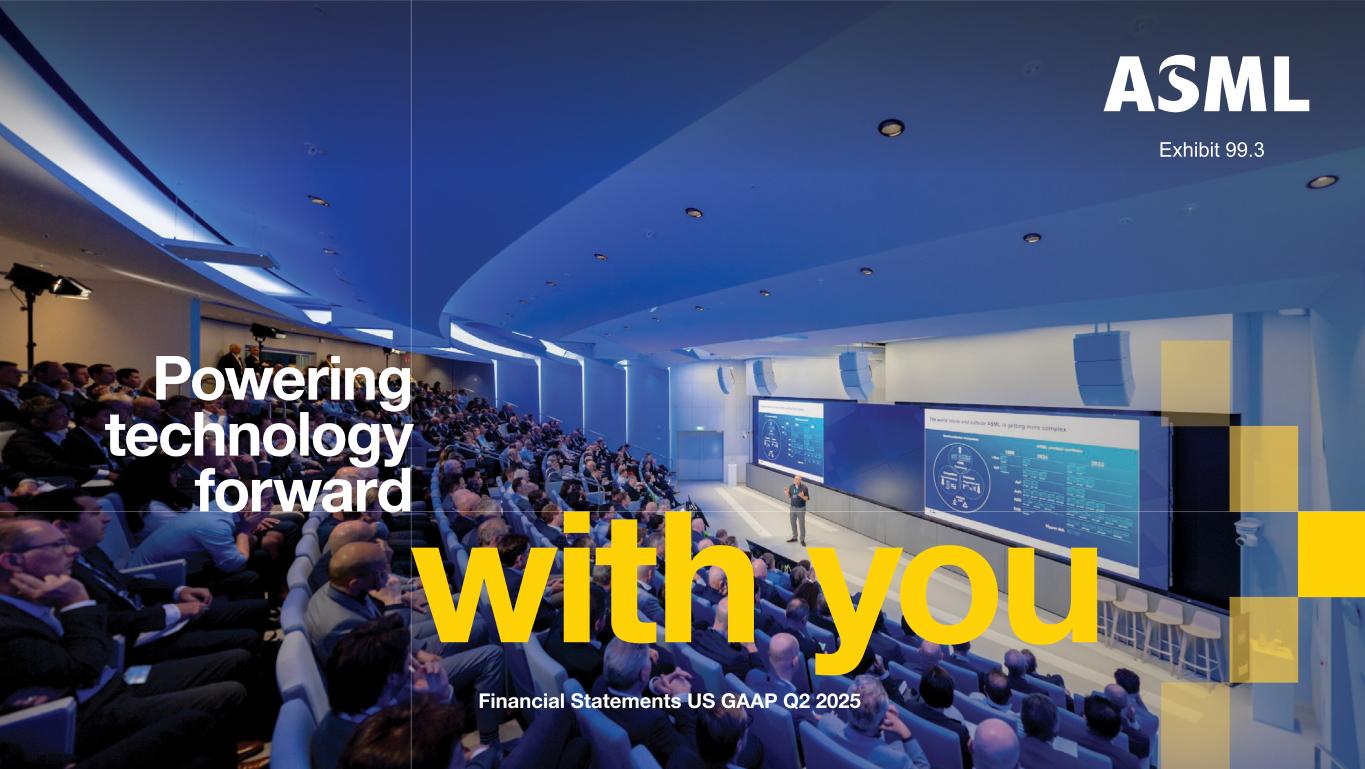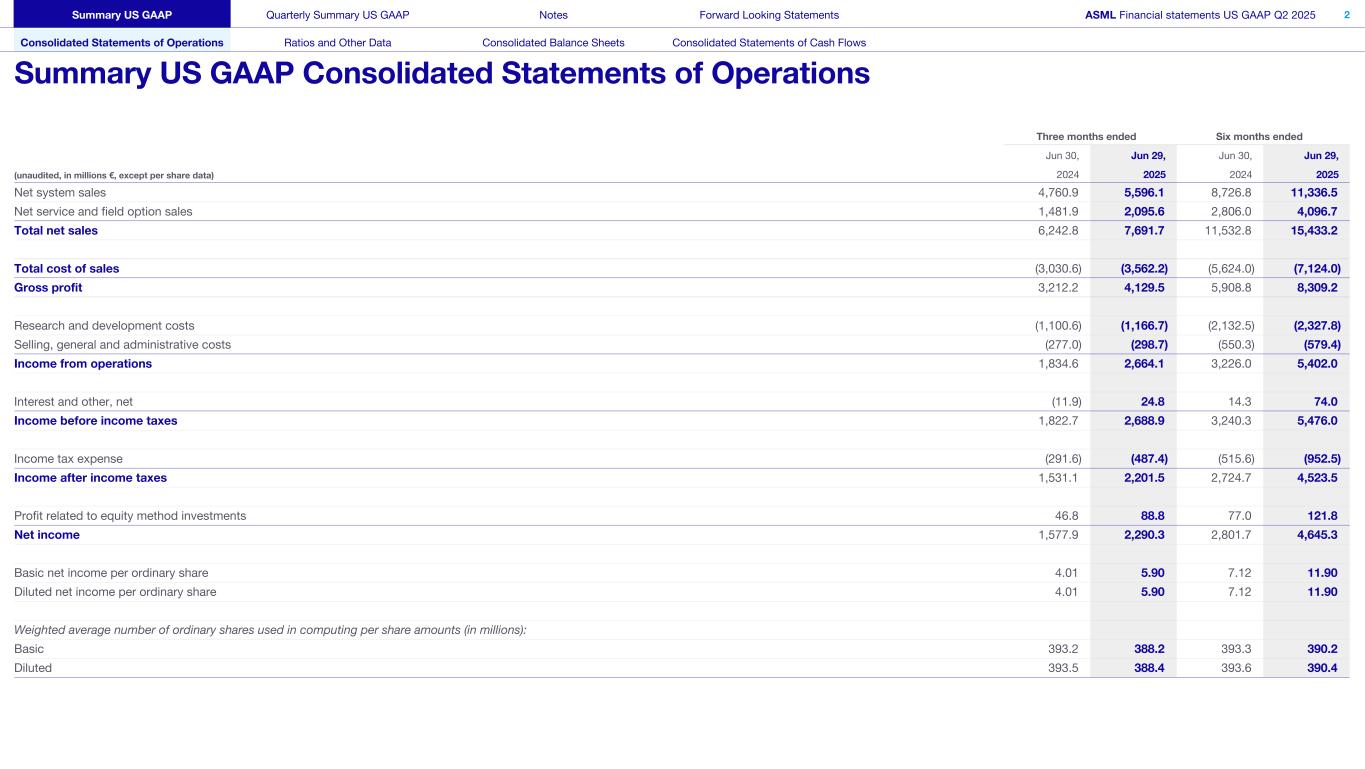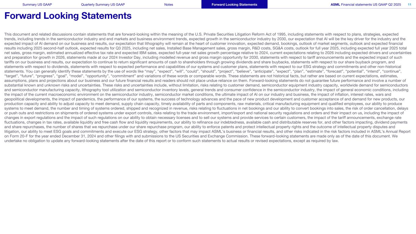 本文件和相关讨论包含1995年美国《私人证券诉讼改革法案》含义内的前瞻性陈述,包括有关计划、战略、预期趋势的陈述,包括半导体行业和终端市场的趋势以及商业环境趋势、到2030年半导体行业的预期增长、我们对人工智能将成为行业关键驱动因素的预期以及人工智能需求对我们的业务和业绩的预期影响、我们对光刻技术仍将是客户创新、预期需求、预订、细分市场前景的核心的预期,展望和预期财务业绩,包括2025年下半年展望,2025年第三季度的预期业绩,包括净销售额、已安装基地管理销售额、毛利率、研发成本、SG & A成本,2025年全年展望,包括预计2025年全年总净销售额、毛利率、估计年化有效税率和预期IBM销售额,预期全年净销售额相对于2024年的增长百分比,当前与2026年相关的预期,包括预期驱动因素和不确定性,以及为2026年增长做准备,在2024年投资者日发表的声明,包括2030年的模拟收入和毛利率机会,关于关税公告的声明以及此类关税对我们的业务和业绩的预期影响,我们期望通过不断增加的股息和股票回购继续向股东返还大量现金,关于我们的股票回购计划的声明,以及关于股息的声明,关于我们系统和客户计划的预期业绩和能力的声明,关于我们的ESG战略和承诺的声明以及其他非历史性声明。你一般可以通过使用“可能”、“预期”、“将”、“可以”、“应该”、“项目”、“相信”、“预期”、“计划”、“估计”、“预测”、“潜在”、“打算”、“继续”、“目标”、“未来”、“进展”、“目标”、“模式”、“机遇”、“承诺”等词语来识别这些陈述,以及这些词语或类似词语的变体。这些陈述不是历史事实,而是基于当前对我们业务和未来财务业绩的预期、估计、假设、计划和预测,读者不应过分依赖它们。前瞻性陈述并不能保证未来的业绩,并且涉及大量已知和未知的重大风险和不确定性。这些风险和不确定性包括但不限于与客户需求、半导体设备行业产能、全球对半导体和半导体制造产能的需求、光刻工具利用率和半导体库存水平、半导体行业的一般趋势和消费者信心、总体经济状况的影响,包括当前宏观经济环境对半导体行业的影响、半导体市场状况、人工智能对我们的行业和业务的最终影响、通货膨胀、利率、战争和地缘政治发展的影响、流行病的影响、我们系统的性能,技术进步的成功和新产品开发的速度以及客户对新产品的接受和需求,我们的生产能力和调整能力以满足需求,供应链能力,零部件、原材料、关键制造设备和合格员工的及时可用性,我们生产系统以满足需求的能力,订购、发货和在收入中确认的系统的数量和时间,与净预订量波动和我们将预订转化为销售的能力有关的风险,订单取消的风险,出口管制下订购系统的延迟或推出和限制发货、与贸易环境、进出口和国家安全法规和订单相关的风险及其对我们的影响,包括出口法规变化的影响和此类法规对我们获得必要许可证以及向某些客户销售我们的系统和提供服务的能力的影响、关税公告的影响、汇率波动、税率变化、可用流动性和自由现金流以及流动性要求、我们为债务再融资的能力、可用现金和可分配准备金,以及其他影响因素,股息支付和股份回购,我们根据股份回购计划回购的股份数量,我们执行专利和保护知识产权的能力以及知识产权纠纷和诉讼的结果,我们实现ESG目标和承诺以及执行ESG战略的能力,可能影响ASML业务或财务业绩的其他因素, 以及ASML截至2024年12月31日止年度的20-F表格年度报告以及向美国证券交易委员会提交和提交的其他文件中所包含的风险因素中提示的其他风险。这些前瞻性陈述仅在本文件发布之日作出。除法律要求外,我们不承担在本报告发布之日后更新任何前瞻性陈述或使此类陈述符合实际结果或经修订的预期的义务。美国公认会计原则季度摘要美国公认会计原则附注前瞻性报表ASML财务报表美国公认会计原则2025年第二季度11前瞻性报表