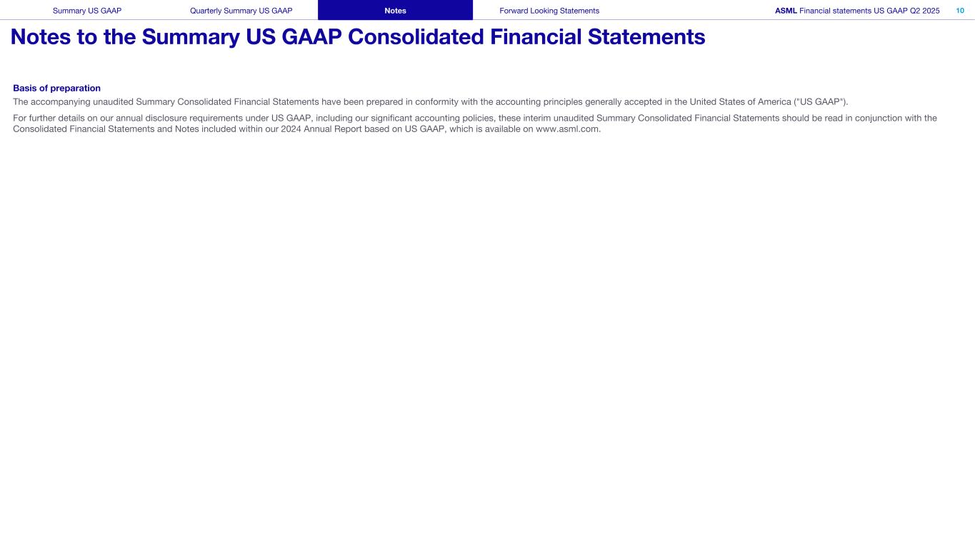 编制基础随附的未经审计的合并财务报表摘要是按照美国普遍接受的会计原则(“美国公认会计原则”)编制的。有关我们在美国公认会计原则下的年度披露要求的更多详细信息,包括我们的重要会计政策,这些中期未经审计的汇总合并财务报表应与我们基于美国公认会计原则的2024年年度报告中包含的合并财务报表和附注一起阅读,该报告可在www.asml.com上查阅。美国公认会计原则季度摘要美国公认会计原则附注前瞻性报表ASML财务报表美国公认会计原则2025年第二季度10摘要附注美国公认会计原则合并财务报表
