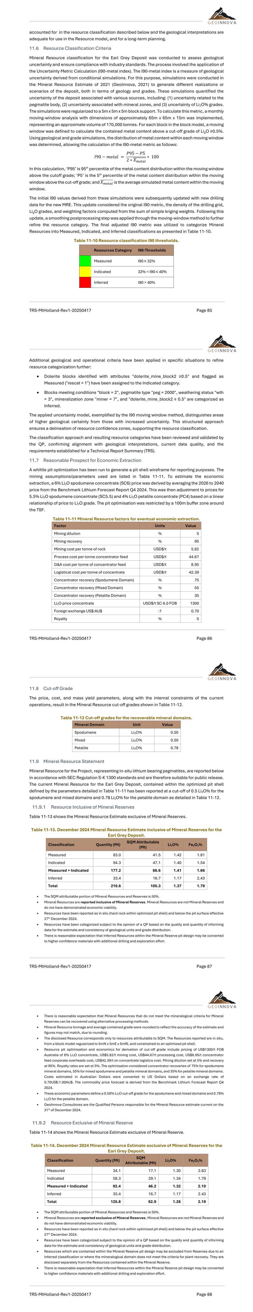 TRS-MTHolland-Rev1-20250417第85页在下文所述的资源分类中核算,地质解释足以在资源模型中使用,并用于长期规划。11.6资源分类标准Earl Grey矿床的矿产资源分类是为了评估地质不确定性并确保符合行业标准。该过程涉及不确定性度量计算(I90-金属指数)的应用。I90-金属指数是从条件模拟中得出的地质不确定性的量度。为此,在2021年矿产资源估算(GeoInnova,2021)中进行了模拟,以生成该矿床在地质和品位方面的不同实现或情景。这些模拟量化了与各种来源相关的矿床的不确定性,包括:(1)与伟晶岩体相关的不确定性,(2)与矿带相关的不确定性,以及(3)Li2O %品位的不确定性。模拟被正规化为5m x5m x5m块支撑。为了计算这一指标,实施了尺寸约为65m x65m x15m的月度移动窗口分析,代表大约170,000吨的体积。针对区块模型中的每个区块,定义了一个移动窗口,用于计算Li ↓ O ≥ 0.5%边界品位以上的所含金属含量。利用地质和品位模拟,确定了每个移动窗口内金属含量的分布情况,允许I90-金属度量的计算如下:90 − = 95 − 52 * * 100在此计算中,‘P95’是移动窗口内高于截止品位的金属含量分布的第95个百分位;‘P5’是移动窗口内高于截止品位的金属含量分布的第5个百分位;是移动窗口内的平均模拟金属含量。从这些模拟得出的初始I90值随后更新了新MRE的新钻探数据。此次更新考虑了原始的I90度量、钻孔网格的密度、Li ↓ O等级,以及从简单克里金权重之和计算出的加权因子。此次更新后,通过moving-window方法应用了平滑后处理步骤,进一步细化了资源类别。最终调整后的I90度量标准被用于将矿产资源分类为表11-10所示的测量、指示和推断分类。表11-10资源分类i90阈值。资源类别I90-阈值实测i90 ≤ 32%指示32% < i90 ≤ 40%推断i90 > 40% TRS-MTHolland-Rev1-20250417第86页在特定情况下应用了额外的地质和操作标准,以进一步细化资源分类:•被识别为属性为“白云石_ mine _ block2 ≥ 0.5”并标记为实测(“rescat = 1”)的白云岩区块已被分配到指示类别。•符合条件的区块“block = 2”、伟晶岩类型“peg = 2000”、风化状态“wth = 3”、矿化带“miner = 7”、“辉绿岩_ mine _ block2 ≥ 0.5”归类为推断。应用的不确定性模型,以I90移动窗口方法为例,将地质确定性较高的区域与不确定性增加的区域区分开来。这种结构化的方法确保了资源信任区的划定,支持资源分类。QP已对分类方法和由此产生的资源类别进行了审查和验证,确认与地质解释、当前数据质量以及为技术报告摘要(TRS)确立的要求保持一致。11.7经济开采的合理前景已运行一个whittle坑优化以生成用于报告目的的坑壳线框。所使用的采矿假设/参数列于表11-11。要估算经济开采, 6% Li2OO锂辉石精矿(SC6)价格是通过将2024年第四季度基准锂预测报告中的2026至2040年价格进行平均得出的。这是随后根据价格与Li2O品位的线性关系对5.5% Li2O锂辉石精矿(SC5.5)和4% Li2O透辉石精矿(PC4)的价格进行调整。坑优化受到TSF周围100m缓冲区的限制。表11-11最终经济开采的矿产资源因素。因子单位价值采矿稀释% 5采矿回收率% 95每吨岩石的采矿成本USD $/t 5.82每吨选矿厂进料的工艺成本USD $/t 44.67每吨选矿厂进料的G & A成本USD $/t 8.95每吨精矿的物流成本USD $/t 42.39选矿厂回收率(锂辉石域)% 75选矿厂回收率(混合域)% 55选矿厂回收率(Petalite域)% 35 Li2O价格精矿USD $/t SC 6.0 FOB1300外汇USD:AU $:10.70 Royalty % 5 TRS-MTHolland-Rev1-20250417 Page8711.8截止品位价格、成本、质量产量参数,随着当前运营的内部约束,导致矿产资源边界品位如表11-12所示。表11-12可采矿域边界品位。矿物域单位价值锂辉石Li2O % 0.50混合Li2O % 0.50 Petalite Li2O % 0.78 11.9矿产资源声明项目的矿产资源,代表原位含锂伟晶岩,根据SEC法规S-K 1300标准报告如下,因此适合公开发布。据报告,目前Earl Grey矿床的矿产资源,包含在表11-11中详述的参数所定义的优化坑壳内,锂辉石和混合域的边界为0.5 Li2O %,透辉石域的边界为0.78 Li2O %,详见表11-12。11.9.1包含矿产储量的资源表11-13显示了不包含矿产储量的矿产资源估算。表11-13。2024年12月矿产资源估算,包括Earl Grey矿床的矿产储量。分类数量(MT)SQM归属(MT)Li2O % Fe2O3 %实测83.04 1.5 1.42 1.81指示94.347.1 1.40 1.54实测+指示177.288.6 1.41 1.66推断33.4 16.7 1.17 2.43合计210.6 105.3 1.37 1.79 •矿产资源储量SQM归属部分为50%。•矿产资源报告包含矿产储量。矿产资源不是矿产储量,不具备证明的经济可行性。•已报告资源为原位(优化坑壳内的硬岩)和坑面以下,自2024年12月27日起生效。•资源已根据地质单位和品位分布的估计和一致性的告知数据的质量和数量,根据QP的意见进行分类。•有合理的预期,矿产储量矿坑设计内的推断资源可能会随着额外的钻探和勘探努力而转换为更高置信度的材料。TRS-MTHolland-Rev1-20250417第88页•有合理预期,不符合矿产储量矿物学标准的矿产资源可以使用替代加工方法进行回收。•矿产资源吨位和平均包含品位四舍五入,以反映估算的准确性,由于四舍五入,数字可能不匹配。•披露的资源仅对应归属于SQM的资源。报告的资源是就地的,从一个块模型正规化到5mN x 5mE x 5mRL,并被限制在一个优化的坑壳中。•资源坑优化及边界品位推导的经济性包括6% Li2O精矿定价1300美元/吨澳大利亚离岸价、5.82美元/吨的开采成本、44.67美元/吨的加工成本、8.95美元/吨的选矿厂饲料企业间接费用、42.39美元/吨的精
