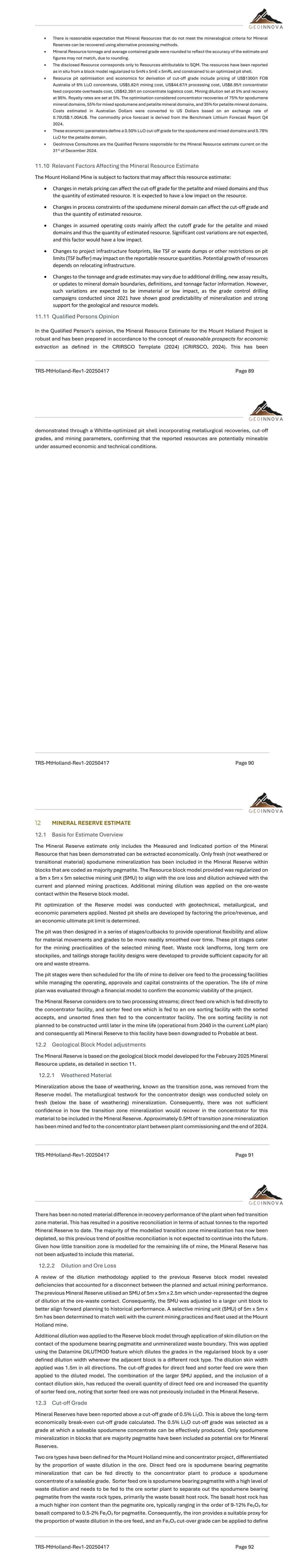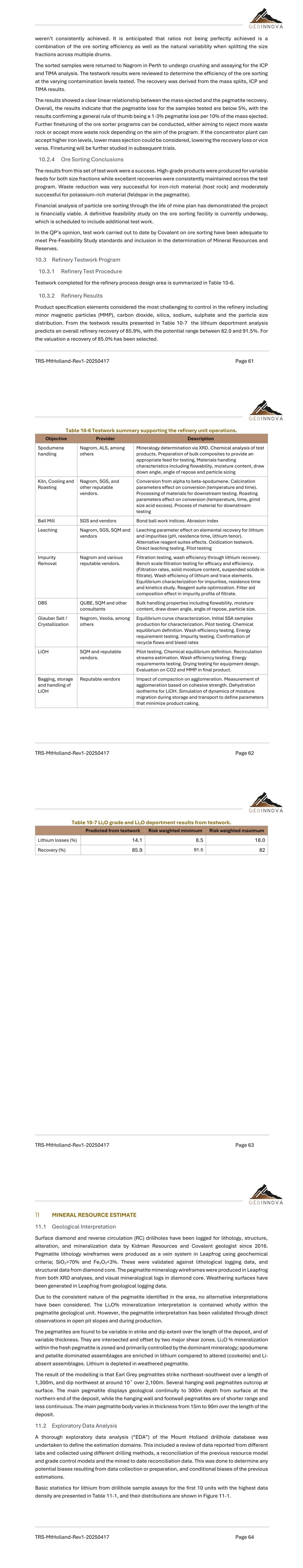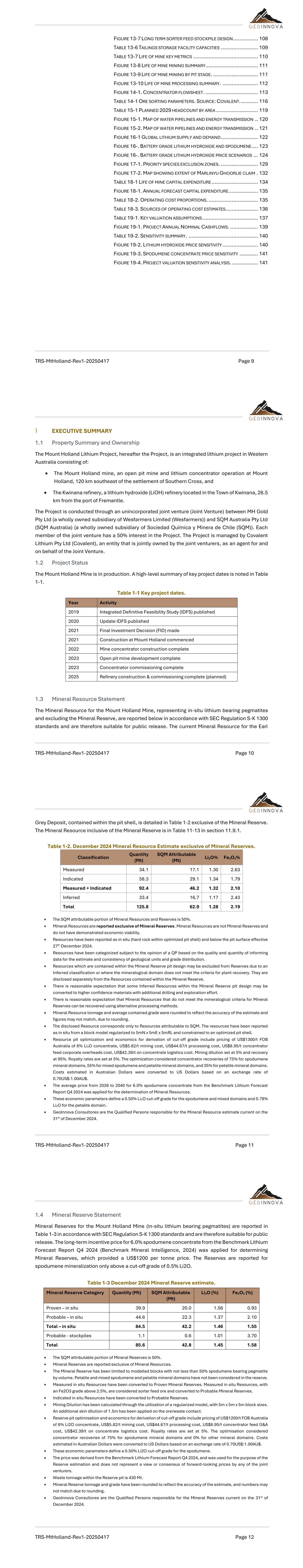 TRS-MTHolland-Rev1-20250417 Page145通过爬坡实现的绩效和改进举措支持了这样一种观点,即集中器假设足以支持Reserve定义。22.1.4环境、社会和治理在环境研究、许可、计划以及与当地团体的关系方面,项目提交了符合既定内容和标准的环境影响评估(环评),以及西澳大利亚现行环境法规的法律要求。项目批复已收到,项目运行中。此外,该项目承诺采取一些正在进行的监测措施(包括地下水采样、土壤分析和植被健康监测),以检测由于项目实施而对环境产生的任何影响。这将允许项目所有者在发现项目相关影响的不太可能的情况下实施控制和缓解措施。QP认识到,要在矿产储量的10年之后开采到矿山的完整寿命,还需要进一步的批准。预计Mine Life of Mine项目超过前10年的所有影响都可以按要求轻松管理和抵消。矿山寿命采矿提案计划于2025年由Covalent提交。22.2主要风险QP确定的项目的主要风险概述如下。•产品销售价格:氢氧化锂和锂辉石精矿价格根据对锂市场整体预测的供需变化进行预测。未来供需将如何变化存在相当大的不确定性,这可能会对未来价格产生重大影响。储量估计可能对与氢氧化锂和锂辉石精矿价格变化相关的收入重大变化很敏感。•货币汇率对生产成本的影响:成本以澳元(AU $)为模型,在现金流模型中转换为美元(US $)。•资源:虽然矿产资源已被广泛钻探和测试,矿化的性质是一致的,并且显然很好理解,但存在矿产资源中所含金属被错误估计、冶金性能不能完全代表整个岩体以及无法提取所报告的价值的风险。•采矿稀释和采矿回收:对适用于储备金的矿石损失和稀释水平进行了调整,以更好地与采矿实践保持一致。与大约6个月的开采新鲜矿石的对账数据有限。如果无法达到计划的选择性水平,很可能会出现分选机进料矿石比例增加而直接进料矿石相应减少的情况,从而导致加工成本上升,并降低冶金回收率,因为更多的矿石通过矿石分选设施TRS-MTHolland-Rev1-20250417提前于选矿厂进行处理。其他锂矿存在稀释的潜在风险,如透辉石,因此矿物学表征和定界有待改进。•加工厂和精炼厂产量:预测假设选矿厂、矿石分选设施和精炼厂将完全投入运营,并实现估计产量假设。这些工厂的计划绩效指标尚未实现。如果未来有一个或多个工厂没有按设计运行,或者没有实现任何目标产量,矿产储量和估计的经济结果将受到不利影响。•运营风险:存在一系列潜在的运营风险,从无法雇用、培训和留住开展运营所需的工人和专业人员,到管理不善。许多类似的行动都在西澳大利亚进行,没有理由相信这些风险因素无法消除。•可能对运营产生负面影响的异常天气事件或气候变化的影响。•不可预见的重大事件,包括像新冠肺炎这样的大流行事件和影响市场的战争情景。22.3结论Mount Holland矿山和选矿厂项目目前已投入运营,具备可研、 建设和调试现已全部完成。该炼油厂正处于建设和调试的后期阶段,计划于2025年开始生产。合资格人士认为,就申报的矿产资源和储量估算而言,所积累的现有勘探数据是可靠和充分的。该报告是根据SEC新的采矿规则根据第1300分项和S-K条例第601(96)(b)(iii)项编制的资源和储量分类。TRS-MTHolland-Rev1-20250417第147页建议在矿山运营的现阶段没有给出建议。TRS-MTHolland-Rev1-20250417 page148 references Ahmat,A.(1986)。西澳大利亚南十字省绿岩带的变质模式。西澳大利亚地质学会报告,19,1-21。对标矿产情报。(2024).锂预测| 2024年第四季度。对标矿产情报。核心锂。(2024).Finnis矿产资源增长58%。ASX:CXO公告。2024年4月11日。Adelaide:Core Lithium。共价。(2020).更新了综合确定可行性研究(UIDFS)。珀斯:共价锂。316页。共价。(2021).矿山计划优化研究。珀斯:共价锂。克里尔斯科。(2024).矿产储量委员会国家报告标准(CRIRSCO)。(2024).勘探目标、勘探结果、矿产资源和mienral储量公开报告的国际报告模板(2024年6月版)。检索自https://www.crirsco.com/DMIRS。(2018).1:500000状态解释基岩地质(DMIRS-016)。GeoInnova。(2021).UIDFS的机会和风险Mt. Holland项目地质、矿产资源和储量。圣地亚哥:GeoInnova。GeoInnova。(2025).Memorandom:Mt Holland的抽样议定书审查。圣地亚哥:GeoInnova。GeoInnova。(2025).矿产资源估算,MT Holland矿(第595号报告)。圣地亚哥:GeoInnova。地下水资源管理。(2014).蓝脉水文地质桌面研究。悉尼:地下水资源管理。地下水资源管理。(2017).Mount Holland:2017年2月空运测试汇总结果。Perth:Kidman Resources的地下水资源管理,2017年3月8日。10页。JORC。(2012).澳大利亚勘探结果、矿产资源和矿石储量报告规范。澳大利亚联合矿石储量委员会。Kidman Gold Pty Ltd.(2017)。环境审查文件,Earl Grey Lithium项目。1986年《环境保护法》和1999年《环境保护和生物多样性保护法》提交。墨尔本:基德曼资源。基德曼资源。(2018).Kidman Resources宣布完成Kwinana锂精炼厂PFS和更新的矿山和选矿厂范围研究。墨尔本:ASX公告Kidman Resources。2018年10月22日。