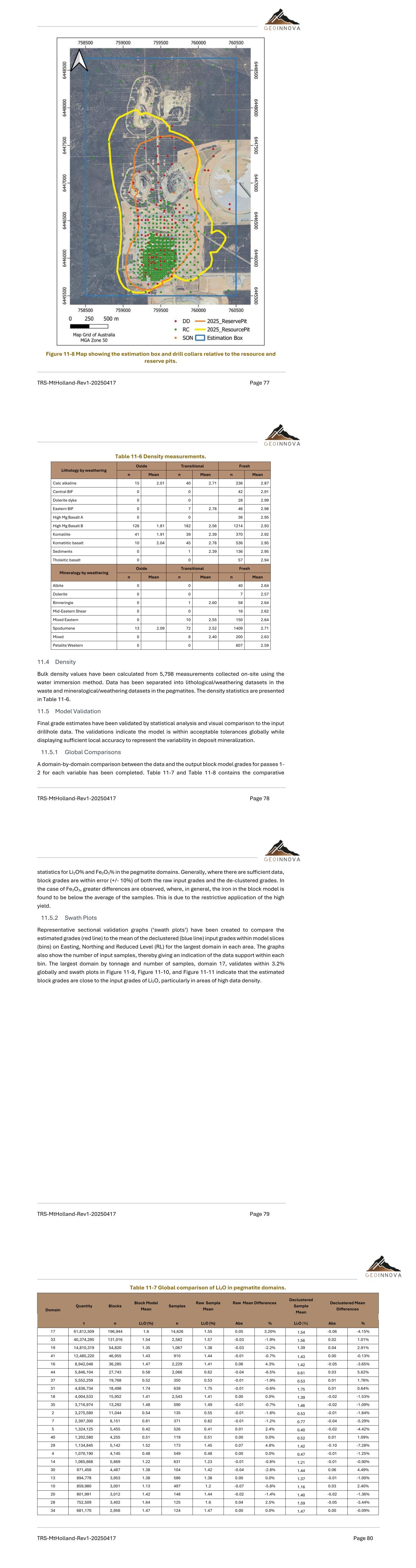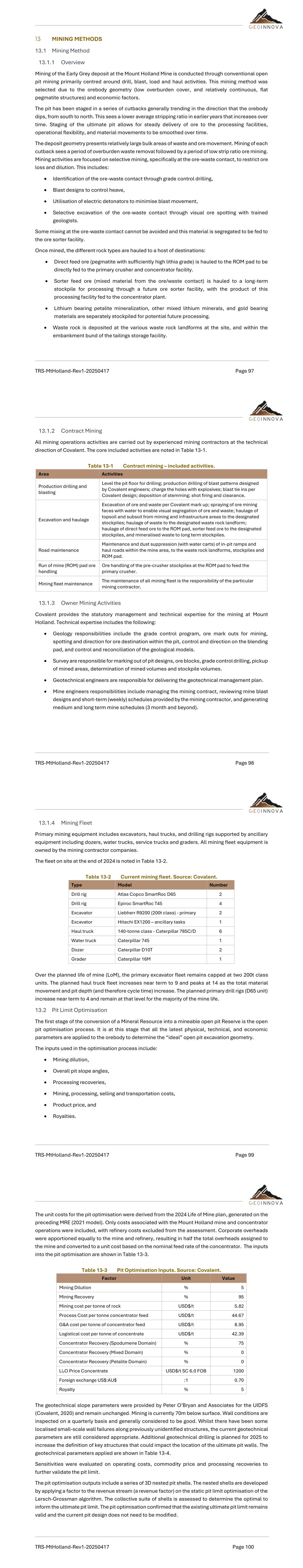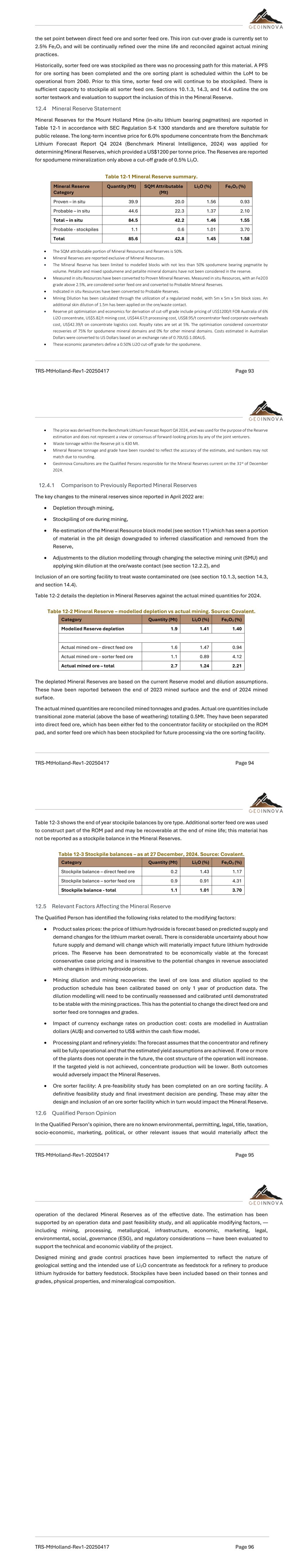 TRS-MTHolland-Rev1-20250417 Page145通过爬坡实现的绩效和改进举措支持了这样一种观点,即集中器假设足以支持Reserve定义。22.1.4环境、社会和治理在环境研究、许可、计划以及与当地团体的关系方面,项目提交了符合既定内容和标准的环境影响评估(环评),以及西澳大利亚现行环境法规的法律要求。项目批复已收到,项目运行中。此外,该项目承诺采取一些正在进行的监测措施(包括地下水采样、土壤分析和植被健康监测),以检测由于项目实施而对环境产生的任何影响。这将允许项目所有者在发现项目相关影响的不太可能的情况下实施控制和缓解措施。QP认识到,要在矿产储量的10年之后开采到矿山的完整寿命,还需要进一步的批准。预计Mine Life of Mine项目超过前10年的所有影响都可以按要求轻松管理和抵消。矿山寿命采矿提案计划于2025年由Covalent提交。22.2主要风险QP确定的项目的主要风险概述如下。•产品销售价格:氢氧化锂和锂辉石精矿价格根据对锂市场整体预测的供需变化进行预测。未来供需将如何变化存在相当大的不确定性,这可能会对未来价格产生重大影响。储量估计可能对与氢氧化锂和锂辉石精矿价格变化相关的收入重大变化很敏感。•货币汇率对生产成本的影响:成本以澳元(AU $)为模型,在现金流模型中转换为美元(US $)。•资源:虽然矿产资源已被广泛钻探和测试,矿化的性质是一致的,并且显然很好理解,但存在矿产资源中所含金属被错误估计、冶金性能不能完全代表整个岩体以及无法提取所报告的价值的风险。•采矿稀释和采矿回收:对适用于储备金的矿石损失和稀释水平进行了调整,以更好地与采矿实践保持一致。与大约6个月的开采新鲜矿石的对账数据有限。如果无法达到计划的选择性水平,很可能会出现分选机进料矿石比例增加而直接进料矿石相应减少的情况,从而导致加工成本上升,并降低冶金回收率,因为更多的矿石通过矿石分选设施TRS-MTHolland-Rev1-20250417提前于选矿厂进行处理。其他锂矿存在稀释的潜在风险,如透辉石,因此矿物学表征和定界有待改进。•加工厂和精炼厂产量:预测假设选矿厂、矿石分选设施和精炼厂将完全投入运营,并实现估计产量假设。这些工厂的计划绩效指标尚未实现。如果未来有一个或多个工厂没有按设计运行,或者没有实现任何目标产量,矿产储量和估计的经济结果将受到不利影响。•运营风险:存在一系列潜在的运营风险,从无法雇用、培训和留住开展运营所需的工人和专业人员,到管理不善。许多类似的行动都在西澳大利亚进行,没有理由相信这些风险因素无法消除。•可能对运营产生负面影响的异常天气事件或气候变化的影响。•不可预见的重大事件,包括像新冠肺炎这样的大流行事件和影响市场的战争情景。22.3结论Mount Holland矿山和选矿厂项目目前已投入运营,具备可研、 建设和调试现已全部完成。该炼油厂正处于建设和调试的后期阶段,计划于2025年开始生产。合资格人士认为,就申报的矿产资源和储量估算而言,所积累的现有勘探数据是可靠和充分的。该报告是根据SEC新的采矿规则根据第1300分项和S-K条例第601(96)(b)(iii)项编制的资源和储量分类。TRS-MTHolland-Rev1-20250417第147页建议在矿山运营的现阶段没有给出建议。TRS-MTHolland-Rev1-20250417 page148 references Ahmat,A.(1986)。西澳大利亚南十字省绿岩带的变质模式。西澳大利亚地质学会报告,19,1-21。对标矿产情报。(2024).锂预测| 2024年第四季度。对标矿产情报。核心锂。(2024).Finnis矿产资源增长58%。ASX:CXO公告。2024年4月11日。Adelaide:Core Lithium。共价。(2020).更新了综合确定可行性研究(UIDFS)。珀斯:共价锂。316页。共价。(2021).矿山计划优化研究。珀斯:共价锂。克里尔斯科。(2024).矿产储量委员会国家报告标准(CRIRSCO)。(2024).勘探目标、勘探结果、矿产资源和mienral储量公开报告的国际报告模板(2024年6月版)。检索自https://www.crirsco.com/DMIRS。(2018).1:500000状态解释基岩地质(DMIRS-016)。GeoInnova。(2021).UIDFS的机会和风险Mt. Holland项目地质、矿产资源和储量。圣地亚哥:GeoInnova。GeoInnova。(2025).Memorandom:Mt Holland的抽样议定书审查。圣地亚哥:GeoInnova。GeoInnova。(2025).矿产资源估算,MT Holland矿(第595号报告)。圣地亚哥:GeoInnova。地下水资源管理。(2014).蓝脉水文地质桌面研究。悉尼:地下水资源管理。地下水资源管理。(2017).Mount Holland:2017年2月空运测试汇总结果。Perth:Kidman Resources的地下水资源管理,2017年3月8日。10页。JORC。(2012).澳大利亚勘探结果、矿产资源和矿石储量报告规范。澳大利亚联合矿石储量委员会。Kidman Gold Pty Ltd.(2017)。环境审查文件,Earl Grey Lithium项目。1986年《环境保护法》和1999年《环境保护和生物多样性保护法》提交。墨尔本:基德曼资源。基德曼资源。(2018).Kidman Resources宣布完成Kwinana锂精炼厂PFS和更新的矿山和选矿厂范围研究。墨尔本:ASX公告Kidman Resources。2018年10月22日。