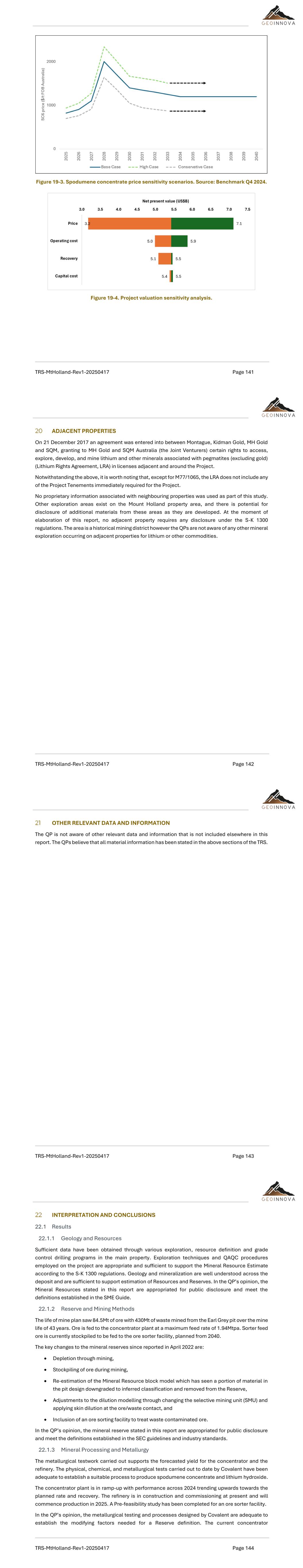 TRS-MTHolland-Rev1-20250417第141页图19-3。锂辉石精矿价格敏感情景。资料来源:Benchmark Q4 2024。图19-4。项目估值敏感性分析。TRS-MTHolland-Rev1-20250417 page142 adjacent properties于2017年12月21日,Montague、Kidman Gold、MH Gold和SQM签订了一项协议,授予MH Gold和SQM Australia(联合风险投资人)在项目附近和周围的许可证中获得、勘探、开发和开采锂和与伟晶岩相关的其他矿物(不包括黄金)(锂权协议,LRA)的某些权利。尽管如此,值得注意的是,除M77/1065外,LRA不包括项目立即需要的任何项目矿权。本研究未使用与相邻属性相关的专有信息。Mount Holland物业区域还存在其他勘探区域,随着这些区域的开发,有可能披露来自这些区域的额外材料。在本报告阐述之时,没有任何相邻物业要求根据S-K 1300法规进行任何披露。该地区是一个历史悠久的矿区,但QP不知道在锂或其他商品的相邻矿区发生任何其他矿产勘探。TRS-MTHolland-Rev1-20250417第143页其他相关数据和信息QP不知道本报告其他部分未包含的其他相关数据和信息。QP认为,所有重要信息已在TRS的上述部分中说明。TRS-MTHolland-Rev1-20250417第144页解释和结论22.1结果22.1.1通过对主要矿区的各种勘探、资源界定和品位控制钻探方案,获得了充足的地质和资源数据。该项目采用的勘探技术和QAQC程序是适当的,足以支持根据S-K1300法规进行的矿产资源估算。地质和矿化在整个矿床中都很好地了解,足以支持资源和储量的估算。QP认为,本报告中所述的矿产资源适合公开披露,并符合《中小企业指南》中确立的定义。22.1.2储量和采矿方法矿山寿命计划在43年的矿山寿命中,从Earl Grey矿坑开采出84.5m的矿石和430m的废料。矿石以1.94MTPA的最大投料速率被送入选矿厂。分选机进料矿石目前正在储存,将被送入矿石分选机设施,计划从2040年开始。自2022年4月报告以来,矿产储量的关键变化是:•通过采矿消耗,•在采矿期间储存矿石,•重新估计矿产资源区块模型,该模型已将矿坑设计中的部分材料降级为推断分类并从储量中移除,•通过改变选择性采矿单元(SMU)和在矿石/废物接触处应用表皮稀释调整稀释模型,以及•纳入矿石分选设施以处理受污染的废料矿石。在QP看来,这份报告中所述的矿产储量适合公开披露,并符合SEC指南和行业标准中确立的定义。22.1.3选矿和冶金所开展的冶金测试工作支持选矿厂和精炼厂的预测产量。迄今为止,Covalent进行的物理、化学和冶金测试已足以建立生产锂辉石精矿和氢氧化锂的合适工艺。选矿厂正处于产能提升阶段,2024年的业绩趋势向上,达到计划的速度和恢复。该炼油厂目前正在建设和调试中,将于2025年开始生产。已完成一项矿石分选机设施的预可行性研究。QP认为,Covalent设计的冶金测试和流程足以确定储量定义所需的修正因素。目前的集中器