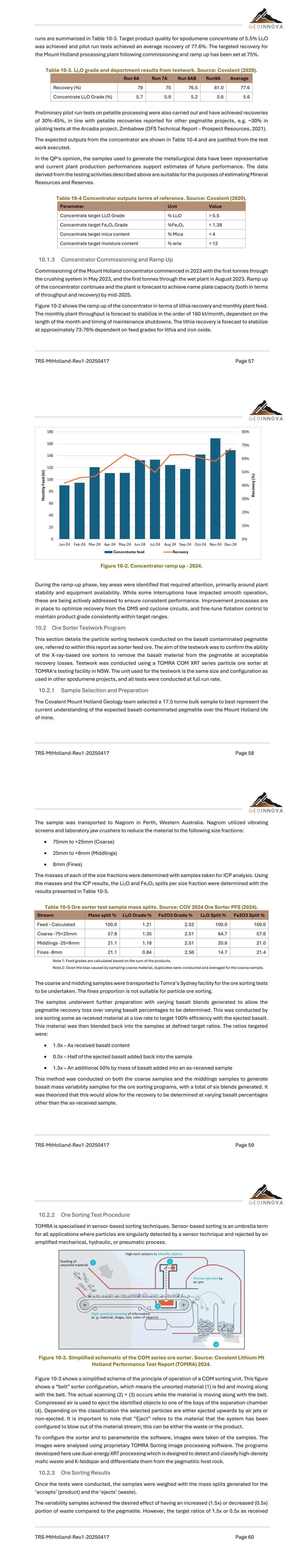 TRS-MTHolland-Rev1-20250417第57页运行情况汇总于表10-3。实现了5.5% Li-2O锂辉石精矿目标产品质量及中试平均回收率77.6%。Mount Holland加工厂在投产和产能提升后的目标回收率定为75%。表10-3。Li2O等级和仪态结果来自测试工作。资料来源:Covalent(2020)。Run 6A Run 7A Run 8AB Run9A平均回收率(%)787576.58 1.07 7.6精矿Li2O品位(%)5.7 5.9 5.25.65.6 5.6对透辉石加工也进行了初步中试,已实现30%-45 %的回收率,与其他伟晶岩项目报告的透辉石回收率一致,例如在津巴布韦Arcadia项目的中试中约为30%(DFS技术报告– Prospect Resources,2021)。集中器的预期输出如表10-4所示,并从执行的测试工作中得到证明。QP认为,用于生成冶金数据的样本具有代表性,目前的工厂生产业绩支持对未来业绩的估计。从上述测试活动中得出的数据适用于估算矿产资源和储量的目的。表10-4集中器输出职权范围。资料来源:Covalent(2020)。参数单位值精矿靶材Li2O品位% Li2O > 5.5精矿靶材Fe2O3品位% Fe2O3 < 1.39精矿靶材云母含量%云母< 4精矿靶材含水量% w/w < 1210.1.3 Mount Holland选矿厂的选矿厂调试和加速调试于2023年开始,第一吨于2023年5月通过破碎系统,第一吨于2023年8月通过湿法装置。选矿厂的产能提升仍在继续,预计该工厂将在2025年年中实现铭牌产能(无论是在吞吐量还是恢复方面)。图10-2显示了选矿厂在锂回收和每月工厂进料方面的提升。预计月度工厂吞吐量将稳定在160kt/月左右,具体取决于月长和检修停工时间。预计锂矿回收率将稳定在约73-76 %,具体取决于锂矿和氧化铁的进料等级。TRS-MTHolland-Rev1-20250417第58页图10-2。集中器爬坡-2024年。在产能提升阶段,确定了需要关注的关键领域,主要围绕工厂稳定性和设备可用性。虽然一些中断影响了平稳运行,但正在积极解决这些问题,以确保性能始终如一。改进流程已经到位,以优化DMS和旋风回路的回收,并微调浮选控制,以将产品等级始终保持在目标范围内。10.2矿石分选机测试工作程序本节详细介绍了对受玄武岩污染的伟晶岩矿进行的颗粒分选测试工作,本报告中将其称为分选机进料矿石。测试工作的目的是确认基于X射线的矿石分选机以可接受的回收损失从伟晶岩中去除玄武岩材料的能力。测试工作是在TOMRA位于新南威尔士州的测试设施中使用TOMRA COM XRT系列颗粒矿石分选机进行的。用于测试工作的单元与其他锂辉石项目中使用的相同尺寸和配置,所有测试均以全速进行。10.2.1样品选择和制备共价荷兰山地质团队选择了一个17.5吨的散装样品,以最好地代表目前对预期的荷兰山矿山寿命上的玄武岩污染伟晶岩的理解。TRS-MTHolland-Rev1-20250417第59页样品被运往西澳大利亚珀斯的Nagrom。Nagrom利用振动筛和实验室颚式破碎机将材料缩小到以下尺寸分数:• 75mm至+ 25mm(粗)• 25mm至+ 8mm(中)• 8mm(细)每个尺寸分数的质量是用为ICP分析而采集的样品确定的。使用质量和ICP结果,用表10-5中所示的结果确定了每个尺寸分数的Li2O和Fe2O3分裂。表10-5矿石分选机试验样品质量分裂。资料来源:COV 2024矿石分选机PFS(2024)。流质量分割% Li2O品级% Fe2O3品级% Li2O分割% Fe2O3分割%进料-计算100.01.21 2.52 100.0 100.0粗-75 + 25mM57.8 1.35 2.51 64.75 7.6中间-25 + 8mM21.1 1.18 2.51 20.62 1.0细料-8mM21.1 0.84 2.56 14.72 1.4注1:进料品级按产品之和计算。注2:鉴于对粗料取样造成的偏差, 对粗样本进行了重复和平均。粗样品和中等样品被运送到Tomra的悉尼工厂,以进行矿石分选测试。粉矿比例不适合颗粒矿石分选。样品经过进一步制备,生成了不同的玄武岩混合物,以便确定不同玄武岩百分比下的伟晶岩回收损失。这是通过以低速率将一些作为接收材料的矿石分选来进行的,目的是利用喷出的玄武岩实现100%的效率。然后以规定的目标比例将这种材料混入样品中。目标比率为:• 1.0x –按接收到的玄武岩含量• 0.5x –一半的喷射玄武岩被添加回样品中• 1.5x –按质量计额外50%的玄武岩被添加到按接收到的样品中。该方法对粗样品和中间样品进行,以生成玄武岩质量变异性样品,用于矿石分选程序,共生成六种混合物。据推测,这将允许在不同的玄武岩百分比下确定回收率,而不是按收到的样本。TRS-MTHolland-Rev1-20250417第6010.2.2页矿石分选测试程序TOMRA专门从事基于传感器的分选技术。基于传感器的分选是所有应用的总称,其中颗粒被传感器技术奇异地检测到,并被放大的机械、液压或气动过程拒绝。图10-3。COM系列矿石分选机简化示意图。来源:共价锂MT Holland Performance Test Report(TOMRA)2024。图10-3展示了COM分拣单元操作原理的简化方案。这张图展示了一个“皮带”分拣机配置,这意味着未分拣的物料(1)被喂入并随着皮带移动。实际扫描(2)+(3)发生在材料沿着皮带移动的过程中。压缩空气用于将识别出的物体喷射到分离室(4)的其中一个舱间。根据分类的不同,选定的粒子要么被空气喷射器向上喷出,要么不被喷出。需要注意的是,“弹出”指的是系统已配置为从材料流中吹出的材料;这可以是废物,也可以是产品。为了配置分类器和参数化软件,对样本进行了图像拍摄。这些图像是使用专有的TOMRA Sorting图像处理软件进行分析的。这里开发的程序使用双能XRT处理,旨在检测和分类高密度镁铁质废料和钾长石,并将它们与伟晶母岩区分开来。10.2.3矿石分选结果一旦进行测试,就用为‘接受’(产品)和‘抛射物’(废物)产生的质量分割物对样品进行称重。与