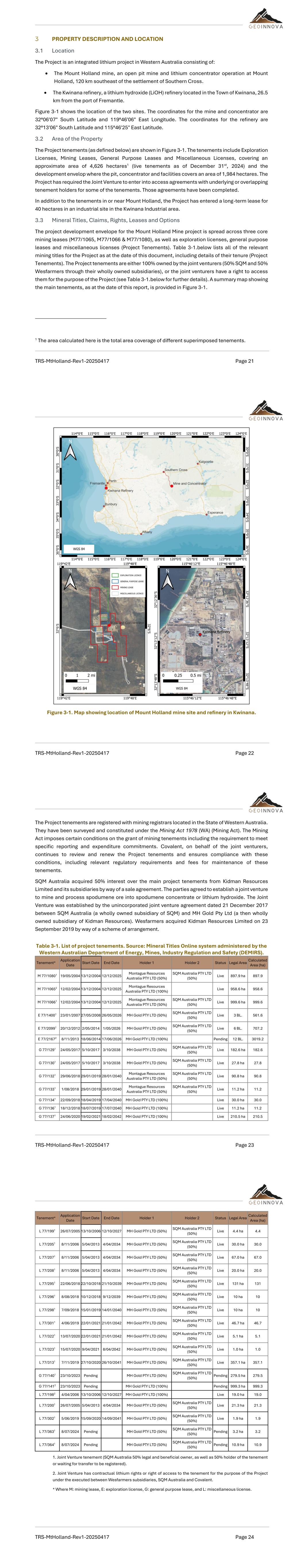 TRS-MTHolland-Rev1-20250417第21页物业描述和位置3.1位置该项目是西澳大利亚的一个综合锂项目,包括:• Mount Holland矿,这是一个位于Mount Holland的露天矿和锂选矿厂,位于Southern Cross定居点东南120公里处。• Kwinana精炼厂,氢氧化锂(LiOH)精炼厂,位于Kwinana镇,距离弗里曼特尔港26.5公里。图3-1显示了这两个站点的位置。矿山和选矿厂坐标为南纬32 ° 06‘07“,东经119 ° 46’06”。炼油厂坐标为南纬32 ° 13‘06“,东纬115 ° 46’25”。3.2物业面积项目物业单位(定义见下文)见图3-1。物业单位包括勘探许可证、采矿租约、一般用途租约及杂项许可证,面积约为4,626公顷1(截至2024年12月31日的活物业单位),而矿坑、选矿厂及设施的发展包围区面积为1,984公顷。该项目已要求合营公司就部分物业单位与基础或重迭物业单位持有人订立准入协议。这些协议已经完成。除了荷兰山或其附近的物业单位外,该项目已在Kwinana工业区的一处工业用地进入40公顷的长期租约。3.3矿业权、债权、权利、租约和期权Mount Holland矿项目的项目开发包络分布在三个核心采矿租约(M77/1065、M77/1066和M77/1080),以及勘探许可证、一般用途租约和杂项许可证(项目矿权)。下表3-1列出截至本文件日期该项目的所有相关矿业权,包括其使用权(项目矿权)的详细信息。项目物业单位或由合营公司100%拥有(50% SQM及50% Wesfarmers透过其全资附属公司),或合营公司有权为项目目的取得其物业单位(更多详情见下文表3-1)。图3-1提供了显示截至本报告日期的主要物业单位的概要地图。1此处计算的面积为不同叠加物业单位的总面积覆盖率。TRS-MTHolland-Rev1-20250417第22页图3-1。显示Kwinana的Mount Holland矿址和炼油厂位置的地图。TRS-MTHolland-Rev1-20250417第23页项目矿权在位于西澳大利亚州的采矿登记处登记。它们已根据1978年《矿业法》(WA)(Mining Act)进行了调查和组建。《矿业法》对授予采矿权规定了某些条件,包括满足特定报告和支出承诺的要求。Covalent代表合营企业继续审查和更新项目物业单位,并确保遵守这些条件,包括相关监管要求和维护这些物业单位的费用。SQM Australia透过出售协议向Kidman Resources Limited及其附属公司收购主要项目物业的50%权益。各方同意成立合资企业,将锂辉石矿开采并加工成锂辉石精矿或氢氧化锂。合资公司由SQM Australia(SQM的全资附属公司)与MH Gold Pty Ltd(当时Kidman Resources的全资附属公司)于2017年12月21日订立的非法人合资协议成立。Wesfarmers于2019年9月23日以安排计划的方式收购Kidman Resources Limited。表3-1。项目物业单位名单。资料来源:西澳能源部管理的Mineral Titles Online System,Mines, 行业监管和安全(DEMIRS)。物业单位*申请日期开始日期结束日期持有人1名持有人2名地位法定面积计算面积(公顷)M77/1080119/05/200413/12/200412/12/2025 Montague Resources Australia PTY LTD(50%)SQM Australia PTY LTD(50%)Live 897.9 ha 897.9 m77/1065212/02/200413/12/200412/12/2025 Montague Resources Australia PTY LTD(100%)Live 958.6 ha 958.6 m77/1066112/02/200413/12/200412/12/2025 Montague Resources Australia PTY LTD(50%)SQM Australia TERM4 LTD(50%)Live 999.6 ha 999.6 e77/1400123/0 156 1.6 E 77/2099120/12/20122/05/20141/05/2026 MHH Gold PTY LTD(50%)SQM Australia PTY LTD(50%)Live 6 BL。707.2 E 77/216728/11/201318/06/201417/06/2026 MHH Gold PTY LTD(100%)待发12 BL。3019.2 G 77/129124/05/20175/10/20173/10/2038 MHH Gold PTY LTD(50%)SQM Australia PTY LTD(50%)Live 182.6 ha 182.6 G 77/130124/05/20175/10/20173/10/2038 MHH Gold PTY LTD(50%)SQM Australia PTY LTD(50%)Live 27.8 ha 27.8 G 77/132129/06/201829/01/201928/01/2040 Montague Resources Australia PTY LTD(50%)SQM Australia PTY LTD(50%)Live 90.8 ha 90.8 G 77/13311/08/Gold PTY LTD(100%)Live 11.2 ha 11.2 g 77/137124/06/20219/02/202118/02/2042 mH Gold PTY LTD(100%)Live 210.5 ha 210.5 TRS-MTHolland-Rev1-20250417 page 24 tenement*申请日期开始日期结束日期持有人1名持有人2名地位法定面积计算面积(公顷)L77/199126/07/200513/10/200612/10/2027 MHH Gold PTY LTD(50%)SQM Australia PTY LTD(50%)Live 4.4 ha 4.4 L77/20518/11/2006/04/20134/04/2034 MHH Gold丨PTY PTY LTD(50%)SQM Australia PTY LTD(50%)Live 30.0 ha 30.0 L 77/20718/11/2006/04/20134/04/2034 MHH Gold 丨PTY LTD(50%)SQM Australia TERM5 LTD(50%)Live 67.0 ha 30.0 h 30.0 h 30.0 h 30.0 h 30.0 h 30 h 30 h 30 h 30 h 30 h 30 h 30 h 30 h 30L 77/20818/11/2006/05/04/20134/04/2034 MHH Gold PTY LTD(50%)SQM Australia PTY LTD(50%)Live 20.0 ha 20.0 L 77/295122/06/201822/10/201821/10/2039 MHH Gold PTY LTD(50%)SQM Australia PTY LTD(50%)Live 131 ha 131 L 77/29618/08/201810/12/20189/12/2039 MHH Gold PTY LTD(50%)SQM Australia PTY LTD(50%)Live 10 ha 10 L 77/29817/09/201815/01/201914/2 1/01/2042 MHH Gold PTY LTD(50%)SQM Australia PTY LTD(50%)Live 5.1 ha 5.1 L 77/323115/07/20209/04/20218/04/2042 MHH Gold PTY LTD(50%)SQM Australia PTY LTD(50%)Live 1.0 ha 1.0 L 77/31317/11/201927/10/202026/10/2041 MHH Gold PTY LTD(50%)SQM Australia 丨TERM5 LTD(50%)Live 357.1 ha 357.1 g 77/140123/10/2023待定MHH Gold PTY LTD(50%)SQM77/200126/07/20055/04/20134/04/2034 MHH Gold PTY LTD(50%)SQM Australia PTY LTD(50%)Live 21.3 ha 21.3 L 77/30215/06/201915/09/202014/09/2041 MHH Gold PTY LTD(50%)SQM Australia PTY LTD(50%)Live 1.9 ha 1.9 L 77/36318/07/2024 Pending MHH Gold TERM0 LTD(50%)SQM Australia PTY LTD(50%)Pending 3.2 ha 3.2 L 77/36418/07/2024 Pending MHH Gold PTY LTD合营物业单位(SQM Australia 50%法定及实益拥有人,以及物业单位50%持有人或等待转让登记)。2.合资企业拥有Wesfarmers子公司、SQM Australia和Covalent之间为项目目的而签订的合同锂权或使用权。*其中M:采矿租赁,E:勘探许可证,G:通用租赁,L:杂项许可证。