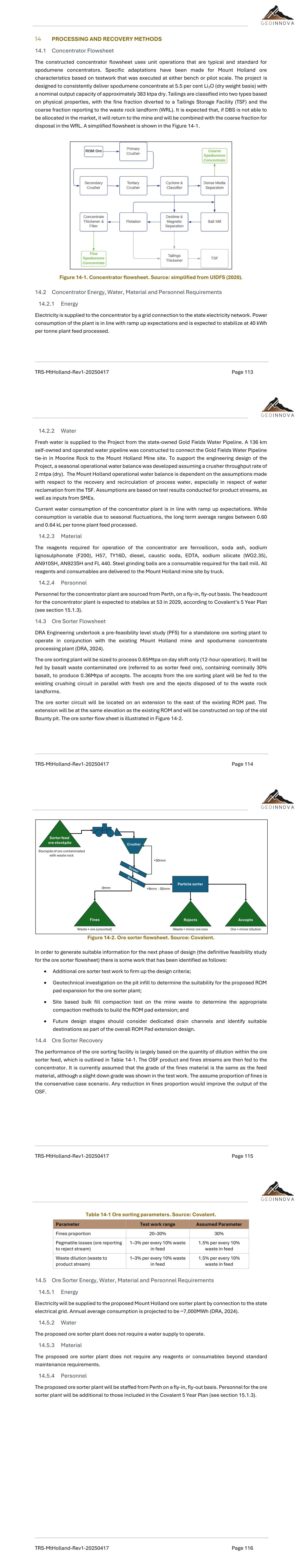 TRS-MTHolland-Rev1-20250417第113页处理和回收方法14.1选矿厂流程图构建的选矿厂流程图使用的是锂辉石选矿厂的典型和标准单元操作。根据在台架或中试规模执行的测试工作,对荷兰山矿石特征进行了具体的调整。该项目旨在始终如一地以5.5%的Li2O(干重基准)交付锂辉石精矿,名义产出能力约为383ktpa干。尾矿根据物理性质分为两种类型,其中细小部分转移到尾矿储存设施(TSF),粗大部分报告到废石地貌(WRL)。预计若市场无法分配到DBS,则将返回矿山,并与粗馏分结合在WRL中进行处置。简化的流程图如图14-1所示。图14-1。集中器流程图。资料来源:简化自UIDFS(2020)。14.2集中器能源、用水、材料和人员要求14.2.1能源电力通过与国家电力网络并网的方式供应给集中器。该工厂的电力消耗符合产能提升预期,预计将稳定在每吨工厂饲料加工40千瓦时。TRS-MTHolland-Rev1-20250417第11414.2.2页水务淡水由国有金田输水管道供应给项目。建设136公里自有运营输水管道,连接Moorine Rock的金田输水管道搭接至Mount Holland矿址。为支持该项目的工程设计,假设破碎机吞吐量为2mtpa(干),则制定了季节性作业水平衡。荷兰山运营水平衡取决于对工艺水的回收和再循环所做的假设,特别是在从TSF回收水方面。假设基于针对产品流进行的测试结果,以及中小企业的投入。当前选矿厂用水量符合爬坡预期。虽然消费量因季节性波动而存在变数,但长期平均水平在每吨植物饲料加工量0.60至0.64千升之间。14.2.3材料选矿厂运行所需试剂为硅铁、纯碱、木质素磺酸钠(F200)、H57、TY16D、柴油、烧碱、EDTA、硅酸钠(WG2.35)、AN910SH、AN923SH和FL 440。钢磨球是球磨机所需的消耗品。所有试剂和耗材都用卡车运到Mount Holland矿场。14.2.4选矿厂的人事人员从珀斯采购,以飞入飞出为基础。根据Covalent的5年计划(见第15.1.3节),预计2029年选矿厂的员工人数将稳定在53人。14.3矿石分选机流程图DRA Engineering对独立的矿石分选厂与现有的Mount Holland矿山和锂辉石精矿加工厂(DRA,2024年)联合运营进行了预可行性水平研究(PFS)。矿石分选厂的规模将仅为白班处理0.65Mtpa(12小时作业)。它将由玄武岩废料污染矿石(简称分选器进料矿)进料,标称含30%玄武岩,产生0.36mtpa的承兑。来自矿石分选厂的接受将与新鲜矿石和处置到废石地貌的喷射物平行输入现有的破碎回路。矿石分选机电路将位于现有ROM垫以东的延伸部分。扩建部分将与现有ROM的海拔高度相同,将建在旧的Bounty坑的顶部。矿石分选机流程图如图14-2所示。TRS-MTHolland-Rev1-20250417第115页图14-2。矿石分选机流程图。资料来源:Covalent。为了产生下一阶段设计的合适信息(矿石分选机流程图的确定可行性研究)有一些工作已确定如下:•额外的矿石分选机测试工作,以巩固设计标准;•对矿坑填充物进行岩土工程调查,以确定是否适合为矿石分选厂提议的ROM垫扩建;•对矿山废料进行基于现场的散装填料压实测试,以确定建造ROM垫扩建的适当压实方法;•未来的设计阶段应考虑专用排水通道,并确定合适的目的地,作为ROM垫整体扩建设计的一部分。14.4矿石分选机回收矿石分选设施的性能主要基于矿石分选机进料内的稀释量,详见表14-1。OSF产品和粉末流随后被送入选矿厂。目前假定粉末料的品级与进料相同, 尽管在测试工作中显示出轻微的下降等级。假设罚款比例是保守的案例情景。罚款比例的任何降低都将改善OSF的产出。TRS-MTHolland-Rev1-20250417第116页表14-1矿石分选参数。资料来源:Covalent。参数测试工作范围假设参数细粉比例20 – 30% 30%伟晶岩损失(矿石报告到废料流)1 – 3%/饲料中每10%废物1.5%/饲料中每10%废物废物稀释(废物到产品流)1 – 3%/饲料中每10%废物1.5%/饲料中每10%废物14.5矿石分选机能源、水、材料和人员要求14.5.1能源电力将通过连接国家电网的方式提供给拟议的Mount Holland矿石分选厂。年平均消费量预计为~7,000MWh(DRA,2024年)。14.5.2供水拟建的矿石分选厂不需要供水即可运行。14.5.3材料拟建的矿石分选厂不需要任何超出标准维护要求的试剂或耗材。14.5.4人员拟建的矿石分选厂将从珀斯以飞入飞出的方式配备人员。矿石分选厂的人员将在共价5年计划(见第15.1.3节)中包括的人员之外增加。
