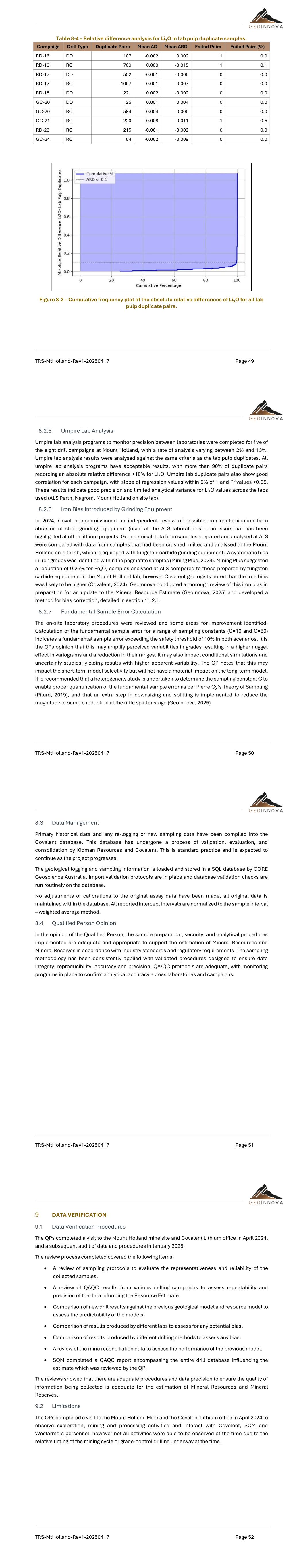 TRS-MTHolland-Rev1-20250417第49页表8-4 –实验室纸浆重复样品中Li ↓ O的相对差异分析。Campaign drill type duplicate pairs mean AD mean ARD failed pairs failed pairs(%)RD-16 DD107-0.002 0.002 10.9 RD-16 RC 7690.000-0.015 10.1 RD-17 DD552-0.001-0.006 00.0 RD-17 RC 10070.001-0.007 00.0 RD-18 DD2210.002-0.002 00.0 GC-20 DD250.00 10.00 400.0 GC-20 RC 5940.00 40.00 60.0 GC-21 RC 2200.00 80.01 110.5 RD-23 RC 215-0.001-0.002 00.0 GC-24 RC 84-0.002-0.009 00.0图8-2 – Li ↓ O绝对相对差异的累计频率图为所有实验室纸浆重复对。TRS-MTHolland-Rev1-20250417第50页8.2.5 Umpire Lab Analysis Umpire实验室分析程序用于监测实验室之间的精度,在荷兰山的八次钻探活动中有五次完成了分析程序,分析率在2%至13%之间变化。Umpire实验室分析结果按照与实验室纸浆复制品相同的标准进行分析。所有的裁判实验室分析程序都有可接受的结果,超过90%的重复对记录了Li2O的绝对相对差异< 10%。Umpire lab复制对在每个战役中也表现出良好的相关性,回归值的斜率在1的5%以内,R2值> 0.95。这些结果表明,在所使用的实验室(ALS Perth、Nagrom、Mount Holland on site lab)中,Li2O值具有良好的精度和有限的分析方差。8.2.6研磨设备在2024年引入了铁偏置,Covalent委托对钢磨磨设备(ALS实验室使用)磨损可能造成的铁污染进行了独立审查——这一问题在其他锂项目中得到了强调。在ALS制备和分析的样品的地球化学数据与在配备碳化钨研磨设备的Mount Holland现场实验室进行破碎、研磨和分析的样品数据进行了比较。在伟晶岩样品中发现了铁品位的系统性偏差(Mining Plus,2024年)。Mining Plus建议,与Mount Holland实验室的碳化钨设备制备的样品相比,在ALS分析的Fe2O3样品减少0.25%,但共价地质学家指出,真正的偏差可能更高(Covalent,2024年)。GeoInnova对这种铁偏差进行了彻底审查,以准备更新矿产资源估算(GeoInnova,2025年),并开发了偏差校正方法,详见第11.2.1节。8.2.7基本样本误差计算对现场实验室程序进行了审查,并确定了一些需要改进的地方。计算一系列采样常数(C = 10和C = 50)的基本样本误差表明,在这两种情况下,基本样本误差都超过了10%的安全阈值。QPs认为,这可能会放大等级的感知差异,从而导致变异函数的更高的金块效应和范围的缩小。它还可能影响条件模拟和不确定性研究,产生具有更高表观变异性的结果。QP指出,这可能会影响短期模型的选择性,但不会对长期模型产生实质性影响。建议进行异质性研究,以确定采样常数C,以便能够根据Pierre Gy的采样理论(Pitard,2019)对基本样本误差进行适当量化,并实施额外的缩小尺寸和拆分步骤,以减少riffle分频器阶段的样本减少幅度(GeoInnova,2025)TRS-MTHolland-Rev1-20250417第51页8.3数据管理原始历史数据和任何重新测井或新的采样数据已编入共价数据库。这个数据库经历了Kidman Resources和Covalent的验证、评估和整合过程。这是标准做法,预计将随着项目的进展而继续下去。地质测井和采样信息由CORE Geoscience Australia加载并存储在SQL数据库中。导入验证协议已到位,数据库验证检查在数据库上例行运行。未对原始化验数据进行调整或校准,所有原始数据均保持在数据库内。所有报告的截距区间均归一化为样本区间–加权平均法。8.4合资格人士意见合资格人士认为,所实施的样本制备、安全性、分析程序均充分、适当,以支持按照行业标准和监管要求进行矿产资源和矿产储量的估算。采样方法一直采用经过验证的程序,旨在确保数据完整性、可重复性、准确性和精准性。QA/QC协议已足够, 制定了监测计划,以确认跨实验室和活动的分析准确性。TRS-MTHolland-Rev1-20250417第52页数据验证9.1数据验证程序QP于2024年4月完成了对Mount Holland矿址和共价锂办公室的访问,随后于2025年1月完成了对数据和程序的审计。完成的审查过程涵盖以下项目:•对采样方案进行审查,以评估所采集样本的代表性和可靠性。•对各种钻探活动的QAQC结果进行审查,以评估为资源估算提供信息的数据的重复性和精确度。•将新的钻探结果与以前的地质模型和资源模型进行比较,以评估模型的可预测性。•比较不同实验室产生的结果,以评估是否存在任何潜在的偏差。•比较不同钻探方法产生的结果,以评估任何偏差。•审查地雷调节数据,以评估先前模型的性能。• SQM完成了一份QAQC报告,其中包括影响QP审查的估计的整个钻探数据库。审查表明,有足够的程序和数据精确度,以确保所收集的信息质量足以用于矿产资源和矿产储量的估算。9.2局限性QP于2024年4月完成了对Mount Holland矿和Covalent Lithium办公室的访问,以观察勘探、采矿和加工活动,并与Covalent、SQM和Wesfarmers人员互动,但由于当时正在进行的采矿周期或品位控制钻探的相对时间,当时并非能够观察到所有活动。