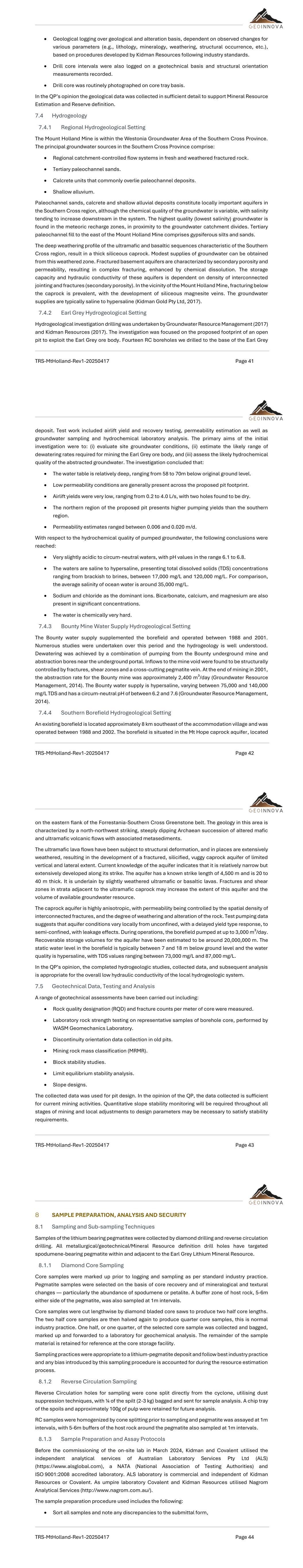 TRS-MTHolland-Rev1-20250417第41页•地质测井覆盖地质和蚀变基础,取决于观察到的各种参数(例如岩性、矿物学、风化、构造赋存等)的变化,基于Kidman Resources遵循行业标准开发的程序。•还根据岩土工程记录了钻芯层段,并记录了结构方向测量。•钻芯通常在岩芯托盘基础上拍摄。QP认为,地质数据收集得足够详细,以支持矿产资源估算和储量定义。7.4水文地质7.4.1区域水文地质设置Mount Holland矿山位于南十字省的Westonia地下水区域内。南十字省的主要地下水源包括:•新鲜和风化断裂岩石中的区域集水控制流量系统。•第三纪古航道砂层。•通常覆盖在古河道沉积物之上的钙质单元。•浅层冲积层。古河道砂岩、钙质和浅层冲积层构成了南十字地区局部重要的含水层,尽管地下水的化学质量是可变的,盐度在系统下游趋于增加。最高质量(最低盐度)的地下水位于大气补给区,靠近地下水集水区。荷兰山矿以东的第三纪古通道填充物由石膏粉砂和砂岩组成。南十字区特征性的超镁铁质和玄武质层序的深层风化剖面,造成厚厚的硅质盖层。从这个风化带可以获得少量的地下水供应。断裂基底含水层的特点是次生孔隙度和渗透率,导致复杂的压裂,化学溶解作用增强。这些含水层的库容和水力传导性取决于相互连接的节理和裂缝(次生孔隙度)的密度。在Mount Holland矿附近,盖层以下的压裂现象普遍,伴随着硅质菱镁矿脉的发展。地下水供应通常是从盐水到高盐水(Kidman Gold Pty Ltd,2017)。7.4.2 Earl Grey水文地质设置水文地质调查钻探由地下水资源管理(2017)和Kidman Resources(2017)承担。调查的重点是拟议的露天矿坑足迹,以开采Earl Grey矿体。我们在Earl Grey TRS-MTHolland-Rev1-20250417 Page42矿床的底部钻了14个RC钻孔。测试工作包括空运产量和回收测试、渗透率估算以及地下水采样和水化学实验室分析。初步调查的主要目的是:(i)评估现场地下水条件,(ii)估计开采Earl Grey矿体所需的脱水率可能范围,以及(iii)评估抽取的地下水可能的水化学质量。调查结论为:•地下水位较深,在原地面以下58-70m之间。•整个拟议的矿坑足迹普遍存在低渗透率条件。•空运产量非常低,从0.2到4.0升/秒不等,发现有两个洞是干的。•拟建矿坑的北部地区呈现出比南部地区更高的抽水产量。•渗透率估计值在0.006至0.020米/天之间。关于抽水地下水的水化学质量,得出以下结论:•极微酸性至环中性水域,pH值在6.1至6.8范围内。•海水为盐水至高盐水,呈现总溶解固体(TDS)浓度范围从微咸水到盐水,介于17000毫克/升和120000毫克/升之间。作为对比,海水的平均盐度在35000毫克/升左右。•钠和氯化物为主导离子。碳酸氢盐、钙和镁的含量也很高。•水在化学上非常坚硬。7.4.3 Bounty矿山供水水文地质设置Bounty供水补充了井田,于1988年至2001年间运营。在此期间进行了大量研究,水文地质学已为人们所熟知。脱水是通过Bounty地下矿井的抽水和地下入口附近的抽取孔相结合来实现的。流入矿井空隙被发现在结构上受到裂缝、剪切带和一条横切伟晶岩脉的控制。2001年开采结束时,Bounty矿的抽提率约为2,400 m丨/日(地下水资源管理,2014年)。富饶供水为高盐度,在7.5万至14万毫克/升TDS之间变化,环中性pH值在6.2至7.6之间(地下水资源管理, 2014).7.4.4南部井田水文地质设置现有的井田位于住宿村庄东南约8公里处,于1988年至2002年期间运营。钻井场位于Mt Hope盖层含水层,位于TRS-MTHolland-Rev1-20250417第43页,位于Forrestania-Southern Cross绿岩带东侧。这一地区的地质特征是呈西北偏北走向、陡峭倾斜的太古代蚀变镁铁质和超镁铁质火山流序列,伴有变质沉积物。超镁铁质熔岩流发生了结构性变形,并在一些地方广泛风化,导致了垂直和横向范围有限的断裂、硅化、洞洞式盖层含水层的发展。目前对含水层的了解表明,它相对狭窄,但沿其走向广泛发展。该含水层已知走向长度为4,500米,厚度为20至40米。它的下面是轻微风化的超镁铁质或玄武质熔岩。与超镁铁质盖层相邻的地层中的裂缝和剪切带可能会增加这一含水层的范围和可利用的地下水资源量。盖层含水层具有较强的各向异性,渗透率受互连裂缝空间密度、岩石风化蚀变程度的控制。测试抽水数据表明,含水层条件局部不同,从具有延迟产量类型响应的非密闭,到具有渗漏效应的半密闭。作业期间,该井田抽水量高达3000 m φ/天。据估计,含水层的可回收储存量约为20,000,000米。钻井田的静态水位一般在地面以下7至18米之间且水质为高盐度,TDS值在73,000毫克/升至87,000毫克/升之间。在QP看来,已完成的水文地质研究、收集的数据以及随后的分析适合于当地水文地质系统整体的低水文传导率。7.5岩土工程数据、测试和分析已开展一系列岩土工程评估,包括:•测量了岩石质量指定(RQD)和每米岩心的裂缝计数。• WASM地质力学实验室对井芯代表性样品进行实验室岩石强度测试。•旧矿坑中的不连续定向数据收集。•采矿岩体分类(MRMR)。• Block稳定性研究。•极限均衡稳定性分析。•斜坡设计。收集到的数据用于矿坑设计。QP认为,收集到的数据对于目前的采矿活动来说已经足够了。在采矿的所有阶段都需要定量的边坡稳定性监测,为满足稳定性要求,可能需要对设计参数进行局部调整。TRS-MTHolland-Rev1-20250417第44页样品制备、分析和安全性8.1含锂伟晶岩的取样和分样技术样品采用金刚石钻孔和反