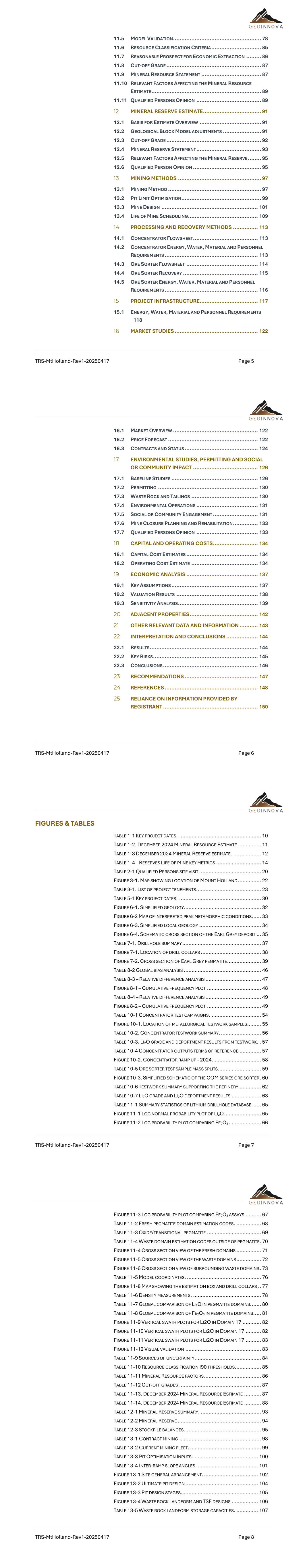 TRS-MTHolland-Rev1-20250417第511.5页模型验证.....................................................78 11.6资源分类标准.....................................85 11.7经济开采的合理前景.....................86 11.8分割级.....................................87 11.9矿产资源说明.....................................87 11.10影响矿产资源估算的相关因素....................................................................89 11.11合格人员意见.......................................89矿产储量估算...................................91 12.1估算依据方法......................................................97 13.2矿限优化......................................................99 13.3矿山设计......................................................10 113.4矿山排程寿命......................................109种处理和回收方法......................11 314.1浓缩器流程表......................................11 314.2浓缩器能源、水、材料和人员需求......................................................11 314.3矿石索特流程图......................................11 414.4矿石索特回收......................................11 514.5矿石索特能源,材料和人员需求118项市场研究......................................................12 2 TRS-MTHolland-Rev1-20250417第6页16.1市场概况...................................................12 2 16.2价格预测....................................................12 2 16.3合同和状况....................................124项环境研究, P E R M I T N GADSOCALOCOUYAC.................................... 12617.1BASLSUDS.................................... 12617.2G.................................... 13017.3WASOCKADALGS.................................... 13017.4VOALOAOS.................................... 13117.5SOCALOCOUYGAG.................... 13117.6CLOSULAGADHABLAO.................... 13317.7QUALFDSOO.................................... 133CAALADOAGCOSS.................... 13418.1CAALCOSSAS.................................... 13418.2OAGCOSSA.................................... 134COOCAALYSS.................................... 13719.1KYASUOS.................................... 13719.2VALUAOS.................................... 13819.13…………34FGU6-4.SCHACCOSSCOOFHALGYDOS...35ABL7-1.DLLHOLSUAY.................................... 37FGU7-1.LOCAOOFDLLCLLAS......................................38FGU7-2.COSSCOOFALGYGA......................39ABL8-2GLOBALBASAAALYSS......................................46ABL8-3 – LAVDFFCAALYSS......................................47FGU8-1 – CULAVFQUCYLO.......................48ABL8-4 – LAVDFFCAALYSS......................................49FGU8-2 – CULAVFQUCYLO.......................................49ABL10-1COCAOSCAGS.......................54FGU10......................86ABL11-12CU-OFFGADS...................................................87ABL11-13.DCB2024ALSOUCSA...................87ABL11-14.DCB2024ALSOUCSA......................88ABL12-1ALSVSUAY......................................93ABL12-2ALSV......................................................94ABL12-3SOCKLBALACS......................................95ABL13-1COACG......................................................98ABL13-2CUGFL.......................................99ABL13-3OSAOUS......................................100ABL13-4-ASLOAGLS......................................101FGU13-1SGALAG......................................102FGU13-2ULADSG......................104FGU13-3DSGSAGS