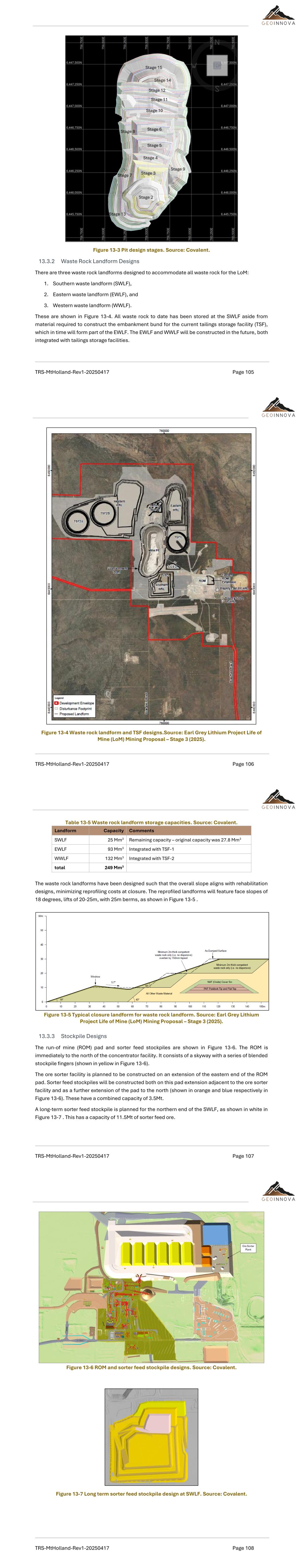 TRS-MTHolland-Rev1-20250417第105页图13-3坑设计阶段。资料来源:Covalent。13.3.2废石地貌设计有三种废石地貌设计可容纳LoM的所有废石:1。南方垃圾地貌(SWLF),2。东部垃圾地貌(EWLF),以及3。西部垃圾地貌(WWLF)。这些如图13-4所示。迄今为止,除了为目前的尾矿储存设施(TSF)建造堤岸外滩所需的材料外,所有废石都储存在SWLF中,这些材料将及时成为EWLF的一部分。未来将建设EWLF和WWLF,均与尾矿储存设施一体化。TRS-MTHolland-Rev1-20250417第106页图13-4废石地貌和TSF设计。来源:Earl Grey Lithium Project Life of Mine(LoM)Mining Proposal – Stage 3(2025)。TRS-MTHolland-Rev1-20250417第107页表13-5废石地貌储存能力。资料来源:Covalent。地貌容量评论SWLF 25 mm3剩余容量–原始容量为27.8 mm3 EWLF 93 mm3与TSF-1集成WWLF 132 mm3与TSF-2集成总计249 mm3废石地貌的设计使得整体斜坡与修复设计保持一致,最大限度地减少了关闭时的重新剖面成本。重塑后的地貌将以面坡18度、升降机20-25m、护堤25m为特征,如图13-5所示。图13-5废石地貌典型闭合地貌。资料来源:Earl Grey Lithium Project Life of Mine(LoM)Mining Proposal – Stage 3(2025)。13.3.3库存设计运行矿(ROM)垫和分选机饲料库存如图13-6所示。ROM就在选矿厂设施的北面。它由一条带有一系列混合库存手指的天桥组成(图13-6中以黄色显示)。矿石分选机设施计划在ROM垫东端的延伸上建造。分选机进料库存将在与矿石分选机设施相邻的这个垫层延伸部分以及作为垫层向北的进一步延伸部分建造(图13-6中分别以橙色和蓝色显示)。它们的总容量为3.5m。规划了SWLF北端的长期分拣机饲料储备,如图13-7中的白色所示。这具有11.5mt的分选进料矿能力。TRS-MTHolland-Rev1-20250417第108页图13-6 ROM和分选机进料堆设计。资料来源:Covalent。图13-7 SWLF长期分拣机进料库存设计。来源:Covalent。