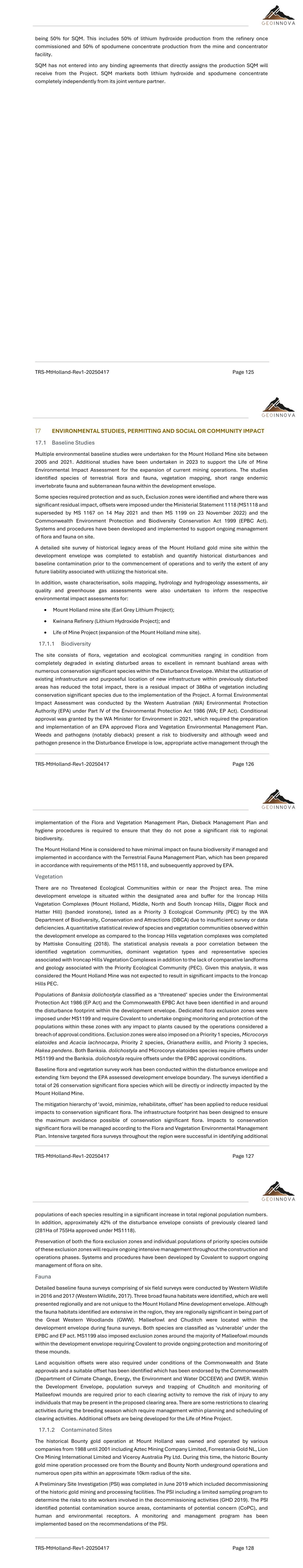 TRS-MTHolland-Rev1-20250417第125页SQM为50%。这包括投产后的炼油厂50%的氢氧化锂产量,以及矿山和选矿厂设施50%的锂辉石精矿产量。SQM没有订立任何直接转让生产SQM将从项目中获得的具有约束力的协议。SQM完全独立于其合资伙伴销售氢氧化锂和锂辉石精矿。TRS-MTHolland-Rev1-20250417第126页环境研究、许可和社会或社区影响17.1基线研究在2005年至2021年期间对荷兰山矿址进行了多项环境基线研究。2023年开展了更多研究,以支持矿山环境影响评估的寿命,以扩大当前的采矿作业。这些研究确定了发展范围内的陆地动植物物种、植被测绘、短程特有无脊椎动物和地下动物。一些物种需要保护,因此,确定了禁区,如果存在重大残留影响,则根据部长声明1118(MS1118,于2021年5月14日被MS 1167取代,然后于2022年11月23日被MS 1199取代)和《1999年联邦环境保护和生物多样性保护法》(EPBC法)实施抵消。已制定和实施系统和程序,以支持对现场动植物的持续管理。已完成对开发范围内的Mount Holland金矿遗址历史遗留区域的详细现场调查,以在开始运营之前确定和量化历史干扰和基线污染,并核实与利用历史遗址相关的任何未来责任的程度。此外,还开展了废物表征、土壤测绘、水文和水文地质评估、空气质量和温室气体评估,为以下各方面的环境影响评估提供信息:• Mount Holland矿址(Earl Grey Lithium项目);• Kwinana Refinery(氢氧化锂项目);• Life of Mine Project(扩建Mount Holland矿址)。17.1.1生物多样性该场址由植物群、植被和生态群落组成,其状况从现有扰动地区完全退化到残留丛林地区的优良,扰动范围内有许多具有保护意义的物种。虽然利用现有基础设施和在先前受干扰区域内有目的地选址新基础设施降低了总影响,但由于项目的实施,包括保护重要物种在内的386ha植被存在残余影响。西澳大利亚州(WA)环境保护局(EPA)根据1986年《环境保护法》(WA;EP法案)第四部分进行了正式的环境影响评估。西澳环境部长于2021年授予了有条件的批准,这要求编制和实施EPA批准的植物和植被环境管理计划。杂草和病原体(尤其是枯死)对生物多样性构成风险,尽管干扰信封中的杂草和病原体存在程度较低,但需要通过TRS-MTHolland-Rev1-20250417 Page127实施植物和植被管理计划、枯死管理计划和卫生程序进行适当的主动管理,以确保它们不会对区域生物多样性构成重大风险。如果按照根据MS1118要求编制并随后获得EPA批准的《陆地动物管理计划》进行管理和实施,荷兰山矿被认为对动物多样性的影响最小。植被项目区范围内或附近无受威胁生态小区。矿山开发包络位于IronCap Hills植被综合体(Mount Holland,Middle,North and South IronCap Hills,Digger Rock and Hatter Hill)(带状铁石)的指定区域和缓冲区内,由于调查不足或数据缺陷,被西澳生物多样性、保护和景点部(DBCA)列为优先3生态共同体(PEC)。Mattiske Consulting(2018)完成了与IronCap Hills植被综合体相比在发展范围内观察到的物种和植被群落的定量统计审查。统计分析显示,除了缺乏与优先生态群落(PEC)相关的比较地貌和地质之外,已确定的植被群落、优势植被类型和与IronCap Hills植被复合体相关的代表性物种之间的相关性较差。鉴于这种分析, 据认为,Mount Holland矿山预计不会对IronCap Hills PEC造成重大影响。根据1986年《环境保护法》(EP法案)和英联邦EPBC法案被归类为‘受威胁’物种的Banksia dolichostyla种群已在开发范围内的干扰足迹内和周围被确定。根据MS1199规定了专门的植物群禁区,要求Covalent对这些区域内的种群进行持续监测和保护,并对被视为违反批准条件的操作对植物造成的任何影响进行监测和保护。还对一个优先1物种,Microcorys elatoides和Acacia lachnocarpa,优先2物种Orianathera exillis和优先3物种Hakea pendens实施了禁区。Banksia. dolichostyla和Microcorys elatoides物种都需要根据MS1199和Banksia进行补偿。dolichostyla需要根据EPC批准条件进行补偿。基线植物群和植被调查工作已在扰动包络范围内进行,并延伸至超出EPA评估的发展包络边界1公里。这些调查共确定了26个具有保护意义的植物物种,这些物种将直接或间接受到荷兰山矿的影响。‘避免、尽量减少、恢复、抵消’的缓解等级制度已被应用于减少对保护重要植物群的残余影响。基础设施足迹的设计旨在确保最大限度地避免保护重要植物群。对保护重要植物群的影响将根据植物群和植被环境管理计划进行管理。整个区域密集的有针对性的植物群调查成功地确定了每个物种的额外TRS-MTHolland-Rev1-20250417第128页种群,导致区域种群总数显着增加。此外,约42%的扰动包络由先前清理的土地组成(根据MS1118批准的755Ha中的281Ha)。保护植物群禁区和这些禁区外优先物种的个体种群将需要在整个建设和运营阶段进行持续的密集管理。Covalent开发了系统和程序,以支持对现场植物群的持续管理。动物群Western Wildlife在2016年和2017年(Western Wildlife,2017年)进行了由六次实地调查组成的详细基线动物群调查。确定了三个广泛的动物栖息地,它们在区域上得到了很好的呈现,并不是荷兰山矿山开发范围所独有的。尽管已确定的动物栖息地在该地区十分广泛,但它们属于大西部林地(GWW)的一部分,具有区域意义。Malleefowl和Chuditch在动物调查期间位于发育范围内。根据EPBC和EP法案,这两个物种都被归类为‘脆弱’。MS1199还在开发范围内的大多数Malleefowl土丘周围设置了禁区,要求Coval