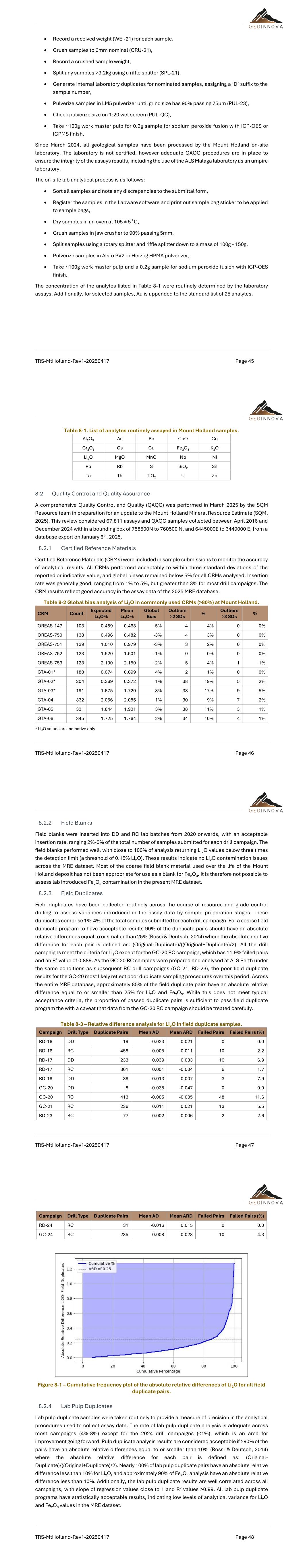 TRS-MTHolland-Rev1-20250417第45页•记录每个样品的接收重量(WEI-21),•将破碎样品压至标称6mm(CRU-21),•记录破碎样品重量,•使用波纹分流器(SPL-21)拆分任何> 3.2kg的样品,•为指定样品生成内部实验室副本,为样品编号指定一个‘d’后缀,•在LM5粉碎机中将样品粉碎,直到研磨尺寸有90%通过75 μ m(PUL-23),•在1:20湿筛(PUL-QC)上检查粉碎尺寸,•取~100g工作母浆0.2g样品进行过氧化钠熔合,并进行ICP-OES或ICPMS表面处理。自2024年3月起,所有地质样品均由Mount Holland现场实验室处理。该实验室没有获得认证,但有足够的QAQC程序来确保化验结果的完整性,包括使用ALS马拉加实验室作为裁判实验室。现场实验室分析过程如下:•对所有样品进行分类并注意与提交表格的任何差异,•在Labware软件中登记样品并打印出样品袋标签以应用于样品袋,•将样品在105 ± 5 ° C的烘箱中干燥,•在颚式破碎机中将样品破碎至90%通过5mm,•使用旋转分离器和波纹分离器将样品分割至100g-150g的质量,•在Alsto PV2或Herzog HPMA粉碎机中将样品粉碎,•取~100g工作母浆和0.2g过氧化钠融合ICP-OES整理样品。表8-1所列分析物的浓度由实验室化验常规测定。此外,对于选定的样品,AU被附加到25种分析物的标准清单中。TRS-MTHolland-Rev1-20250417第46页表8-1。霍兰山样品中常规测定的分析物列表。Al ↓ O 3 As be CaO Co Cr ↓ O 4 Cs Cu Fe ↓ O丨K ↓ O Li ↓ O MgO MnO Nb Ni Pb Rb S SiO ↓ Sn Ta Th TiO ↓ U Zn8.2质量控制和质量保证SQM资源团队于2025年3月进行了全面的质量控制和质量(QAQC),为更新Mount Holland矿产资源估算(SQM,2025)做准备。本次审查考虑了2016年4月至2024年12月期间在758500N至760500N和6445000E至6449000E的边框内从2025年1月6日的数据库导出中收集的67,811份化验和QAQC样本。8.2.1已认证的参考材料认证的参考材料(CRM)被纳入样本提交,以监测分析结果的准确性。所有CRM的表现都可以接受,达到报告或指示值的三个标准差以内,所有分析的CRM的全球偏差都保持在5%以下。插入率总体良好,从1%到5%不等,但大多数演练活动都大于3%。CRM结果反映了2025年MRE数据库化验数据的良好准确性。表8-2荷兰山常用CRM(> 80%)中Li2O的全球偏置分析。CRM计数预期Li ↓ O %均值Li ↓ O %全局偏差异常值> 2 SDs %异常值> 3 SDs % OREAS-147 1030.48 90.463-5 % 44% 00% OREAS-750138 0.49 60.482-3 % 43% 00% OREAS-751 1391.0100.979-3 % 32% 00% OREAS-752 1231.5201.501-1 %00% 00% OREAS-753 1232.190 2.150-2 % 54% 11% GTA-01*1880.67 40.6994% 21% 00% GTA-02*2040.36 90.372.1% 3819% 52% GTA-03*1911.6751.7 203% 3317% 95% GTA-04 3322.056 2.0851% 309% 72% GTA-05 3311.84 41.9013% 3811% 31% GTA-06 3451.72 51.7642% 3410% 41%*Li2O值仅供参考。TRS-MTHolland-Rev1-20250417第478.2.2页现场空白现场空白从2020年起插入DD和RC实验室批次,插入率可接受,范围为每次钻探活动提交样品总数的2%-5 %。现场空白表现良好,接近100%的分析返回低于检测限值三倍的Li ↓ O值(阈值为0.15% Li ↓ O)。这些结果表明,在MRE数据集中没有出现二氧化锂污染问题。在Mount Holland矿床的整个生命周期中使用的大多数粗场空白材料都不适合用作Fe ↓ O 3的空白。因此,无法在目前的MRE数据集中评估实验室引入的Fe ↓ O ⑤污染。8.2.3现场副本在整个资源和品位控制钻探过程中定期收集现场副本,以评估样品制备阶段在化验数据中引入的差异。这些复制品占每次钻探活动提交样品总数的1%-4 %。对于一个粗域重复程序来说,要有可接受的结果,90%的重复对应该具有等于或小于25%的绝对相对差异(Rossi & Deutsch,2014),其中每对的绝对相对差异定义为:(Original-Duplicate)/((Original + Duplicate)/2)。除GC-20 RC活动外,所有演练活动均符合Li ↓ O标准, 其中有11.9%的失败配对,R2值为0.889。由于GC-20 RC样品是在与随后的RC钻探活动(GC-21、RD-23)相同的条件下在ALS Perth制备和分析的,因此GC-20的现场重复结果不佳很可能反映了这一时期重复采样程序不佳。在整个MRE数据库中,大约85%的现场重复对的绝对相对差异等于或小于25%的Li ↓ O和Fe ↓ O 3。虽然这不符合典型的接受标准,但通过的重复对的比例足以通过现场重复程序,但需要注意的是,应该谨慎对待来自GC-20 RC活动的数据。表8-3 –现场重复样品中Li ↓ O的相对差异分析。Campaign drill type duplicate pairs mean AD mean ARD failed pairs failed pairs(%)RD-16 DD19-0.023 0.02 100.0 RD-16 RC 458-0.005 0.01 1102.2 RD-17 DD2330.03 90.03 3166.9 RD-17 RC 3610.001-0.004 61.7 RD-18 DD38-0.013-0.007 37.9 GC-20 DD8-0.038-0.047 00.0 GC-20 RC 413-0.005 4811.6 GC-21 RC 2360.01 10.02 1135.5 RD-23 RC 770.00 20.00622.6 TRS-MTHolland-Rev1-20250417第48页Campaign drill type duplicate pairs mean AD mean ARD failed pairs failed pairs(%00.0 GC-24 RC 2350.00 80.02 8104.3图8-1 –所有场重复对的Li ↓ O绝对相对差异累积频率图。8.2.4 Lab Pulp Duplicates Lab pulp duplicates Lab pulp duplicates samples are regularly taken to provide a measure of precision in the analytical procedures used to collect assay data。实验室纸浆重复分析率在大多数活动(4%-8 %)中都是足够的,除了2024年的钻探活动(< 1%),这是一个需要改进的领域。如果> 90%的对的绝对相对差异等于或小于10%,则认为纸浆重复分析结果是可以接受的(Rossi & Deutsch,2014),其中每对的绝对相对差异定义为:(Original-Duplicate)/((original + Duplicate)/2)。近100%的实验室纸浆复制品对Li ↓ O的绝对相对差异小于10%,约90%的Fe ↓ O ⑤分析的绝对相对差异小于10%。此外,实验室纸浆复制结果在所有活动中具有很好的相关性,回归值的斜率接近1,R2值> 0.99。所