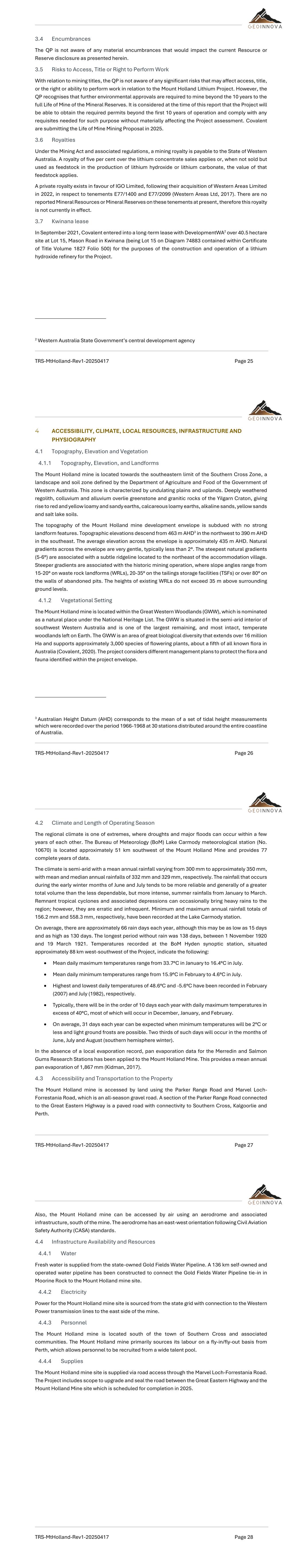 TRS-MTHolland-Rev1-20250417第25页3.4产权负担QP不知道有任何重大产权负担会影响本文所述的当前资源或储备披露。3.5与采矿权相关的准入、所有权或执行工作权的风险,QP并未意识到可能影响与Mount Holland Lithium项目相关的准入、所有权或执行工作的权利或能力的任何重大风险。然而,QP认识到,要在10年后开采到矿产储量的完整矿山寿命,还需要进一步的环境批准。在编写本报告时认为,该项目将能够在运营的前10年之后获得所需的许可,并遵守为此目的所需的任何必要条件,而不会对项目评估产生重大影响。Covalent正在提交2025年矿山开采寿命提案。3.6根据《矿业法》和相关法规的特许权使用费,采矿特许权使用费应支付给西澳大利亚州。适用锂精矿销售额5%的特许权使用费,或者,如果不是出售而是用作氢氧化锂或碳酸锂生产的原料,则适用该原料的价值。在IGO Limited于2022年收购Western Areas Limited后,就矿权地E77/1400和E77/2099(Western Areas Ltd,2017)存在有利于IGO Limited的私人特许权使用费。目前这些矿权没有报告的矿产资源或矿产储量,因此这一特许权使用费目前没有生效。3.7 Kwinana租约于2021年9月,Covalent与DevelopmentWA2就Kwinana Mason Road 15号地块40.5公顷的场地(即所有权证书卷1827 Folio 500内所载图表74883上的15号地块)订立长期租约,目的是为该项目建造和运营氢氧化锂精炼厂。2西澳大利亚州政府中央发展机构TRS-MTHolland-Rev1-20250417第26页无障碍环境、气候、当地资源、基础设施和地貌4.1地形、海拔和植被4.1.1地形、海拔和地貌荷兰山矿位于南十字区东南边界,这是西澳大利亚州政府农业和食品部定义的景观和土壤带。这个地带的特点是起伏的平原和高地。深风化的风化层、崩积层和冲积层覆盖在Yilgarn克拉通的绿岩和花岗岩上,形成红色和黄色的壤质和砂质土、钙质壤质土、碱性砂、黄砂和盐湖土壤。荷兰山矿山开发围护地地形平缓,没有强烈的地貌特征。地形海拔从西北463米AHD3下降到东南390米AHD。整个包络的平均海拔约为435米AHD。整个信封的自然渐变非常平缓,通常小于2 °。最陡峭的自然梯度(5-6 °)与位于住宿村东北部的一条微妙的山脊线有关。更陡峭的坡度与历史上的采矿作业有关,其中边坡角范围从废石地貌(WRL)上的15-20 °、尾矿储存设施(TSF)上的20-35 °或废弃矿坑墙壁上的80 °以上。现有WRL高度不超过周边地面35米。4.1.2植被设置荷兰山矿位于被提名为国家遗产名录自然地的Great Western Woodlands(GWW)范围内。GWW位于西澳大利亚西南部半干旱的内陆地区,是地球上现存最大、也是最完整的温带林地之一。GWW是一个生物多样性非常丰富的地区,延伸超过1600万公顷,支持大约3,000种开花植物,约占澳大利亚所有已知植物群的五分之一(Covalent,2020)。该项目考虑了不同的管理计划,以保护项目范围内确定的动植物。3澳大利亚高度基准(AHD)对应于一组在1966-1968年期间记录的分布在澳大利亚整个海岸线周围的30个站点的潮汐高度测量的平均值。TRS-MTHolland-Rev1-20250417第27页4.2气候和运营季节长度区域气候属于极端之一,干旱和大洪水可以在几年内相互发生。气象局(BOM)卡莫迪湖气象站(编号10670)位于荷兰山矿西南约51公里处,提供77年完整数据。气候为半干旱,年平均降雨量在300毫米至约350毫米不等,年平均和中值降雨量为332毫米和329毫米, 分别。与不太可靠但强度更大的1月至3月夏季降雨相比,发生在6月和7月的初冬月份的降雨往往更可靠,而且总量通常更大。残留的热带气旋和相关的低气压偶尔会给该地区带来大雨;然而,它们不稳定且不频繁。卡莫迪湖站记录到的最小和最大年总降雨量分别为156.2毫米和558.3毫米。平均每年大约有66个雨天,尽管这可能低至15天,高达130天。最长无雨时间为138天,为1920年11月1日至1921年3月19日。位于该项目西南偏西方向约88公里处的BOM海登天气观测站记录的气温显示如下:•平均日最高气温范围从1月的33.7 ° C到7月的16.4 ° C。•日平均最低气温范围从2月的15.9 ° C到7月的4.6° C。• 2月(2007年)和7月(1982年)的日最高和最低气温分别为48.6° C和-5.6 ° C。•一般情况下,每年会有10天左右的日最高气温超过40 ℃,大部分发生在12月、1月、2月。•平均每年可预计有31天最低气温将在2 ° C或更低,并可能出现轻微的地面霜冻。这种日子的三分之二将发生在6月、7月和8月(南半球冬季)。在没有当地蒸发记录的情况下,Merredin和Salmon Gums研究站的泛蒸发数据已应用于Mount Holland矿。这提供了1,867毫米的平均年蒸发量(Kidman,2017年)。4.3物业的可达性和交通Mount Holland矿山通过陆路进入,使用Parker Range路和Marvel Loch-Forrestania路,这是一条全季节的碎石路。与大东部公路相连的一段帕克山脉公路是一条铺有路面的公路,可连接南十字、卡尔古利和珀斯。TRS-MTHolland-Rev1-20250417第28页此外,Mount Holland矿山可以使用位于矿山以南的机场和相关基础设施通过空中进入。该机场按照民航安全局(CASA)标准呈东西走向。4.4基础设施可用性和资源4.4.1供水淡水由国有金田输水管道供应。建设136公里自有运营输水管道,连接Moorine Rock的金田输水管道搭接至Mount Holland矿址。4.4.2 Mount Holland矿场的电力来自国家电网,与通往矿场东侧的西部电力输电线路相连。4.4.3人员Mount Holland矿山位于Southern Cross镇和相关社区以南。Mount Holland矿山主要从珀斯以飞入/飞出的方式获取劳动力,这使得人员可以从广泛