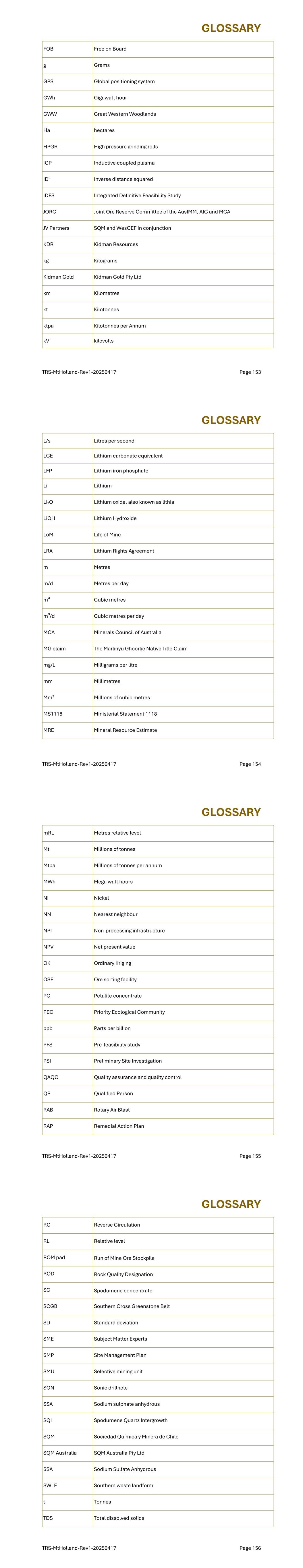 GLOSSARY TRS-MTHolland-Rev1-20250417第153页离岸价船上免费g克GPS全球定位系统GWh千兆瓦时GWW Great Western Woodlands公顷HPGR高压磨辊ICP电感耦合等离子体ID2逆距平方IDFS综合确定性可行性研究AusIMM的JORC联合矿石储量委员会,AIG和MCA JV Partners SQM和WESCEF联合KDR Kidman Resources公斤公斤Kidman Gold Kidman Gold Pty Ltd公里kt千吨ktpa千吨/年千伏词汇TRS-MTHolland-Rev1-20250417 page154 L/s升每秒LCE碳酸锂当量LFP磷酸铁锂锂锂Li2O氧化锂,也已知作为Lithia LiOH氢氧化锂LoM矿山寿命LRA锂权协议m米m/d米每天m ↓立方米m丨/d立方米每天MCA Minerals委员会澳大利亚MG索赔Marlinyu Ghoorlie土著产权索赔mg/l毫克/升mm毫米mm3百万立方米MS1118部长声明1118 MRE矿产资源估算词汇表TRS-MTHolland-Rev1-20250417页155 mRL米相对水平MT百万吨MTpa百万吨每年兆瓦时镍镍NN最近邻NPI非加工基础设施NPV净现值OK普通克里金OSF矿石分选设施PC Petalite精矿PEC优先生态共同体ppb十亿分之PFS预可行性研究PSI初步现场调研QAQC质量保证和质量控制QP合格人员RAB旋转空气爆破RAP补救行动计划词汇TRS-MTHolland-Rev1-20250417第156页RC反循环RL相对水平ROM pad运行矿山矿石库RQD岩石质量指定SC锂辉石精矿SCGB南十字绿岩带SD标准偏差中小企业标的物专家SMP现场管理计划SMU选择性采矿单元SON声波钻孔SSA硫酸钠无水SQI锂辉石石英互生SQM Sociedad Qu í mica y Minera de Chile SQM Australia SQM Australia Pty Ltd SSA硫酸钠无水SWLF Southern Waste Landform t tones TDS总溶解固体