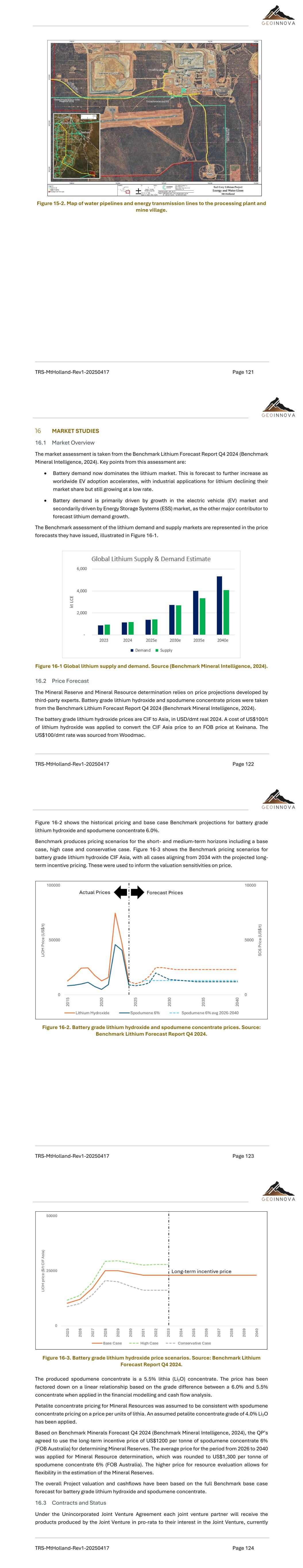 TRS-MTHolland-Rev1-20250417第121页图15-2。到加工厂和矿村的输水管道和能源输送线路图。TRS-MTHolland-Rev1-20250417第122页市场研究16.1市场概览市场评估取自Benchmark Lithium 2024年第四季度预测报告(Benchmark Mineral Intelligence,2024年)。这一评估的关键点是:•电池需求现在主导了锂市场。随着全球电动汽车的采用加速,预计这一数字将进一步增加,锂的工业应用市场份额下降,但仍以低速增长。•电池需求主要受到电动汽车(EV)市场增长的推动,其次受到储能系统(ESS)市场的推动,后者是预测锂需求增长的另一个主要贡献者。锂需求和供应市场的基准评估体现在他们发布的价格预测中,如图16-1所示。图16-1全球锂供需情况。来源(Benchmark Mineral Intelligence,2024年)。16.2价格预测矿产储量和矿产资源的确定依赖于第三方专家开发的价格预测。电池级氢氧化锂和锂辉石精矿价格取自BenchLithium预测报告Q4 2024(Benchmark Mineral Intelligence,2024)。电池级氢氧化锂价格到亚洲到岸价格,单位为美元/DMT real 2024。应用100美元/t氢氧化锂成本,将到岸亚洲价格换算为Kwinana离岸价。100美元/DMTT费率来自WoodMac。TRS-MTHolland-Rev1-20250417第123页图16-2显示了电池级氢氧化锂和锂辉石精矿6.0%的历史定价和基本情况基准预测。Benchmark产生了包括基本情况、高情况和保守情况在内的中短期范围的定价情景。图16-3显示了电池级氢氧化锂CIF Asia的基准定价情景,所有案例从2034年开始与预计的长期激励定价保持一致。这些被用来告知对价格的估值敏感性。图16-2。电池级氢氧化锂和锂辉石精矿价格。资料来源:Benchmark Lithium Forecast Report Q4 2024。TRS-MTHolland-Rev1-20250417第124页图16-3。电池级氢氧化锂价格情景。资料来源:Benchmark Lithium Forecast Report Q4 2024。生产的锂辉石精矿为5.5%锂亚(Li2O)精矿。在财务建模和现金流分析中应用时,价格已根据6.0%和5.5%精矿之间的品位差异按线性关系进行了考虑。假设矿产资源的Petalite精矿定价与锂辉石精矿以每单位锂的价格定价一致。应用了假设的4.0% Li2O的透辉石精矿品位。基于Benchmark Minerals 2024年第四季度预测(Benchmark Mineral Intelligence,2024年),QP同意使用每吨6%锂辉石精矿1200美元的长期激励价格(澳大利亚离岸价)来确定矿产储量。2026-2040年期间的平均价格适用于矿产资源确定,四舍五入为1300美元/吨锂辉石精矿6%(澳大利亚离岸价)。资源评估的较高价格允许对矿产储量的估算具有灵活性。整体项目估值和现金流已基于电池级氢氧化锂和锂辉石精矿的完整基准基础案例预测。16.3非法人合营企业协议下的合同和地位每个合营伙伴将按其在合营企业的权益按比例获得合营企业生产的产品,目前