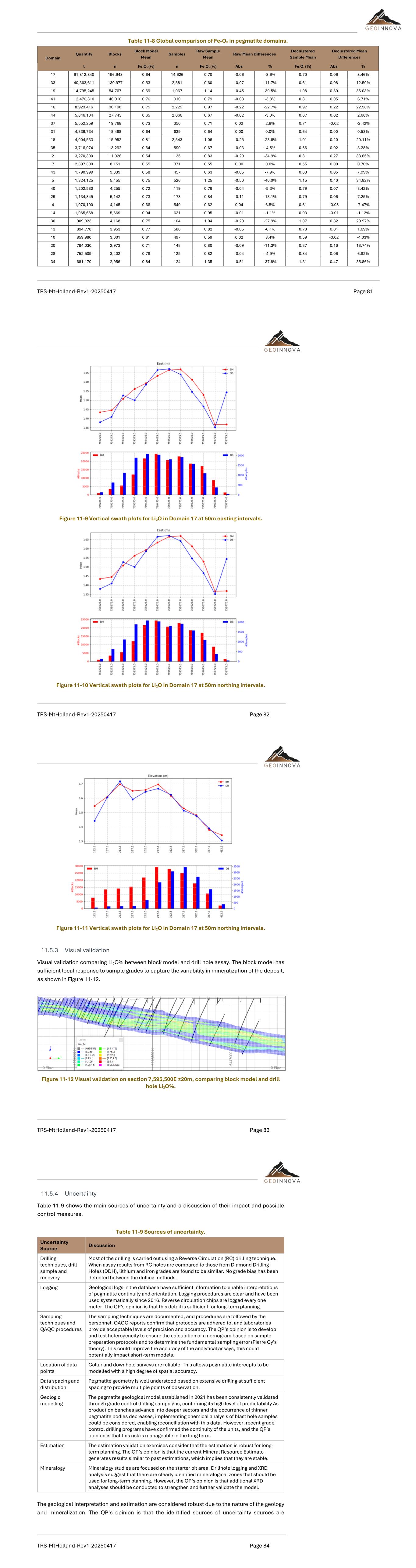 TRS-MTHolland-Rev1-20250417第81页表11-8伟晶岩域中Fe2O3的全局比较。域数量块Block模型均值样本原始样本均值原始平均原始均值差值分散样本均值分散均值差值t n Fe2O3(%)n Fe2O3(%)ABS % Fe2O3(%)ABS % 1761,812,340196,9430.64 14,6260.70-0.06-8.6 % 0.70 0.06 8.46% 3340,363,611130,9770.53 2,58 10.60-0.07-11.7 % 0.6 10.08 12.50% 1914,795,24554,7670.691,0671.14-0.45-39.5 % 1.08 0.39 36.03% 4112,476,31046,9100.76 9100.79-0.03-3.8 % 0.8 10.056.71% 168,923,41636,1980.752,2290.97-0.22-5,552,259 19,768 0.73 350 0.71 0.02 2.8% 0.71 -0.02 -2.42% 31 4,836,734 18,498 0.64 639 0.64 0.00 0.0% 0.64 0.00 0.53% 18 4,004,533 15,952 0.81 2,543 1.06 -0.25 -23.6% 1.01 0.20 20.11% 35 3,716,974 13,292 0.64 590 0.67 -0.03 -4.5% 0.66 0.02 3.28% 2 3,270,300 11,026 0.54 135 0.83 -0.29 -34.9% 0.81 0.27 33.65% 7 2,397,300 8,151 0.55 371 0.55 0.00 0.0% 0.55 0.00 0.70% 43 1,790,999 9,839 0.58 457 0.63 -0.05 -7.9% 0.63 0.05 7.99% 5 1,324,125 5,455 0.75 526 1.25 -0.50 -40.0% 1.15 0.40 34.82% 40 1,202,580 4,255 0.72 119 0.76 -0.04 -5.3% 0.79 0.07 8.42% 291,134,8455,1420.73 1730.84-0.11-13.1 % 0.79 0.067.25% 41,070,1904,1450.665490.62 0.046.5% 0.61-0.05-7.47 % 141,065,6685,6690.946310.95-0.01-1.1 % 0.93-0.01-1.12 % 30909,3234,1680.75 1041.04-0.29-27.9 % 1.07 0.32 29.97% 13894,7783,9530.775860.82-0.05-6.1 % 0.78 0.01 1.69% 10859,9803,0010.61 4970.59 0.02 3.4% 0.59-0.02-4.03 % 20794,0302,9730.71 1480.80-0.09-11.3 % 0.87 0.16 18.74% 28752,5093,4020.78 1250.82-0.04-4.9 % 0.84 0.066.82% 34681第82页图11-9东向间隔50m处区域17的Li2O垂直样带图。图11-10北向50m间隔17区Li2O垂直样带图。TRS-MTHolland-Rev1-20250417第83页图11-11北向50m区间17区Li2O垂直样带图。11.5.3可视化验证在块模型和钻孔分析之间比较Li2O %的可视化验证。区块模型对样本品位有足够的局部响应,以捕捉矿床成矿的可变性,如图11-12所示。图11-12对7,595,500E ± 20m断面进行可视化验证,对比块模型和钻孔Li2O %。TRS-MTHolland-Rev1-20250417第84页11.5.4不确定性表11-9显示了不确定性的主要来源以及对其影响和可能的控制措施的讨论。表11-9不确定性的来源。不确定来源讨论钻井技术、钻样和回收大部分钻井使用反循环(RC)钻井技术进行。当将RC孔的化验结果与金刚石钻孔(DDH)的化验结果进行比较时,发现锂和铁的品位相似。钻井法之间未检测到品位偏差。数据库中的测井地质测井有足够的信息,可以解释伟晶岩的连续性和方位。测井程序明确,自2016年起系统使用。反循环芯片每隔一米记录一次。QP的意见是,这个细节对于长期规划来说已经足够了。采样技术和QAQC程序采样技术记录在案,程序由人员遵循。QAQC报告证实,遵守了协议,实验室提供了可接受的精确度和精确度水平。QP的意见是开发和测试异质性,以确保计算基于样品制备协议的列线图并确定基本采样误差(Pierre Gy理论)。这可能会提高分析分析分析的准确性,这可能会对短期模型产生潜在影响。数据点位置套管和井下勘测可靠。这使得伟晶岩截距能够以高度的空间精度进行建模。数据间距和分布伟晶岩几何结构是很好理解的,这是基于在足够间距提供多个观测点的广泛钻探。地质建模2021年建立的伟晶岩地质模型通过品位控制钻探活动得到了一致验证,证实了其高水平的可预测性,因为生产台架向更深的区域推进,较薄伟晶岩体的出现减少,可以考虑对爆破孔样品实施化学分析,从而能够与这些数据进行核对。然而,最近的品位控制钻探计划证实了机组的连续性, QP的观点是,从长期来看,这种风险是可控的。估计估计验证练习考虑到该估计对于长期规划是稳健的。QP的意见是,当前的矿产资源估算产生了与过去估算相似的结果,这意味着它们是稳定的。矿物学矿物学研究集中在起始坑区。钻孔测井和XRD分析表明,有明确确定的矿物带,应用于长期规划。然而,QP的意见是,应该进行额外的XRD分析,以加强和进一步验证模型。由于地质和矿化的性质,地质解释和估计被认为是稳健的。QP的意见是,已确定的不确定性源是