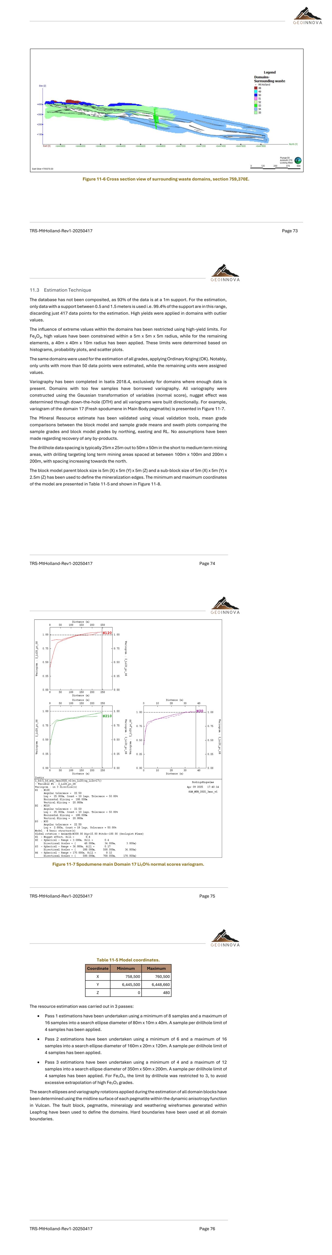 TRS-MTHolland-Rev1-20250417第73页图11-6周边废物域截面图,759,370E段。TRS-MTHolland-Rev1-20250417第74页11.3估算技术数据库未合成,因为93%的数据在1m支持。对于估算,仅使用了支撑在0.5到1.5米之间的数据,即99.4%的支撑都在这个范围内,仅丢弃了417个用于估算的数据点。在具有异常值的域中应用了高产量。域内极值的影响已使用高收益限制进行了限制。对于Fe ↓ O AAA,高值被限制在5m x 5m x 5m半径内,而对于其余元素,则应用了40m x 40m x 10m半径。这些限制是根据直方图、概率图和散点图确定的。相同的域被用于所有等级的估计,应用普通克里金(OK)。值得注意的是,仅对数据点超过50个的单位进行了估算,而对其余单位则进行了赋值。Variography已在Isatis 2018.4中完成,专供有足够数据的领域使用。样本太少的领域借用了变异学。使用变量的高斯变换(正态得分)构建所有变异谱,通过井下(DTH)确定金块效应并定向构建所有变异谱。例如,结构域17(主体伟晶岩中的新鲜锂辉石)的变异图如图11-7所示。矿产资源估算已使用可视化验证工具、区块模型和样本品位均值对比均值以及样本品位和区块模型品位按北向、东向和RL对比的样本品品位和区块模型品位的条带图进行了验证。没有对任何副产品的回收作出任何假设。在中短期矿区,钻孔数据间距通常为25m x25m out至50m x50m,钻探目标为长期矿区,间距介于100m x100m和200m x200m之间,间距向北增加。区块模型母块大小为5m(X)x5m(Y)x5m(Z)并使用了5m(X)x5m(Y)x2.5m(Z)的子块大小来定义矿化边缘。模型的最小和最大坐标如表11-5所示,如图11-8所示。TRS-MTHolland-Rev1-20250417第75页图11-7锂辉石主域17Li2O %正常分数变异图。TRS-MTHolland-Rev1-20250417第76页表11-5模型座标。坐标最小最大值X758,500760,500Y6,445,5006,448,660Z0480资源估算分3次进行:•通过1次估算已使用最少8个样本和最多16个样本进入80m x 10m x 40m的搜索椭圆直径。每个钻孔的样品限制为4个样品。•通过2估计已使用最少6个和最多16个样本进入160m x20m x120m的搜索椭圆直径。每个钻孔的样品限制为4个样品。•已使用最少4个和最多12个样本对350m x50m x200m的搜索椭圆直径进行了pass 3估计。每个钻孔的样品限制为4个样品。对于Fe2O3,通过钻孔限值限制为3个,以避免过度外推高Fe2O3品位。在估计所有域块时应用的搜索椭圆和变分旋转已使用Vulcan动态各向异性函数内的每个伟晶岩的中线表面确定。Leapfrog内部生成的断块、伟晶岩、矿物学和风化线框已被用于定义域。硬边界已被用于所有领域边界。