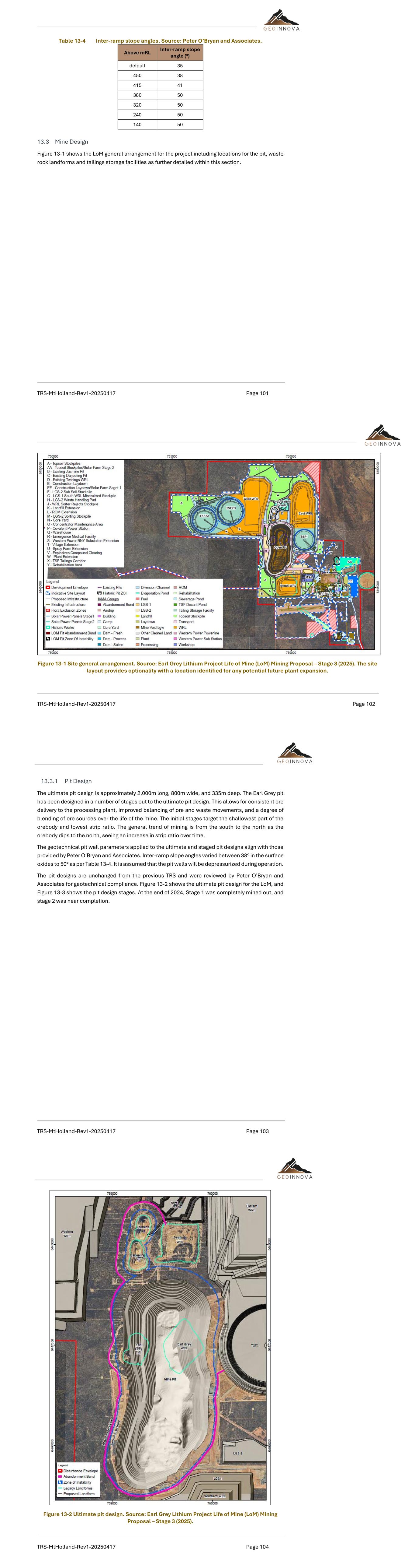 TRS-MTHolland-Rev1-20250417第101页表13-4匝道间坡角。资料来源:Peter O’Bryan and Associates。mRL以上匝道间坡角(°)默认3545038415413805032050240501405013.3矿山设计图13-1显示了项目的LoM总体布置,包括矿坑位置、废石地貌和尾矿储存设施,如本节中进一步详述。TRS-MTHolland-Rev1-20250417第102页图13-1站点总布置。资料来源:Earl Grey Lithium Project Life of Mine(LoM)Mining Proposal – Stage 3(2025)。场地布局提供了可选性,为任何潜在的未来工厂扩张确定了一个位置。TRS-MTHolland-Rev1-20250417第103页13.3.1坑设计终极坑设计长约2,000m,宽约800m,深约335m。Earl Grey坑经过多个阶段的设计,直至最终的坑设计。这允许向加工厂持续交付矿石,改善矿石和废物流动的平衡,并在矿山的整个生命周期内实现一定程度的矿源混合。初始阶段的目标是矿体最浅的部分和最低的带钢比。开采的大趋势是随着矿体向北倾斜而由南向北,随着时间的推移看到带钢比的增加。应用于终极和分阶段坑设计的岩土工程坑壁参数与Peter O’Bryan and Associates提供的参数一致。根据表13-4,坡间坡度在表面氧化物中的38 °到50 °之间变化。假设坑壁在运行过程中会减压。这些坑的设计与之前的TRS没有变化,并由Peter O’Bryan and Associates进行了岩土工程合规性审查。图13-2显示了LoM的最终坑设计,图13-3显示了坑设计阶段。2024年底,第1阶段完全开采,第2阶段接近完成。TRS-MTHolland-Rev1-20250417第104页图13-2终极坑设计。资料来源:Earl Grey Lithium Project Life of Mine(LoM)Mining Proposal – Stage 3(2025)。