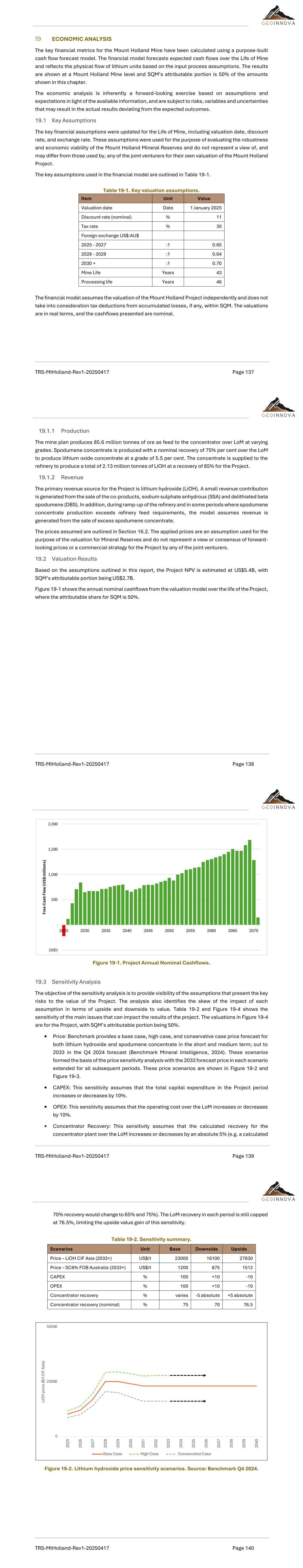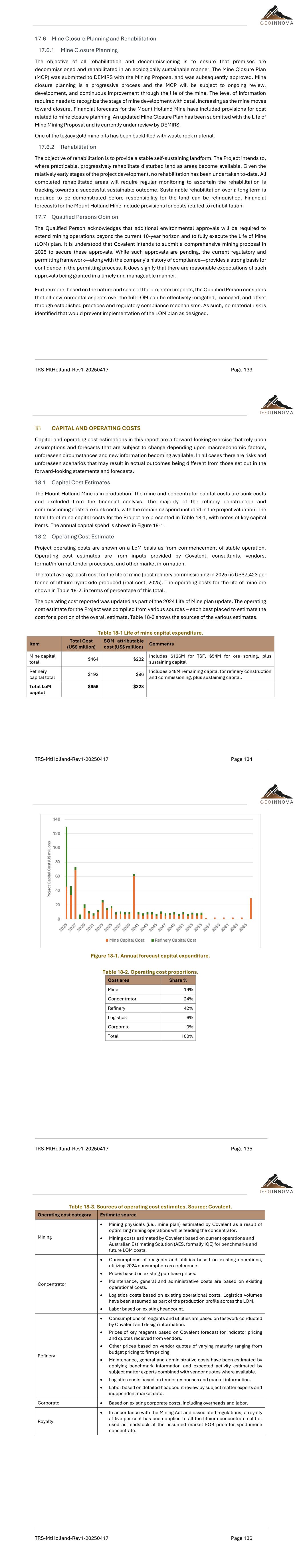 TRS-MTHolland-Rev1-20250417第133页17.6矿山关闭规划和修复17.6.1矿山关闭规划所有恢复和退役的目标是确保房地以生态上可持续的方式退役和修复。矿山关闭计划(MCP)与采矿提案一起提交给DEMIRS,随后获得批准。矿山关闭规划是一个循序渐进的过程,MCP将受到持续审查、开发和通过矿山寿命不断改进的影响。所需的信息水平需要认识到随着矿山走向关闭,细节越来越多的矿山开发阶段。Mount Holland矿山的财务预测已包括与矿山关闭规划相关的成本拨备。更新后的矿山关闭计划已与矿山开采寿命提案一起提交,目前正在接受DEMIRS的审查。其中一个遗留金矿矿坑已被废石材料回填。17.6.2修复修复的目标是提供一个稳定的自我维持的地貌。该项目打算在可行的情况下,随着区域变得可用,逐步修复受干扰的土地。鉴于项目开发的相对早期阶段,迄今为止尚未进行任何修复。所有已完成的修复区域都将需要定期监测,以确定修复工作正在朝着成功的可持续结果迈进。在放弃对土地的责任之前,需要对长期可持续的恢复进行论证。Mount Holland矿山的财务预测包括与修复相关的费用拨备。17.7合资格人士意见合资格人士承认,要将采矿作业延长至目前的10年期限之后,并全面执行矿山寿命(LOM)计划,将需要额外的环境批准。据了解,Covalent打算在2025年提交一份全面的采矿提案,以确保获得这些批准。尽管此类批准正在等待中,但目前的监管和许可框架——连同该公司的合规历史——为对许可过程的信心提供了强有力的基础。它确实意味着,人们对此类批准及时且可控地获得批准有合理的预期。此外,根据预计影响的性质和规模,合格人员认为,通过既定做法和监管合规机制,可以有效地减轻、管理和抵消整个LOM中的所有环境方面。因此,没有发现会阻止按设计实施LOM计划的重大风险。TRS-MTHolland-Rev1-20250417第134页资本和运营成本本报告中的资本和运营成本估算是一项前瞻性工作,它依赖于假设和预测,这些假设和预测可能会根据宏观经济因素、不可预见的情况和可获得的新信息而发生变化。在所有情况下,都存在可能导致实际结果与前瞻性陈述和预测中所述结果不同的风险和不可预见的情况。18.1资本成本估算Mount Holland矿山正在生产中。矿山和选矿厂资本成本是沉没成本,不包括在财务分析中。炼油厂建设和调试成本大部分为沉没成本,剩余支出包含在项目估值中。该项目的矿山资本成本总年限列于表18-1,并附关键资本项目附注。每年的资本支出如图18-1所示。18.2运营成本估算项目运营成本自稳定运营开始以LoM为基础列示。运营成本估算来自Covalent、顾问、供应商、正式/非正式招标流程和其他市场信息提供的投入。矿山寿命(2025年炼油厂投产后)的总平均现金成本为每生产一吨氢氧化锂7,423美元(实际成本,2025年)。矿山全寿命运营成本见表18-2。以占这一总额的百分比表示。报告的运营成本作为2024年矿山寿命计划更新的一部分进行了更新。该项目的运营成本估算是从各种来源编制的——每一种来源都最适合估算总估算的一部分的成本。表18-3显示了各种估计的来源。表18-1矿山资本开支寿命。项目总成本(百万美元)SQM应占成本(百万美元)评论矿山资本总额464美元232美元包括1.26亿美元用于TSF,5400万美元用于矿石分选,加上维持资本炼油厂资本总额192美元96美元包括4800万美元用于炼油厂建设和调试的剩余资本, 加上维持资本。LoM总资本$ 656 $ 328 TRS-MTHolland-Rev1-20250417第135页图18-1。年度预测资本支出。表18-2。营业成本占比。成本地区份额%矿山19%选矿厂24%炼油厂42%物流6%企业9%合计100% TRS-MTHolland-Rev1-20250417第136页表18-3。运营成本估算来源。资料来源:Covalent。运营成本类别估算来源采矿•通过在为选矿厂投料时优化采矿作业的结果,通过Covalent估算的采矿实物(即矿山计划)。• Covalent基于当前运营和澳大利亚估算解决方案(AES,正式称为IQE)对基准和未来LOM成本进行估算的采矿成本。聚光器•基于现有运营的试剂和公用事业消费量,利用2024年消费量作为参考。•以现有采购价格为基础的价格。•维护、一般和行政费用以现有运营成本为基础。•基于现有运营成本的物流成本。物流量被假定为整个LOM生产概况的一部分。•基于现有员工人数的劳动力。炼油厂•试剂和公用事业的消耗基于通过共价和设计信息进行的测试工作。•基于共价预测的关键试剂价格,用于指标定价和从供应商收到的报价。•其他价格基于不同成熟度的供应商报价,范围从预算定价到确定定价。•维护、一般和行政费用是通过应用由主题专家估计的基准信息和预期活动,并在可获得的情况下结合供应商报价进行估算的。•基于招标响应和市场信息的物流成本。•劳动力基于主题专家的详细员工人数审查和独立的市场数据。企业•基于现有企业成本,包括间接费用和人工。特许权使用费•根据《矿业法》和相关法规,对所有以假定的锂辉石精矿市场离岸价出售或用作原料的锂精矿适用5%的特许权使用费。
