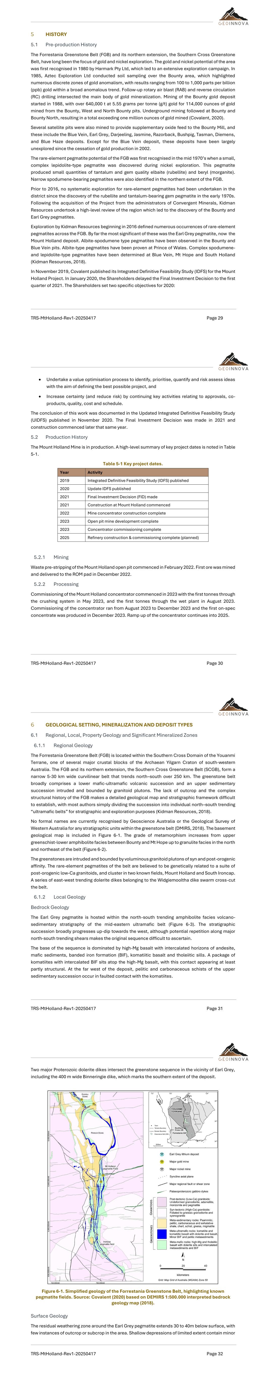 TRS-MTHolland-Rev1-20250417第29页历史5.1生产前历史Forrestania绿岩带(FGB)及其北部延伸部分,南十字绿岩带,长期以来一直是金镍勘探的重点。该地区的黄金和镍潜力最早是在1980年由Harmark Pty Ltd确认的,这导致了广泛的勘探活动。1985年,Aztec Exploration Ltd在Bounty地区进行了土壤采样,这突出了许多离散的黄金异常区域,结果在广泛的异常趋势中从100到1,000亿分之一(ppb)的黄金不等。后续旋转空气爆破(RAB)和反循环(RC)钻探与金矿化主体相交。Bounty金矿的开采始于1988年,从Bounty、West和North Bounty矿坑开采的114,000盎司黄金以5.55克/吨(g/t)的价格开采了超过640,000吨黄金。Bounty和Bounty North紧随其后的是地下采矿,导致总共开采了超过一百万盎司的黄金(Covalent,2020)。还开采了几个卫星坑,为Bounty Mill提供补充氧化物饲料,其中包括Blue Vein、Earl Grey、Darjeeling、Jasmine、Razorback、Bushpig、Tasman、Diemens和Blue Haze矿床。除了Blue Vein矿床,自2002年停止黄金生产以来,这些矿床基本上没有被勘探。FGB的稀有元素伟晶岩潜力最早是在20世纪70年代中期发现的,当时在镍勘探中发现了一个小型复杂的锂云母型伟晶岩。这种伟晶岩产生了少量的钽和宝石品质的elbaite(红碧玺)和绿柱石(摩根石)。在FGB北部地区也发现了窄的含锂辉石伟晶岩。2016年之前,自上世纪70年代初发现红碧玺和含钽宝石伟晶岩以来,该区未进行过稀有元素伟晶岩的系统勘探。继从Convergent Minerals的管理人员手中收购该项目后,Kidman Resources对该地区进行了高级别审查,从而发现了Bounty和Earl Grey伟晶岩。Kidman Resources从2016年开始的勘探确定了在FGB中出现了许多稀有元素伟晶岩。到目前为止,其中最重要的是Earl Grey伟晶岩,现在是Mount Holland矿床。在Bounty和Blue Vein矿坑中观察到了钠长石-锂辉石型伟晶岩。在威尔士亲王已经证明了长生石型伟晶岩。已在Blue Vein、MT Hope和South Holland测定了复杂的锂辉石和锂云母型伟晶岩(Kidman Resources,2018年)。2019年11月,Covalent发布了其关于Mount Holland项目的集成最终可行性研究(IDFS)。2020年1月,股东将最终投资决定推迟至2021年第一季度。股东为2020年设定了两个具体目标:TRS-MTHolland-Rev1-20250417第30页•进行价值优化过程,以确定、确定优先级、量化和风险评估想法,目的是确定可能的最佳项目,并•通过继续开展与审批、联产品、质量、成本和进度相关的关键活动来增加确定性(并降低风险)。这项工作的结论记录在2020年11月发布的更新的综合最终可行性研究(UIDFS)中。最终投资决定于2021年作出,同年晚些时候开工建设。5.2生产历史Mount Holland矿山正在生产中。关键项目日期的高级别摘要见表5-1。表5-1重点项目日期。年度活动2019年综合最终可行性研究(IDFS)发布2020年更新IDFS发布2021年最终投资决定(FID)作出2021年在荷兰山开工建设2022年矿山选矿厂建设完成2023年露天矿开发完成2023年选矿厂调试完成2025年炼油厂建设&调试完成(计划)5.2.12022年2月开始对荷兰山露天矿进行采矿废物预剥离。2022年12月,第一批矿石被开采并交付给ROM平台。5.2.2 Mount Holland选矿厂的加工调试于2023年开始,第一吨于2023年5月通过破碎系统,第一吨于2023年8月通过湿法工厂。选矿厂的调试时间为2023年8月至2023年12月,并于2023年12月生产出第一批按规格生产的精矿。选矿厂的产能提升将持续到2025年。TRS-MTHolland-Rev1-20250417第31页地质定位、矿化和沉积类型6.1区域、局部、属性地质和重要矿化带6.1.1区域地质Forrestania绿岩带(FGB)位于尤安米地体的南十字域内, 澳大利亚西南部太古代Yilgarn克拉通的几个主要地壳区块之一。FGB及其北部延伸部分,南十字绿岩带(SCGB),形成一条5-30公里宽的狭窄曲线带,向北-向南超过250公里。绿岩带大致包括下部镁铁质-超镁铁质火山岩层序和上部沉积岩层序,由花岗岩岩体侵入和包围。FGB缺乏露头和复杂的构造历史使得详细的地质图和地层框架难以建立,大多数作者出于地层和勘探目的,简单地将演替划分为个别的南北走向的“超镁铁质带”(Kidman Resources,2018)。澳大利亚地球科学协会或西澳大利亚地质调查局目前没有认可绿岩带内任何地层单元的正式名称(DMIRS,2018年)。基底地质图包含在图6-1中。变质作用的等级从Bounty和Mt Hope之间的上绿片岩-下角闪岩相上升到带北部和东北部的麻粒岩相(图6-2)。绿岩被syn和造山后亲和性的大量花岗岩岩体侵入和包围。该带的稀有元素伟晶岩被认为与一组造山后低钙花岗岩有遗传关系,并聚集在两个已知的领域,荷兰山和南铁帽。属于Widgiemooltha堤群的一系列东西走向的辉绿岩堤防横穿该带。6.1.2局部地质基岩地质Earl Grey伟晶岩位于中东部超镁铁质带南北走向角闪岩相火山-沉积地层中(图6-3)。地层层序大致向西进行上倾,尽管沿主要南北走向剪切的潜在重复使得原始层序难以确定。层序底部以高镁玄武岩为主,夹层为安山岩、镁铁质沉积物、带状铁层(BIF)、科马铁质玄武岩和拉斑岩质地台。高镁玄武岩的顶部有一包嵌入了BIF的科马提岩,这种触点至少部分表现为结构性的。在矿床最西端,上部沉积层序的泥质和碳质片岩与科马提岩发生断层接触。TRS-MTHolland-Rev1-20250417第32页两个主要的元古代辉绿岩岩脉与Earl Grey附近的绿岩层序相交,其中包括400米宽的Binneringie岩脉,这标志着该矿床的南部范围。图6-1。Forrestania绿岩带简化地质,突出已知伟晶岩田。资料来源:Covalent(2020)基于DEMIRS 1:500.000