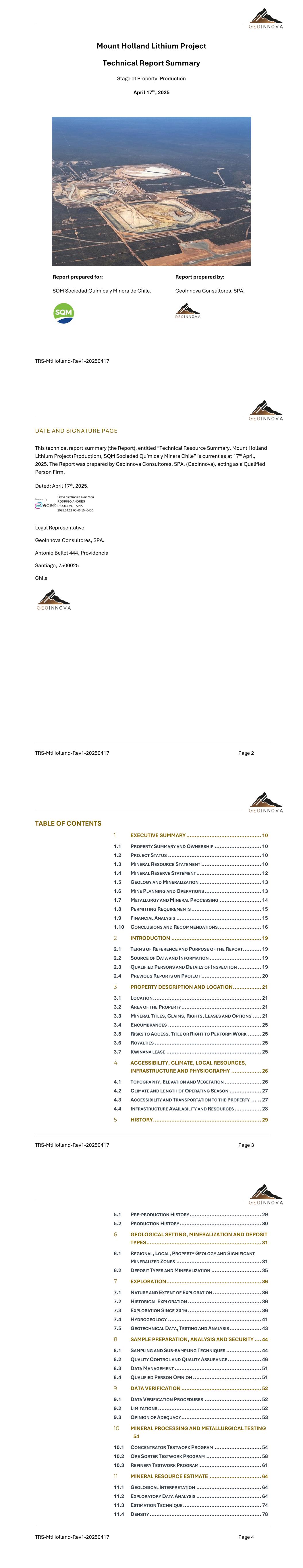 TRS-MTHolland-Rev1-20250417第1页Mount Holland锂项目技术报告概要阶段物业:生产2025年4月17日报告编写对象:报告编写单位:SQM Sociedad Qu í mica y Minera de Chile。GeoInnova Consultores,SPA。TRS-MTHolland-Rev1-20250417第2页日期和签名页这份技术报告摘要(报告),题为“技术资源摘要,Mount Holland Lithium Project(Production),SQM Sociedad Qu í mica y Minera Chile”,截至2025年4月17日。该报告由SPA GeoInnova Consultores编写。(GeoInnova),担任合资格人士事务所。日期:2025年4月17日。法定代表人GeoInnova Consultores,SPA。Antonio Bellet 444,Providencia Santiago,7500025智利Firma Electr ó nica avanzada RODRIGO ANDRES RIQUELME TAPIA 2025.04.2 105:46:15-0400 TRS-MTHolland-Rev1-20250417第3页目录执行摘要.................................................... 10 1.1财产概要和所有权.................... 101.2项目状况.................................................... 10 1.3矿产资源报表.................................... 10 1.4矿产储量报表.................................... 12 1.5地质和矿化.................................... 13 1.6矿山规划和运营.................................... 13 1.7金属和资料................................................19 2.3符合资格的人员和检查详情................................19 2.4以前关于项目的报告.......................................20财产描述和位置................21 3.1位置................................................................21 3.2财产面积................................21 3.3矿产权、债权、权利、租赁和选择权....。213.4负担....................................................25 3.5获得、所有权或行使工作权利的风险....................25 3.6特许权使用费....................................................25 3.7 KWINANA租约....................................................25无障碍、气候、当地资源、基础设施和实物资料....................26 4.1地形、提升和植被....................26 4.2运营季节的气候和长度...................27 4.3无障碍和运输到物业.....。274.4基础设施的可获得性和资源......................................................28历史...................................................29 TRS-MTHolland-Rev1-20250417 page45.1生产前历史...................................................295.2生产历史.......................................30地质环境、矿化和沉积类型...................................................................3 16.1区域、地方、财产地质和重要矿化带...................................................3 16.2沉积类型和矿化.......................................35 分析与安全...。448.1采样和子采样技术....................4 48.2质量控制和质量保证....................4 68.3数据管理....................................................5 18.4合格人员意见....................................51数据核查...................................................5 29.1数据核查程序...................................................5 29.2限制...................................................5 29.3适足性意见.......................................................53矿产加工和冶金检测54 10.1浓缩器测试方案....................................54 10.2矿石
