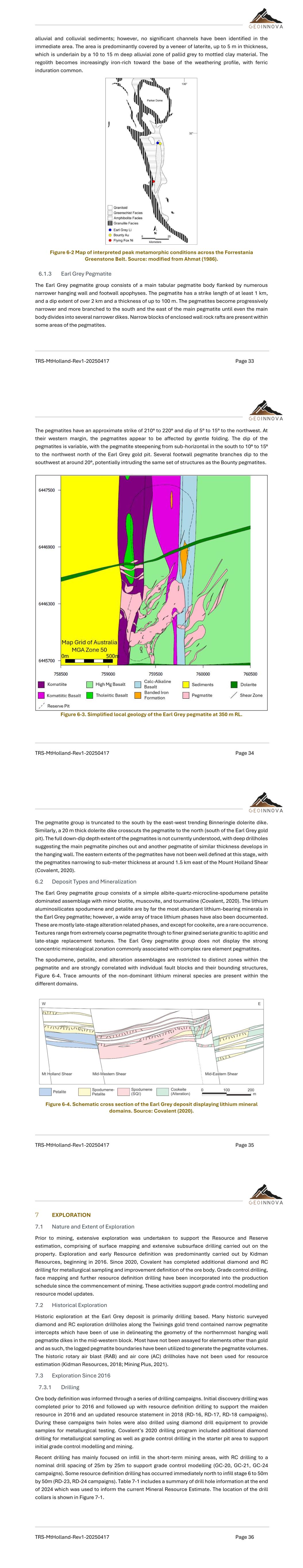 TRS-MTHolland-Rev1-20250417第33页冲积和冲积沉积物;但在邻近地区没有发现明显的通道。该地区主要由红土单板覆盖,厚度可达5米,下面是10至15米深的浅灰色至斑驳粘土材料冲积带。风化层向风化剖面底部变得越来越富铁,常见的是铁硬结。图6-2福雷斯塔尼亚绿岩带的解释峰值变质条件图。资料来源:修改自Ahmat(1986)。6.1.3 Earl Grey伟晶岩Earl Grey伟晶岩群由一个主要的板状伟晶岩体组成,其两侧有许多较窄的悬壁和下盘突。伟晶岩走向长度至少1千米,倾角范围超过2千米,厚度可达100米。伟晶岩逐渐变窄,并更多地向主要伟晶岩的南部和东部分支,直到甚至主体分裂成几个较窄的堤防。在伟晶岩的一些区域内存在狭窄的封闭围岩木筏块。TRS-MTHolland-Rev1-20250417第34页伟晶岩大致走向210 °至220 °,向西北倾角5 °至15 °。在它们的西部边缘,伟晶岩似乎受到温和折叠的影响。伟晶岩的倾角是可变的,伟晶岩从南部的亚水平变陡到伯爵灰金矿坑的西北偏北10 °到15 °。几个下盘伟晶岩分支以大约20 °向西南倾斜,可能侵入与Bounty伟晶岩相同的一组结构。图6-3。350m RL伯爵灰伟晶岩简化局部地质。TRS-MTHolland-Rev1-20250417第35页伟晶岩群向南被东西走向的Binneringie辉绿岩岩脉截断。同样,一条20米厚的辉绿岩堤坝将伟晶岩横切到北部(伯爵灰金矿以南)。伟晶岩的完整下倾深度范围目前尚不清楚,深钻孔表明主要伟晶岩挤压出来,另一块厚度相似的伟晶岩在上壁发育。伟晶岩的东部范围在这个阶段还没有很好地界定,伟晶岩在荷兰山剪切以东约1.5公里处变窄至亚米厚(Covalent,2020)。6.2矿床类型及矿化情况Earl Grey伟晶岩群由简单的钠长石-石英-微晶石-锂辉石瓣闪岩为主的组合与微量黑云母、白云母、电气石组成(Covalent,2020)。铝硅酸锂锂辉石和透辉石是迄今为止伯爵灰伟晶岩中最丰富的含锂矿物;然而,也有大量的痕量锂相被记录下来。这些多为晚期蚀变相关阶段,除古柯岩外,属罕见。纹理范围从极其粗大的伟晶岩到更细的粒度序列状花岗岩,再到斜长岩和晚期替代纹理。伯爵灰伟晶岩群没有表现出通常与复杂稀有元素伟晶岩相关的强烈同心矿物带。锂辉石、透辉石和蚀变组合被限制在伟晶岩内的不同区域,并且与单个断块及其边界结构有很强的相关性,图6-4。微量量的非优势锂矿种存在于不同域内。图6-4。Earl Grey矿床显示锂矿物域的横截面示意图。资料来源:Covalent(2020)。TRS-MTHolland-Rev1-20250417第36页勘探7.1勘探的性质和范围在采矿之前,进行了广泛的勘探以支持资源和储量估算,包括地表测绘和在该矿区进行的广泛的地下钻探。勘探和早期资源定义主要由Kidman Resources进行,始于2016年。自2020年以来,Covalent已完成额外的金刚石和RC钻探,用于冶金取样和改善矿体的定义。品位控制钻探、工作面测绘和进一步资源界定钻探自开矿以来已纳入生产计划。这些活动支持等级控制建模和资源模型更新。7.2历史勘探Earl Grey矿床的历史勘探主要以钻探为基础。沿Twinings黄金趋势的许多历史勘测金刚石和RC勘探钻孔中都含有狭窄的伟晶岩截距,这些截距在划定中西部区块最北端上壁伟晶岩堤防的几何形状方面一直很有用。大多数都没有被检测出除黄金以外的其他元素,因此, 测井伟晶岩界被用来生成伟晶岩体积。历史上的旋转空气爆破(RAB)和空气核心(AC)钻孔尚未用于资源估算(Kidman Resources,2018;Mining Plus,2021)。7.3自2016年以来的勘探情况7.3.1通过一系列钻探活动告知钻探矿体定义。首次发现钻探在2016年之前完成,随后进行了资源定义钻探,以支持2016年的首次资源,并在2018年更新了资源说明(RD-16、RD-17、RD-18活动)。在这些活动中,还使用金刚石钻头设备钻出双孔,为冶金测试提供样品。Covalent的2020年钻探计划包括用于冶金采样的额外金刚石钻探以及在起始坑区域进行品位控制钻探,以支持初始品位控制建模和采矿。最近的钻探主要集中在短期矿区的加密,RC钻探到25m x 25m的标称钻孔间距,以支持品位控制建模(GC-20、GC-21、GC-24活动)。一些资源定义钻探已立即向北发生,以填充第6阶段至50m x 50m(RD-23、RD-24战役)。表7-1包括2024年底用于为当前矿产资源估算提供信息的钻孔信息摘要。钻箍位置如图7-1所示。