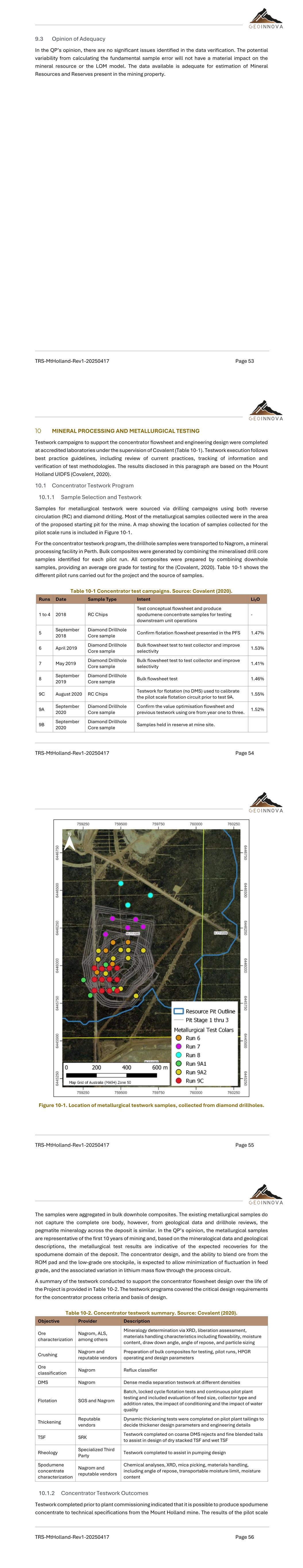 TRS-MTHolland-Rev1-20250417第539.3页QP意见中的充足意见,在数据核查中未发现重大问题。计算基本样本误差产生的潜在可变性不会对矿产资源或LOM模型产生实质性影响。现有数据足以估计采矿财产中存在的矿产资源和储量。TRS-MTHolland-Rev1-20250417第54页支持选矿厂流程图和工程设计的矿物加工和冶金测试测试工作活动在covalent监督下的认可实验室完成(表10-1)。测试工作执行遵循最佳实践指南,包括审查当前实践、跟踪信息和验证测试方法。本段披露的结果基于Mount Holland UIDFS(Covalent,2020)。10.1选矿厂测试工作方案10.1.1冶金测试工作的样品选择和测试工作样品是通过使用反循环(RC)和金刚石钻孔的钻孔活动获得的。采集的大部分冶金样品都在该矿拟建的起始坑区域。图10-1中包含了一张显示为试点规模运行收集的样本位置的地图。对于选矿厂的测试工作计划,钻孔样本被运送到珀斯的矿物加工设施Nagrom。通过结合为每次试点运行确定的矿化钻芯样品,生成了散装复合材料。所有复合材料都是通过结合井下样品制备的,为(Covalent,2020)的测试提供了平均矿石品位。表10-1显示了为该项目进行的不同试点运行和样本来源。表10-1集中器测试活动。资料来源:Covalent(2020)。运行日期样品类型意向Li2O1至42018年RC芯片测试概念流程图并生产用于测试下游单元操作的锂辉石精矿样品-2018年9月5日金刚石钻孔岩心样品确认浮选流程图呈现在PFS中1.47% 2019年4月6日金刚石钻孔岩心样品批量流程图测试以测试收集器并提高选择性1.53% 2019年5月7日金刚石钻孔岩心样品批量流程图测试以测试收集器并提高选择性1.41% 2019年9月8日金刚石钻孔岩心样品批量流程图测试1.46% 9C2020年8月用于浮选(无DMS)的RC芯片测试工作,用于在测试9A之前校准中试规模浮选电路。1.55% 9A2020年9月金刚石钻孔岩心样本确认了价值优化流程表和之前使用第一年至第三年矿石的测试工作。1.52% 9b2020年9月钻石钻孔岩心样本样本在矿点储备持有。TRS-MTHolland-Rev1-20250417第55页图10-1。冶金测试工作样品的位置,从金刚石钻孔中收集。TRS-MTHolland-Rev1-20250417第56页样品在散装井下复合材料中聚合。现有的冶金样品并没有捕捉到完整的矿体,然而,从地质数据和钻孔审查来看,整个矿床的伟晶岩矿物学是相似的。QP认为,冶金样品代表了开采的前10年,根据矿物学数据和地质描述,冶金测试结果表明了该矿床锂辉石区的预期回收率。选矿机设计,以及从ROM焊盘和低品位矿石库存中混合矿石的能力,预计将允许最大限度地减少进料品位的波动,以及通过工艺电路的锂质量流动的相关变化。表10-2提供了在项目生命周期内为支持集中器流程图设计而进行的测试工作的摘要。测试工作方案涵盖了集中器工艺标准和设计基础的关键设计要求。表10-2。集中器测试工作总结。资料来源:Covalent(2020)。目标提供者描述矿石表征Nagrom、ALS,除其他外,通过XRD进行矿物学测定、释放评估、材料处理特性包括流动性、含水率、下拉角、休止角和颗粒大小破碎Nagrom和信誉良好的供应商准备用于测试的散装复合材料、中试运行、HPGR操作和设计参数矿石分类Nagrom回流分类器DMS Nagrom密集介质分离测试工作在不同密度的浮选SGS和Nagrom Batch、锁定循环浮选测试和连续中试工厂测试,包括评估进料大小、收集器类型和添加率, 调理的影响和水质增稠的影响信誉良好的供应商完成了对中试工厂尾矿的动态增稠测试,以确定增稠器设计参数和工程细节TSF SRK测试工作完成了对粗DMS废渣和细混和尾矿的辅助设计,以协助设计干式堆叠TSF和湿式TSF流变学专业第三方测试工作完成,以协助泵送设计锂辉石精矿表征Nagrom和信誉良好的供应商化学分析、XRD、云母采摘、材料处理,包括休止角、可运输湿度限制,水分含量10.1.2选矿厂测试工作结果在工厂调试前完成的测试工作表明,有可能从Mount Holland矿生产符合技术规格的锂辉石精矿。试点规模结果