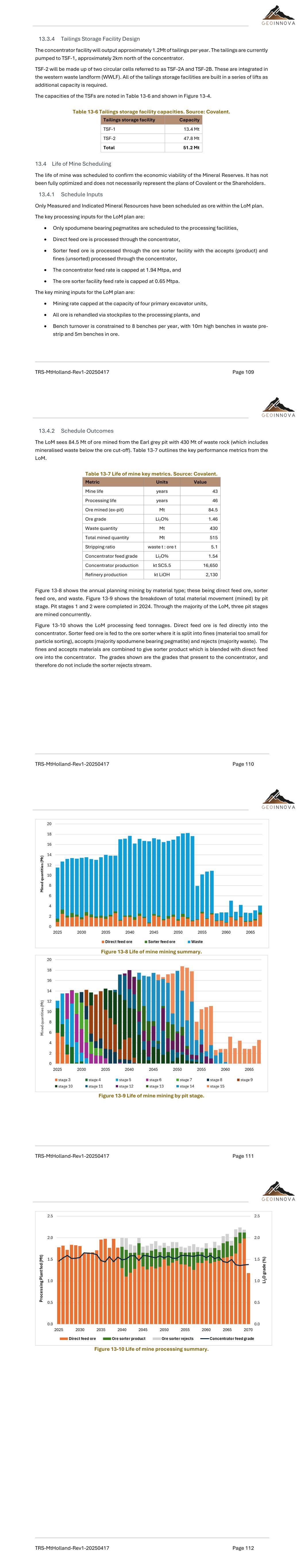 TRS-MTHolland-Rev1-20250417第10913.3.4页尾矿储存设施设计选矿厂设施每年将产出约1.2m的尾矿。尾矿目前被抽到TSF-1,在选矿厂以北约2公里处。TSF-2将由两个圆形单元组成,分别称为TSF-2A和TSF-2B。这些被整合在西部垃圾地貌(WWLF)中。由于需要额外的容量,所有尾矿储存设施都建在一系列升降机中。TSF的容量见表13-6,并见图13-4。表13-6尾矿储存设施容量。资料来源:Covalent。尾矿储存设施容量TSF-1 13.4mt TSF-2 47.8mt总计51.2mt 13.4mine life scheduling the life of mine was scheduled to confirm the economic viability of the mineral reserves。未全面优化,不一定代表共价或股东的方案。13.4.1仅测量和指示矿产资源的计划投入已被安排为LoM计划内的矿石。LoM计划的关键加工投入是:•只有含锂辉石的伟晶岩被安排到加工设施,•直接进料矿石通过选矿厂加工,•分选机进料矿石通过矿石分选机设施加工,接受(产品)和通过选矿厂加工的粉矿(未分选),•选矿机进料速率上限为1.94Mtpa,•矿石分选机设施进料速率上限为0.65Mtpa。LoM计划的关键采矿投入是:•采矿率上限为四台初级挖掘机机组的能力,•所有矿石通过库存重新处理到加工厂,•板凳周转被限制在每年8个板凳,10m高的废料预带板凳和5m的矿石板凳。TRS-MTHolland-Rev1-20250417 page11013.4.2 schedule outcomes The LoM saw 84.5 mt of ore mined from the Earl grey pit with 430 mt of raid rock(which includes mineralized waste below the ore cut-off)。表13-7概述了来自LoM的关键性能指标。表13-7矿山关键指标的寿命。资料来源:Covalent。公制单位价值矿山寿命年限43加工寿命年限46矿石开采(除坑外)MT84.5矿石品位Li2O % 1.46废物量MT430总开采量MT515剥采比废物t:矿石t 5.1选矿厂进料品位Li2O % 1.54选矿厂生产kt SC5.5 16,650炼油厂生产kt LiOH 2,130图13-8显示了按物料类型划分的年度计划开采情况;这些分别是直接进料矿石、分选机进料矿石、废料。图13-9显示了按坑阶段划分的总物质移动(开采)细分。坑口阶段1和2于2024年完成。通过大部分LoM,同时开采三个矿坑阶段。图13-10显示了LoM加工进料吨位。直接给料矿石直接送入选矿厂。分选机给料矿石被送入矿石分选机,在那里它被分解成细粉(材料太小,无法进行颗粒分选),接受(大多数锂辉石含伟晶岩)和废品(大多数废物)。将粉料和验收料合在一起,得到分选机产品,与直接进料矿石混配进入选矿机。显示的等级是呈现给选矿机的等级,因此不包括分选机废料流。TRS-MTHolland-Rev1-20250417第111页图13-8矿山开采寿命汇总。图13-9按矿坑阶段划分的矿山开采寿命。TRS-MTHolland-Rev1-20250417第112页图13-10矿山加工寿命汇总。