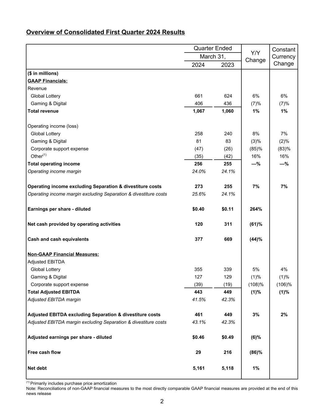 2024年第一季度综合业绩概览季度末Y/Y变动不变货币变动3月31日,20242023(百万美元)GAAP财务:收入环球彩票6616246% 6% Gaming & Digital 406436(7)%(7)%总收入1,0671,0601% 1%营业收入(亏损)环球彩票2582408% 7% Gaming & Digital 8183(3)%(2)%企业支持费用(47)(26)(85)%(83)%其他(1)(35)(42)16% 16%营业总收入256255 —%营业收入利润率24.0% 24.1%营业收入不包括分离和剥离成本2732557% 7%营业收入利润率不包括分离和剥离成本25.6% 24.1%每股收益-稀释0.40美元0.11 264%提供的净现金经营活动120311(61)%现金和现金等价物377669(44)%非GAAP财务指标:调整后EBITDA全球彩票3553395% 4%游戏和数字127129(1)%(1)%企业支持费用(39)(19)(108)%(106)%调整后EBITDA总额443449(1)%(1)%调整后EBITDA利润率41.5% 42.3%调整后EBITDA不包括分离和剥离成本4614493% 2%调整后EBITDA利润率不包括分离和剥离成本43.1% 42.3%调整后每股收益-稀释后0.46美元0.49(6)%自由现金流29216(86)%净债务5,1615,1181%(1)主要包括购买价格摊销注:非GAAP财务指标与最直接本新闻稿末尾提供了可比的GAAP财务指标2