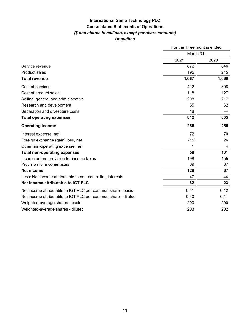 国际游戏科技 PLC截至2024年3月31日止三个月的合并运营报表(美元和股份单位为百万,每股金额除外)2023服务收入872846产品销售195215总收入1,0671,060服务成本412398产品销售成本118127销售、一般和行政208217研发5562分离和剥离成本18 —总营业费用812805营业收入256255利息费用,净额7270外汇(收益)损失,净额(15)26其他营业外费用,净额14营业外支出总额58 101所得税拨备前利润198155所得税拨备6987净收入12867减:归属于非控股权益的净利润4744归属于IGT PLC的净利润8223归属于IGT PLC的每股普通股净利润-基本0.4 10.12归属于IGT PLC的每股普通股净利润-稀释后0.40 0.11加权平均股-基本200200加权平均股-稀释后20320211