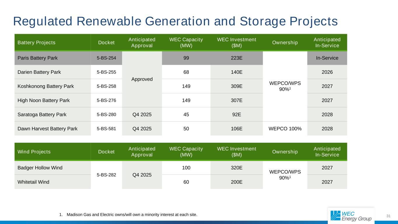 31个电池项目docket预期批准WEC容量(MW)WEC投资($ M)所有权预期在役巴黎电池园5-BS-254批准99 223E WEPCO/WPS 90% 1在役Darien电池园5-BS-25568 140E 2026 Koshkonong电池园5-BS-258149 309E 2027 High Noon Battery Park 5-BS-276 149 307E 2027 Saratoga Battery Park 5-BS-280 Q4 202545 92E 2028 Dawn Harvest Battery Park 5-BS-581 Q4 202550 106E WEPCO 100% 2028受监管的可再生能源发电和存储项目1。Madison Gas and Electric拥有/将拥有每个站点的少数股权。Wind projects docket预期批准WEC容量(MW)WEC投资($ M)所有权预期在役Badger Hollow Wind 5-BS-282 Q4 2025100 320E WEPCO/WPS 90% 12027 Whitetail Wind 60 200E 2027