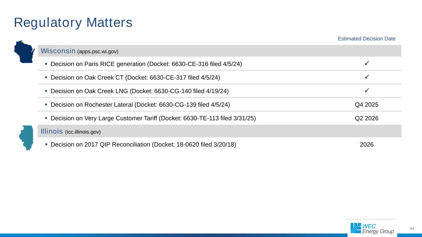 44预计决定日期Wisconsin(apps.psc.wi.gov)Decision on Paris RICE Generation(docket:6630-CE-316 filed 4/5/24)Decision on Oak Creek CT(docket:6630-CE-317 filed 4/5/24)Decision on Oak Creek LNG(docket:6630-CG-140 filed 4/19/24)Decision on Rochester Lateral(docket:6630-CG-139 filed 4/5/24)Q4 2025 Decision on Very Large Customer Tariff(docket:6630-TE-113 filed 3/31/25)Q2 2026 Illinois(icc.illinois.gov)Decision on 2017 QIP Reconc