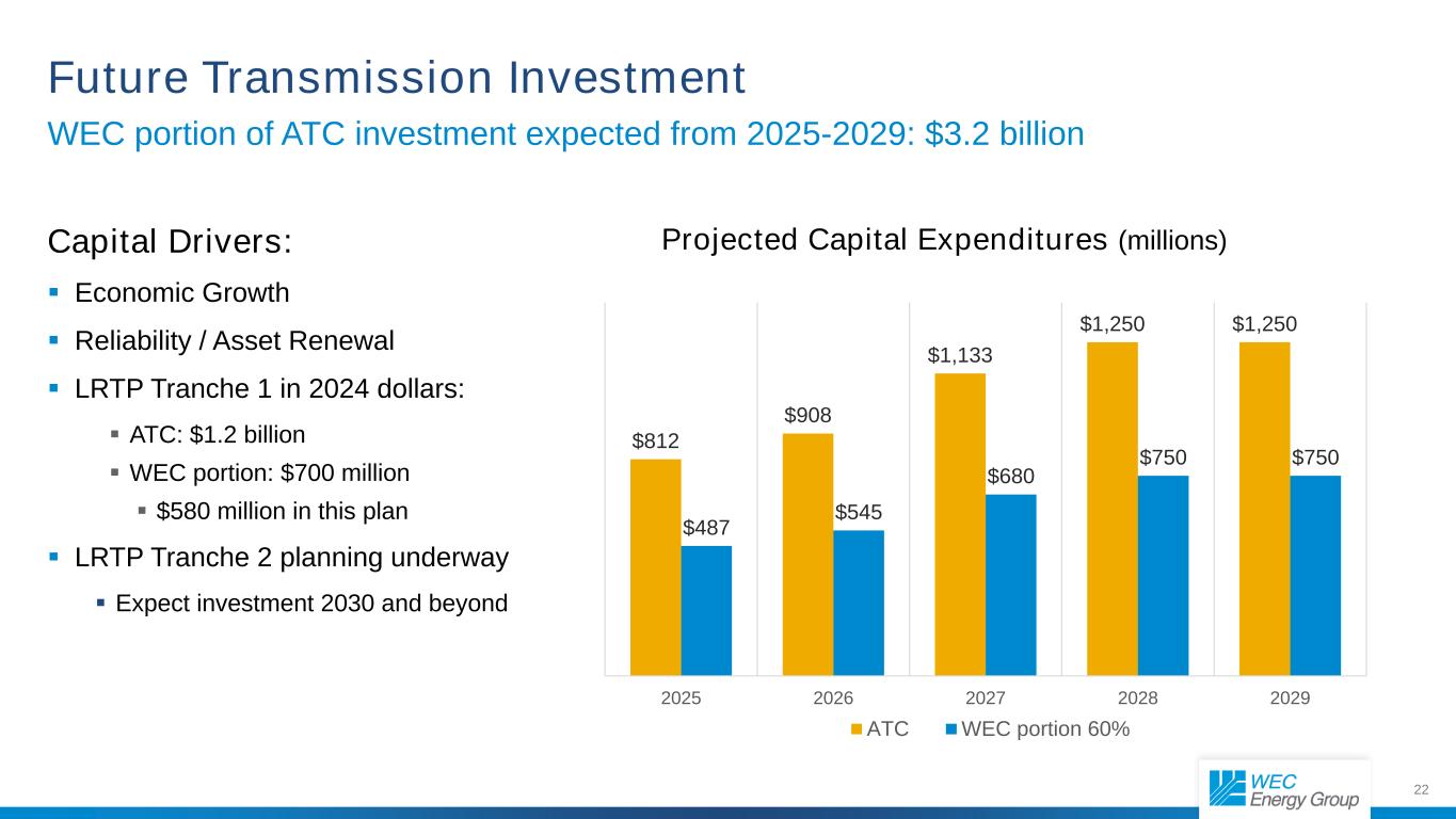 22美元812美元908美元1133美元1250美元1250美元487美元545美元680美元750美元75020252026202720282029年ATC WEC部分预计2025-2029年ATC投资的60% WEC部分:32亿美元未来输电投资资本驱动因素:经济增长可靠性/资产更新2024年LTP第1期:ATC:12亿美元WEC部分:本计划中7亿美元5.8亿美元LRTP第2期规划正在进行中预计投资2030年及以后预计资本支出(百万)