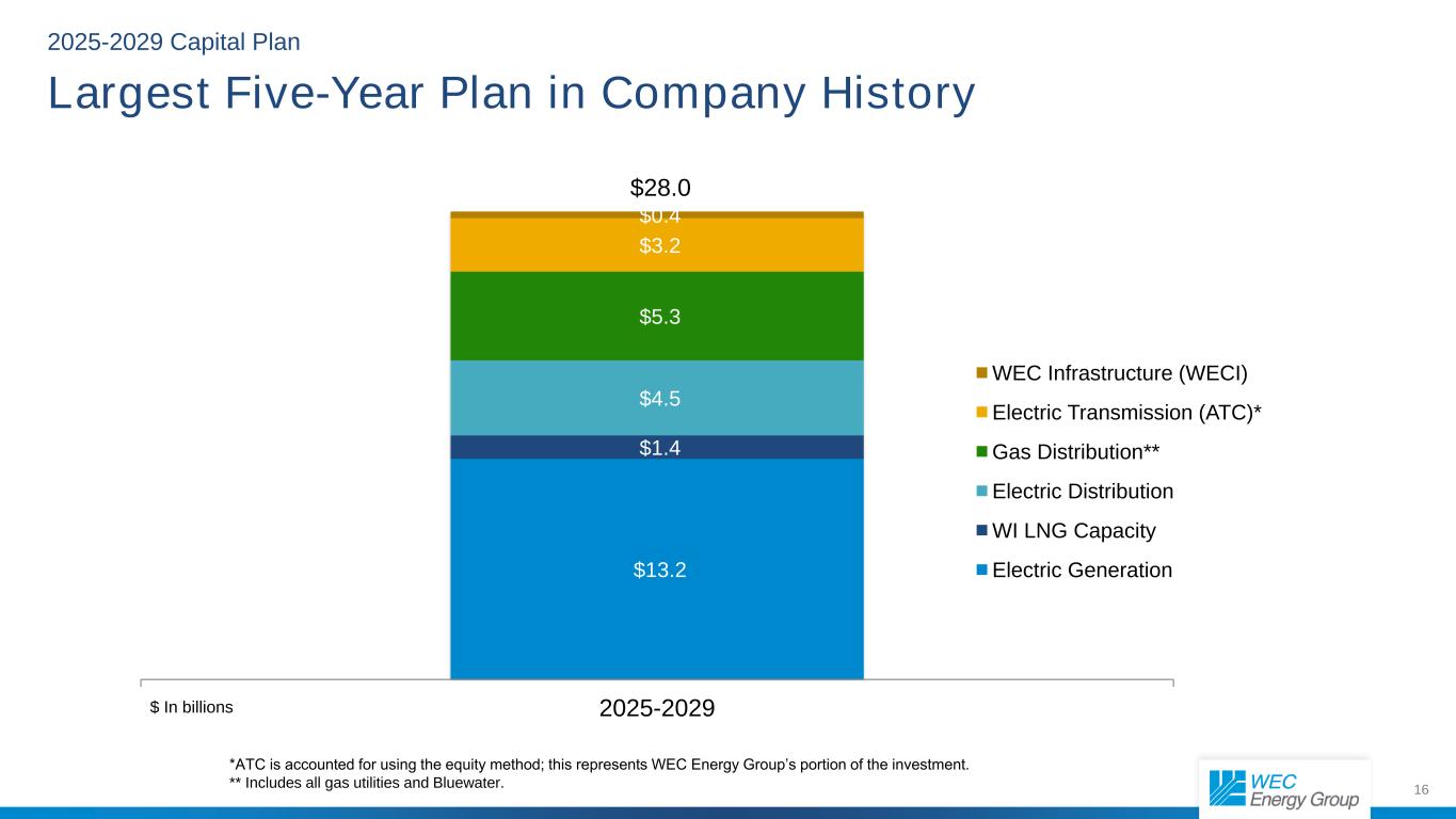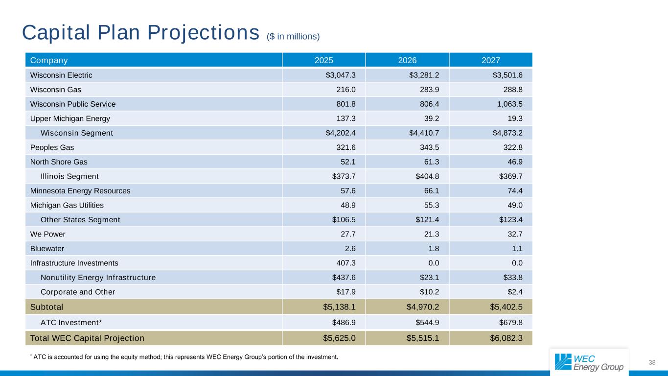 38公司202520262027 Wisconsin Electric $ 3,047.3 $ 3,281.2 $ 3,501.6 Wisconsin Gas 216.02 83.92 88.8 Wisconsin Public Service 801.8806.41,063.5 Upper Michigan Energy 137.339.2 19.3 Wisconsin Segment $ 4,202.4 $ 4,410.7 $ 4,873.2 Peoples Gas 321.63 43.53 22.8 North Shore Gas 52.16 1.346.9 Illinois Segment $ 373.7 $ 404.8 $ 369.7 Minnesota Energy Resources 57.666.17 4.4 Michigan Gas Utilities 48.9 55.3 49.0 Other States Segment $ 106.5 $ 121.4 $ 123.4 We Power 27.72 1.33 2.7 Blu及其他$ 17.9 $ 10.2 $ 2.4小计$ 5,138.1 $ 4,970.2 $ 5,402.5 ATC投资*486.9美元544.9美元679.8美元WEC资本预测总额5,625.0美元5,515.1美元6,082.3美元资本计划预测(百万美元)*ATC采用权益法核算;这代表WEC能源集团的投资部分。